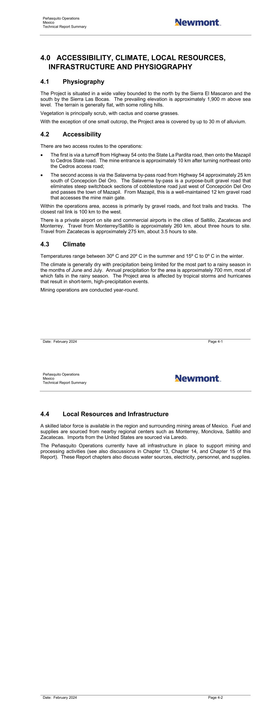Peñasquito Operations Mexico Technical Report Summary Date: February 2024 Page 4-1 4.0 ACCESSIBILITY, CLIMATE, LOCAL RESOURCES, INFRASTRUCTURE AND PHYSIOGRAPHY 4.1 Physiography The Project is situated in a wide valley bounded to the north by the Sierra El Mascaron and the south by the Sierra Las Bocas. The prevailing elevation is approximately 1,900 m above sea level. The terrain is generally flat, with some rolling hills. Vegetation is principally scrub, with cactus and coarse grasses. With the exception of one small outcrop, the Project area is covered by up to 30 m of alluvium. 4.2 Accessibility There are two access routes to the operations: • The first is via a turnoff from Highway 54 onto the State La Pardita road, then onto the Mazapil to Cedros State road. The mine entrance is approximately 10 km after turning northeast onto the Cedros access road; • The second access is via the Salaverna by-pass road from Highway 54 approximately 25 km south of Concepcion Del Oro. The Salaverna by-pass is a purpose-built gravel road that eliminates steep switchback sections of cobblestone road just west of Concepción Del Oro and passes the town of Mazapil. From Mazapil, this is a well-maintained 12 km gravel road that accesses the mine main gate. Within the operations area, access is primarily by gravel roads, and foot trails and tracks. The closest rail link is 100 km to the west. There is a private airport on site and commercial airports in the cities of Saltillo, Zacatecas and Monterrey. Travel from Monterrey/Saltillo is approximately 260 km, about three hours to site. Travel from Zacatecas is approximately 275 km, about 3.5 hours to site. 4.3 Climate Temperatures range between 30º C and 20º C in the summer and 15º C to 0º C in the winter. The climate is generally dry with precipitation being limited for the most part to a rainy season in the months of June and July. Annual precipitation for the area is approximately 700 mm, most of which falls in the rainy season. The Project area is affected by tropical storms and hurricanes that result in short-term, high-precipitation events. Mining operations are conducted year-round. Peñasquito Operations Mexico Technical Report Summary Date: February 2024 Page 4-2 4.4 Local Resources and Infrastructure A skilled labor force is available in the region and surrounding mining areas of Mexico. Fuel and supplies are sourced from nearby regional centers such as Monterrey, Monclova, Saltillo and Zacatecas. Imports from the United States are sourced via Laredo. The Peñasquito Operations currently have all infrastructure in place to support mining and processing activities (see also discussions in Chapter 13, Chapter 14, and Chapter 15 of this Report). These Report chapters also discuss water sources, electricity, personnel, and supplies.
