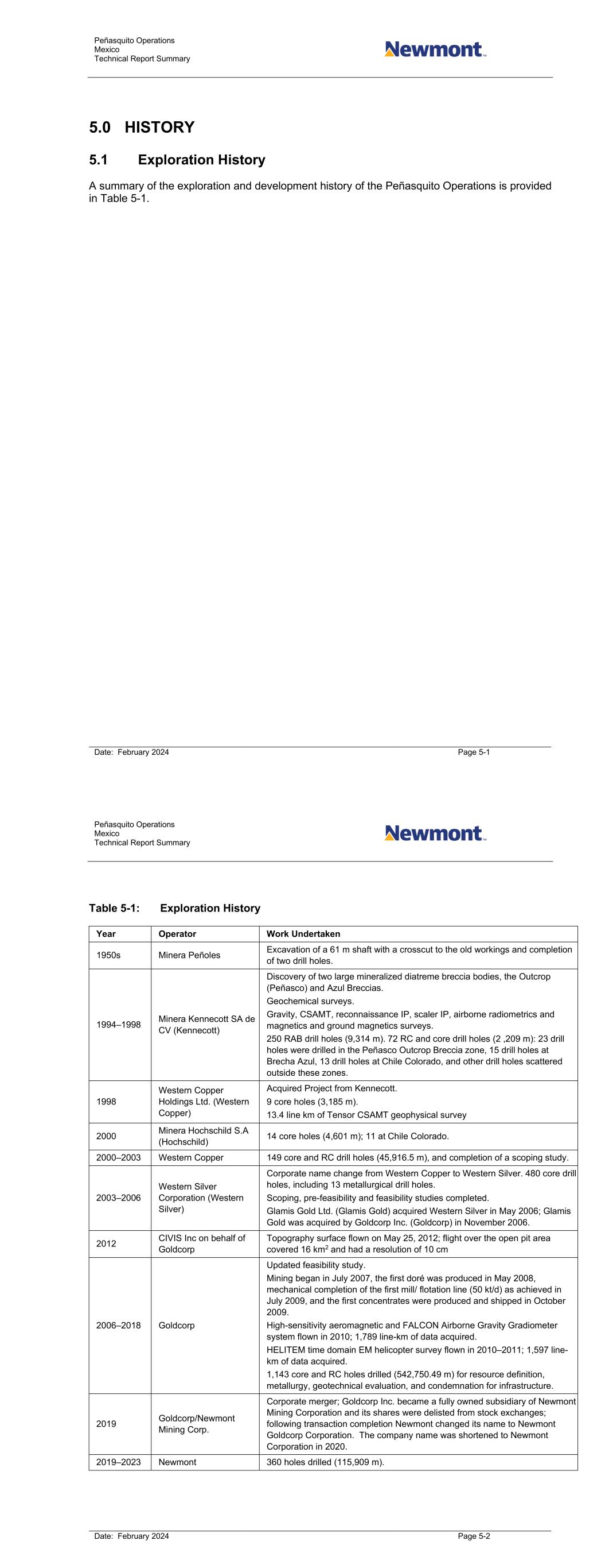 Peñasquito Operations Mexico Technical Report Summary Date: February 2024 Page 5-1 5.0 HISTORY 5.1 Exploration History A summary of the exploration and development history of the Peñasquito Operations is provided in Table 5-1. Peñasquito Operations Mexico Technical Report Summary Date: February 2024 Page 5-2 Table 5-1: Exploration History Year Operator Work Undertaken 1950s Minera Peñoles Excavation of a 61 m shaft with a crosscut to the old workings and completion of two drill holes. 1994–1998 Minera Kennecott SA de CV (Kennecott) Discovery of two large mineralized diatreme breccia bodies, the Outcrop (Peñasco) and Azul Breccias. Geochemical surveys. Gravity, CSAMT, reconnaissance IP, scaler IP, airborne radiometrics and magnetics and ground magnetics surveys. 250 RAB drill holes (9,314 m). 72 RC and core drill holes (2 ,209 m): 23 drill holes were drilled in the Peñasco Outcrop Breccia zone, 15 drill holes at Brecha Azul, 13 drill holes at Chile Colorado, and other drill holes scattered outside these zones. 1998 Western Copper Holdings Ltd. (Western Copper) Acquired Project from Kennecott. 9 core holes (3,185 m). 13.4 line km of Tensor CSAMT geophysical survey 2000 Minera Hochschild S.A (Hochschild) 14 core holes (4,601 m); 11 at Chile Colorado. 2000–2003 Western Copper 149 core and RC drill holes (45,916.5 m), and completion of a scoping study. 2003–2006 Western Silver Corporation (Western Silver) Corporate name change from Western Copper to Western Silver. 480 core drill holes, including 13 metallurgical drill holes. Scoping, pre-feasibility and feasibility studies completed. Glamis Gold Ltd. (Glamis Gold) acquired Western Silver in May 2006; Glamis Gold was acquired by Goldcorp Inc. (Goldcorp) in November 2006. 2012 CIVIS Inc on behalf of Goldcorp Topography surface flown on May 25, 2012; flight over the open pit area covered 16 km2 and had a resolution of 10 cm 2006–2018 Goldcorp Updated feasibility study. Mining began in July 2007, the first doré was produced in May 2008, mechanical completion of the first mill/ flotation line (50 kt/d) as achieved in July 2009, and the first concentrates were produced and shipped in October 2009. High-sensitivity aeromagnetic and FALCON Airborne Gravity Gradiometer system flown in 2010; 1,789 line-km of data acquired. HELITEM time domain EM helicopter survey flown in 2010–2011; 1,597 line- km of data acquired. 1,143 core and RC holes drilled (542,750.49 m) for resource definition, metallurgy, geotechnical evaluation, and condemnation for infrastructure. 2019 Goldcorp/Newmont Mining Corp. Corporate merger; Goldcorp Inc. became a fully owned subsidiary of Newmont Mining Corporation and its shares were delisted from stock exchanges; following transaction completion Newmont changed its name to Newmont Goldcorp Corporation. The company name was shortened to Newmont Corporation in 2020. 2019–2023 Newmont 360 holes drilled (115,909 m).