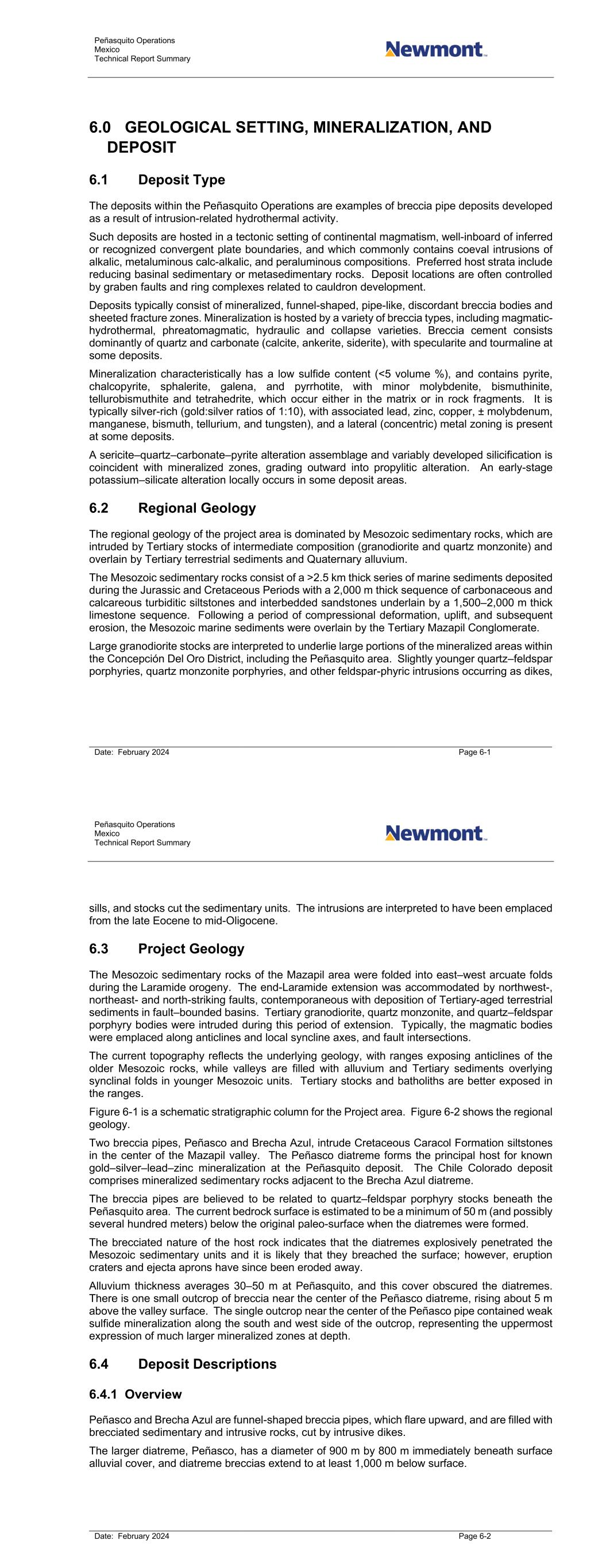 Peñasquito Operations Mexico Technical Report Summary Date: February 2024 Page 6-1 6.0 GEOLOGICAL SETTING, MINERALIZATION, AND DEPOSIT 6.1 Deposit Type The deposits within the Peñasquito Operations are examples of breccia pipe deposits developed as a result of intrusion-related hydrothermal activity. Such deposits are hosted in a tectonic setting of continental magmatism, well-inboard of inferred or recognized convergent plate boundaries, and which commonly contains coeval intrusions of alkalic, metaluminous calc-alkalic, and peraluminous compositions. Preferred host strata include reducing basinal sedimentary or metasedimentary rocks. Deposit locations are often controlled by graben faults and ring complexes related to cauldron development. Deposits typically consist of mineralized, funnel-shaped, pipe-like, discordant breccia bodies and sheeted fracture zones. Mineralization is hosted by a variety of breccia types, including magmatic- hydrothermal, phreatomagmatic, hydraulic and collapse varieties. Breccia cement consists dominantly of quartz and carbonate (calcite, ankerite, siderite), with specularite and tourmaline at some deposits. Mineralization characteristically has a low sulfide content (<5 volume %), and contains pyrite, chalcopyrite, sphalerite, galena, and pyrrhotite, with minor molybdenite, bismuthinite, tellurobismuthite and tetrahedrite, which occur either in the matrix or in rock fragments. It is typically silver-rich (gold:silver ratios of 1:10), with associated lead, zinc, copper, ± molybdenum, manganese, bismuth, tellurium, and tungsten), and a lateral (concentric) metal zoning is present at some deposits. A sericite–quartz–carbonate–pyrite alteration assemblage and variably developed silicification is coincident with mineralized zones, grading outward into propylitic alteration. An early-stage potassium–silicate alteration locally occurs in some deposit areas. 6.2 Regional Geology The regional geology of the project area is dominated by Mesozoic sedimentary rocks, which are intruded by Tertiary stocks of intermediate composition (granodiorite and quartz monzonite) and overlain by Tertiary terrestrial sediments and Quaternary alluvium. The Mesozoic sedimentary rocks consist of a >2.5 km thick series of marine sediments deposited during the Jurassic and Cretaceous Periods with a 2,000 m thick sequence of carbonaceous and calcareous turbiditic siltstones and interbedded sandstones underlain by a 1,500–2,000 m thick limestone sequence. Following a period of compressional deformation, uplift, and subsequent erosion, the Mesozoic marine sediments were overlain by the Tertiary Mazapil Conglomerate. Large granodiorite stocks are interpreted to underlie large portions of the mineralized areas within the Concepción Del Oro District, including the Peñasquito area. Slightly younger quartz–feldspar porphyries, quartz monzonite porphyries, and other feldspar-phyric intrusions occurring as dikes, Peñasquito Operations Mexico Technical Report Summary Date: February 2024 Page 6-2 sills, and stocks cut the sedimentary units. The intrusions are interpreted to have been emplaced from the late Eocene to mid-Oligocene. 6.3 Project Geology The Mesozoic sedimentary rocks of the Mazapil area were folded into east–west arcuate folds during the Laramide orogeny. The end-Laramide extension was accommodated by northwest-, northeast- and north-striking faults, contemporaneous with deposition of Tertiary-aged terrestrial sediments in fault–bounded basins. Tertiary granodiorite, quartz monzonite, and quartz–feldspar porphyry bodies were intruded during this period of extension. Typically, the magmatic bodies were emplaced along anticlines and local syncline axes, and fault intersections. The current topography reflects the underlying geology, with ranges exposing anticlines of the older Mesozoic rocks, while valleys are filled with alluvium and Tertiary sediments overlying synclinal folds in younger Mesozoic units. Tertiary stocks and batholiths are better exposed in the ranges. Figure 6-1 is a schematic stratigraphic column for the Project area. Figure 6-2 shows the regional geology. Two breccia pipes, Peñasco and Brecha Azul, intrude Cretaceous Caracol Formation siltstones in the center of the Mazapil valley. The Peñasco diatreme forms the principal host for known gold–silver–lead–zinc mineralization at the Peñasquito deposit. The Chile Colorado deposit comprises mineralized sedimentary rocks adjacent to the Brecha Azul diatreme. The breccia pipes are believed to be related to quartz–feldspar porphyry stocks beneath the Peñasquito area. The current bedrock surface is estimated to be a minimum of 50 m (and possibly several hundred meters) below the original paleo-surface when the diatremes were formed. The brecciated nature of the host rock indicates that the diatremes explosively penetrated the Mesozoic sedimentary units and it is likely that they breached the surface; however, eruption craters and ejecta aprons have since been eroded away. Alluvium thickness averages 30–50 m at Peñasquito, and this cover obscured the diatremes. There is one small outcrop of breccia near the center of the Peñasco diatreme, rising about 5 m above the valley surface. The single outcrop near the center of the Peñasco pipe contained weak sulfide mineralization along the south and west side of the outcrop, representing the uppermost expression of much larger mineralized zones at depth. 6.4 Deposit Descriptions 6.4.1 Overview Peñasco and Brecha Azul are funnel-shaped breccia pipes, which flare upward, and are filled with brecciated sedimentary and intrusive rocks, cut by intrusive dikes. The larger diatreme, Peñasco, has a diameter of 900 m by 800 m immediately beneath surface alluvial cover, and diatreme breccias extend to at least 1,000 m below surface.