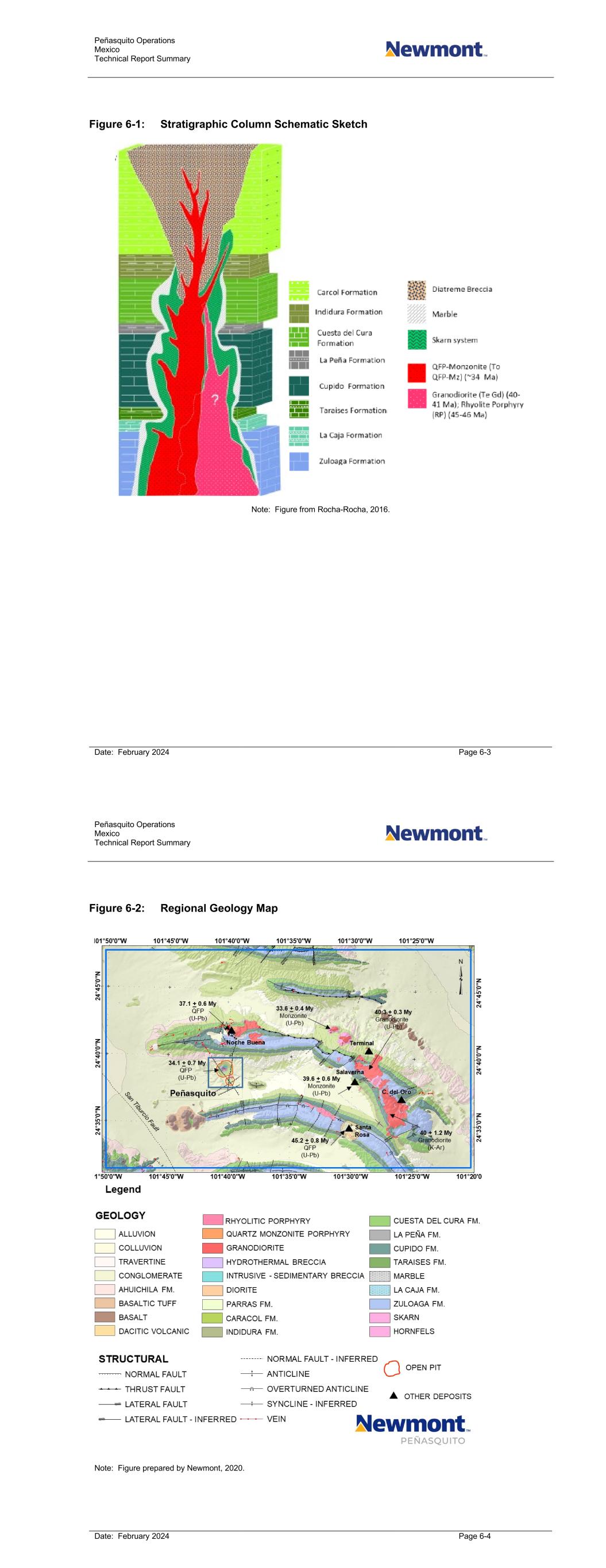 Peñasquito Operations Mexico Technical Report Summary Date: February 2024 Page 6-3 Figure 6-1: Stratigraphic Column Schematic Sketch Note: Figure from Rocha-Rocha, 2016. Peñasquito Operations Mexico Technical Report Summary Date: February 2024 Page 6-4 Figure 6-2: Regional Geology Map Note: Figure prepared by Newmont, 2020.