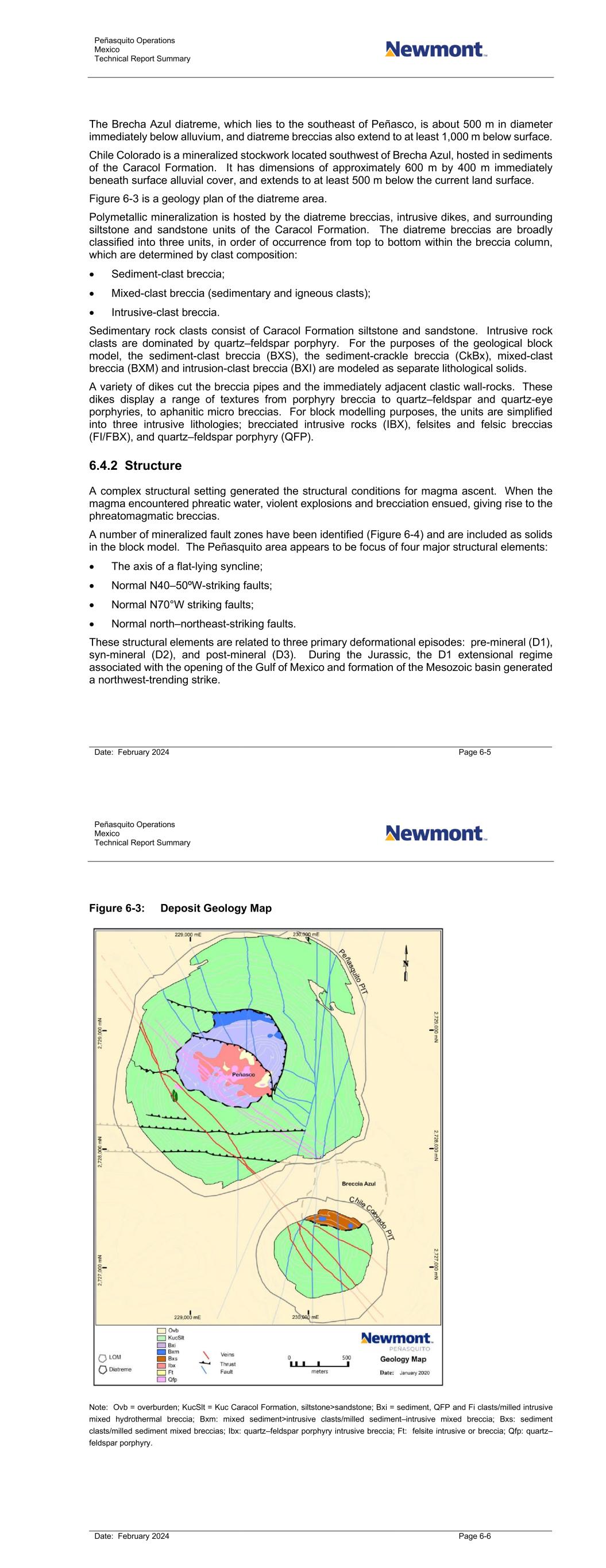 Peñasquito Operations Mexico Technical Report Summary Date: February 2024 Page 6-5 The Brecha Azul diatreme, which lies to the southeast of Peñasco, is about 500 m in diameter immediately below alluvium, and diatreme breccias also extend to at least 1,000 m below surface. Chile Colorado is a mineralized stockwork located southwest of Brecha Azul, hosted in sediments of the Caracol Formation. It has dimensions of approximately 600 m by 400 m immediately beneath surface alluvial cover, and extends to at least 500 m below the current land surface. Figure 6-3 is a geology plan of the diatreme area. Polymetallic mineralization is hosted by the diatreme breccias, intrusive dikes, and surrounding siltstone and sandstone units of the Caracol Formation. The diatreme breccias are broadly classified into three units, in order of occurrence from top to bottom within the breccia column, which are determined by clast composition: • Sediment-clast breccia; • Mixed-clast breccia (sedimentary and igneous clasts); • Intrusive-clast breccia. Sedimentary rock clasts consist of Caracol Formation siltstone and sandstone. Intrusive rock clasts are dominated by quartz–feldspar porphyry. For the purposes of the geological block model, the sediment-clast breccia (BXS), the sediment-crackle breccia (CkBx), mixed-clast breccia (BXM) and intrusion-clast breccia (BXI) are modeled as separate lithological solids. A variety of dikes cut the breccia pipes and the immediately adjacent clastic wall-rocks. These dikes display a range of textures from porphyry breccia to quartz–feldspar and quartz-eye porphyries, to aphanitic micro breccias. For block modelling purposes, the units are simplified into three intrusive lithologies; brecciated intrusive rocks (IBX), felsites and felsic breccias (FI/FBX), and quartz–feldspar porphyry (QFP). 6.4.2 Structure A complex structural setting generated the structural conditions for magma ascent. When the magma encountered phreatic water, violent explosions and brecciation ensued, giving rise to the phreatomagmatic breccias. A number of mineralized fault zones have been identified (Figure 6-4) and are included as solids in the block model. The Peñasquito area appears to be focus of four major structural elements: • The axis of a flat-lying syncline; • Normal N40–50ºW-striking faults; • Normal N70°W striking faults; • Normal north–northeast-striking faults. These structural elements are related to three primary deformational episodes: pre-mineral (D1), syn-mineral (D2), and post-mineral (D3). During the Jurassic, the D1 extensional regime associated with the opening of the Gulf of Mexico and formation of the Mesozoic basin generated a northwest-trending strike. Peñasquito Operations Mexico Technical Report Summary Date: February 2024 Page 6-6 Figure 6-3: Deposit Geology Map Note: Ovb = overburden; KucSlt = Kuc Caracol Formation, siltstone>sandstone; Bxi = sediment, QFP and Fi clasts/milled intrusive mixed hydrothermal breccia; Bxm: mixed sediment>intrusive clasts/milled sediment–intrusive mixed breccia; Bxs: sediment clasts/milled sediment mixed breccias; Ibx: quartz–feldspar porphyry intrusive breccia; Ft: felsite intrusive or breccia; Qfp: quartz– feldspar porphyry.
