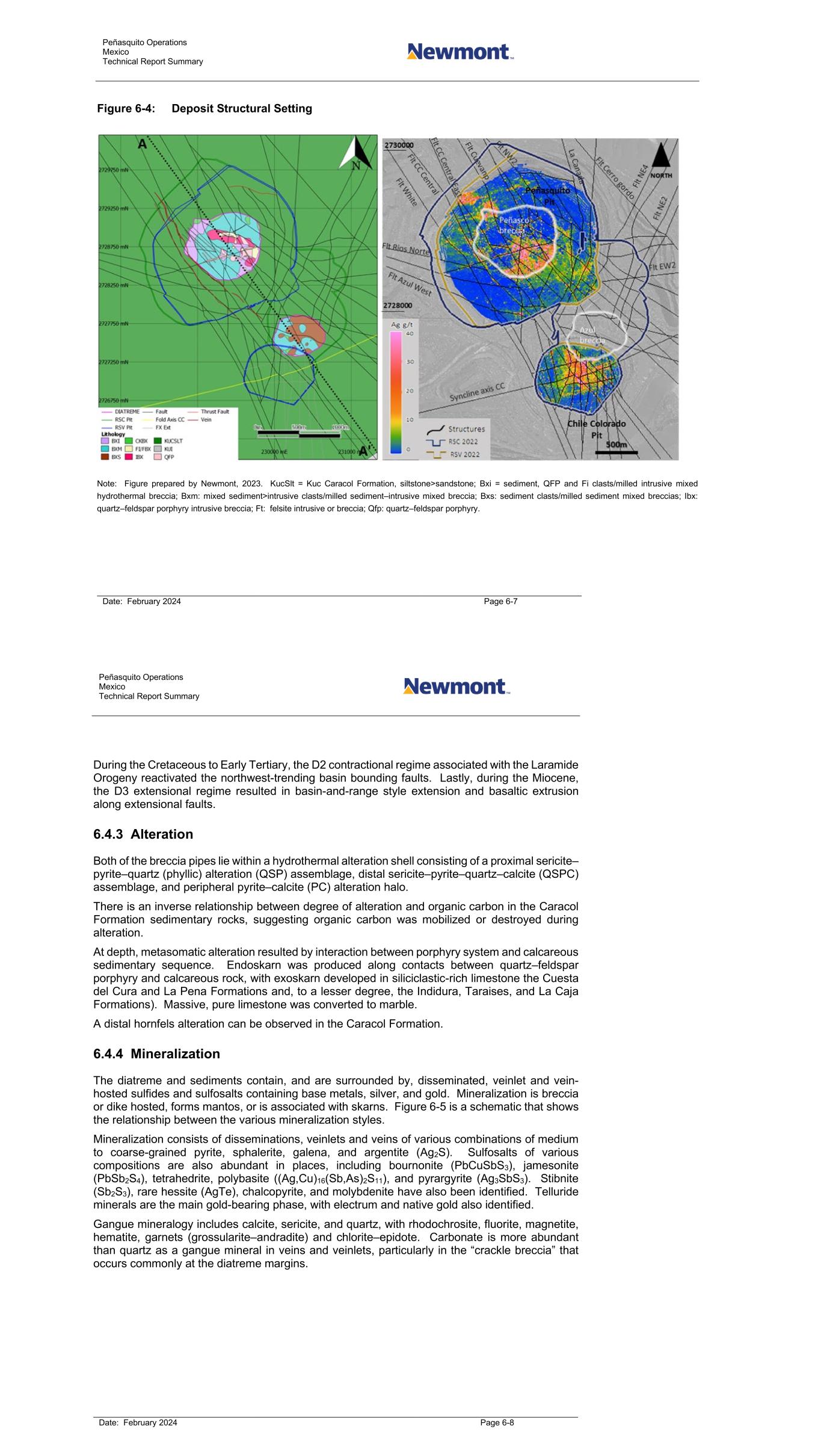 Peñasquito Operations Mexico Technical Report Summary Date: February 2024 Page 6-7 Figure 6-4: Deposit Structural Setting Note: Figure prepared by Newmont, 2023. KucSlt = Kuc Caracol Formation, siltstone>sandstone; Bxi = sediment, QFP and Fi clasts/milled intrusive mixed hydrothermal breccia; Bxm: mixed sediment>intrusive clasts/milled sediment–intrusive mixed breccia; Bxs: sediment clasts/milled sediment mixed breccias; Ibx: quartz–feldspar porphyry intrusive breccia; Ft: felsite intrusive or breccia; Qfp: quartz–feldspar porphyry. Peñasquito Operations Mexico Technical Report Summary Date: February 2024 Page 6-8 During the Cretaceous to Early Tertiary, the D2 contractional regime associated with the Laramide Orogeny reactivated the northwest-trending basin bounding faults. Lastly, during the Miocene, the D3 extensional regime resulted in basin-and-range style extension and basaltic extrusion along extensional faults. 6.4.3 Alteration Both of the breccia pipes lie within a hydrothermal alteration shell consisting of a proximal sericite– pyrite–quartz (phyllic) alteration (QSP) assemblage, distal sericite–pyrite–quartz–calcite (QSPC) assemblage, and peripheral pyrite–calcite (PC) alteration halo. There is an inverse relationship between degree of alteration and organic carbon in the Caracol Formation sedimentary rocks, suggesting organic carbon was mobilized or destroyed during alteration. At depth, metasomatic alteration resulted by interaction between porphyry system and calcareous sedimentary sequence. Endoskarn was produced along contacts between quartz–feldspar porphyry and calcareous rock, with exoskarn developed in siliciclastic-rich limestone the Cuesta del Cura and La Pena Formations and, to a lesser degree, the Indidura, Taraises, and La Caja Formations). Massive, pure limestone was converted to marble. A distal hornfels alteration can be observed in the Caracol Formation. 6.4.4 Mineralization The diatreme and sediments contain, and are surrounded by, disseminated, veinlet and vein- hosted sulfides and sulfosalts containing base metals, silver, and gold. Mineralization is breccia or dike hosted, forms mantos, or is associated with skarns. Figure 6-5 is a schematic that shows the relationship between the various mineralization styles. Mineralization consists of disseminations, veinlets and veins of various combinations of medium to coarse-grained pyrite, sphalerite, galena, and argentite (Ag2S). Sulfosalts of various compositions are also abundant in places, including bournonite (PbCuSbS3), jamesonite (PbSb2S4), tetrahedrite, polybasite ((Ag,Cu)16(Sb,As)2S11), and pyrargyrite (Ag3SbS3). Stibnite (Sb2S3), rare hessite (AgTe), chalcopyrite, and molybdenite have also been identified. Telluride minerals are the main gold-bearing phase, with electrum and native gold also identified. Gangue mineralogy includes calcite, sericite, and quartz, with rhodochrosite, fluorite, magnetite, hematite, garnets (grossularite–andradite) and chlorite–epidote. Carbonate is more abundant than quartz as a gangue mineral in veins and veinlets, particularly in the “crackle breccia” that occurs commonly at the diatreme margins.