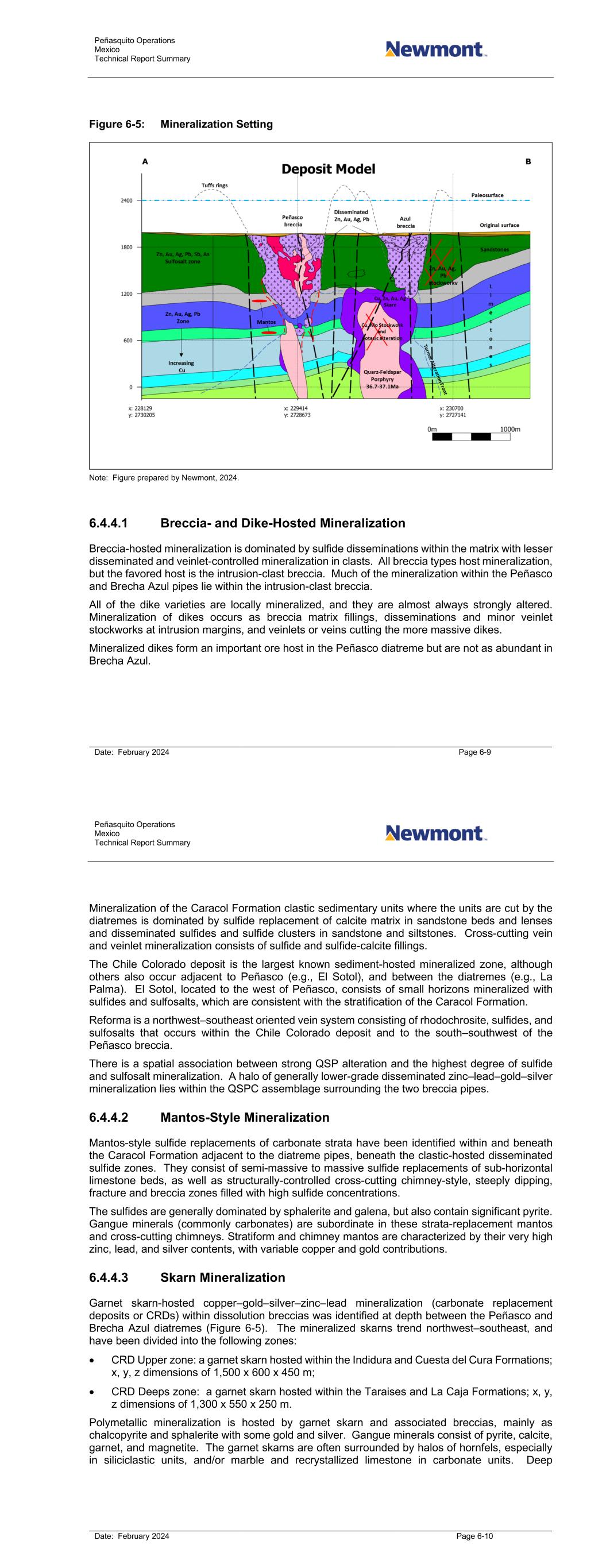 Peñasquito Operations Mexico Technical Report Summary Date: February 2024 Page 6-9 Figure 6-5: Mineralization Setting Note: Figure prepared by Newmont, 2024. 6.4.4.1 Breccia- and Dike-Hosted Mineralization Breccia-hosted mineralization is dominated by sulfide disseminations within the matrix with lesser disseminated and veinlet-controlled mineralization in clasts. All breccia types host mineralization, but the favored host is the intrusion-clast breccia. Much of the mineralization within the Peñasco and Brecha Azul pipes lie within the intrusion-clast breccia. All of the dike varieties are locally mineralized, and they are almost always strongly altered. Mineralization of dikes occurs as breccia matrix fillings, disseminations and minor veinlet stockworks at intrusion margins, and veinlets or veins cutting the more massive dikes. Mineralized dikes form an important ore host in the Peñasco diatreme but are not as abundant in Brecha Azul. Peñasquito Operations Mexico Technical Report Summary Date: February 2024 Page 6-10 Mineralization of the Caracol Formation clastic sedimentary units where the units are cut by the diatremes is dominated by sulfide replacement of calcite matrix in sandstone beds and lenses and disseminated sulfides and sulfide clusters in sandstone and siltstones. Cross-cutting vein and veinlet mineralization consists of sulfide and sulfide-calcite fillings. The Chile Colorado deposit is the largest known sediment-hosted mineralized zone, although others also occur adjacent to Peñasco (e.g., El Sotol), and between the diatremes (e.g., La Palma). El Sotol, located to the west of Peñasco, consists of small horizons mineralized with sulfides and sulfosalts, which are consistent with the stratification of the Caracol Formation. Reforma is a northwest–southeast oriented vein system consisting of rhodochrosite, sulfides, and sulfosalts that occurs within the Chile Colorado deposit and to the south–southwest of the Peñasco breccia. There is a spatial association between strong QSP alteration and the highest degree of sulfide and sulfosalt mineralization. A halo of generally lower-grade disseminated zinc–lead–gold–silver mineralization lies within the QSPC assemblage surrounding the two breccia pipes. 6.4.4.2 Mantos-Style Mineralization Mantos-style sulfide replacements of carbonate strata have been identified within and beneath the Caracol Formation adjacent to the diatreme pipes, beneath the clastic-hosted disseminated sulfide zones. They consist of semi-massive to massive sulfide replacements of sub-horizontal limestone beds, as well as structurally-controlled cross-cutting chimney-style, steeply dipping, fracture and breccia zones filled with high sulfide concentrations. The sulfides are generally dominated by sphalerite and galena, but also contain significant pyrite. Gangue minerals (commonly carbonates) are subordinate in these strata-replacement mantos and cross-cutting chimneys. Stratiform and chimney mantos are characterized by their very high zinc, lead, and silver contents, with variable copper and gold contributions. 6.4.4.3 Skarn Mineralization Garnet skarn-hosted copper–gold–silver–zinc–lead mineralization (carbonate replacement deposits or CRDs) within dissolution breccias was identified at depth between the Peñasco and Brecha Azul diatremes (Figure 6-5). The mineralized skarns trend northwest–southeast, and have been divided into the following zones: • CRD Upper zone: a garnet skarn hosted within the Indidura and Cuesta del Cura Formations; x, y, z dimensions of 1,500 x 600 x 450 m; • CRD Deeps zone: a garnet skarn hosted within the Taraises and La Caja Formations; x, y, z dimensions of 1,300 x 550 x 250 m. Polymetallic mineralization is hosted by garnet skarn and associated breccias, mainly as chalcopyrite and sphalerite with some gold and silver. Gangue minerals consist of pyrite, calcite, garnet, and magnetite. The garnet skarns are often surrounded by halos of hornfels, especially in siliciclastic units, and/or marble and recrystallized limestone in carbonate units. Deep