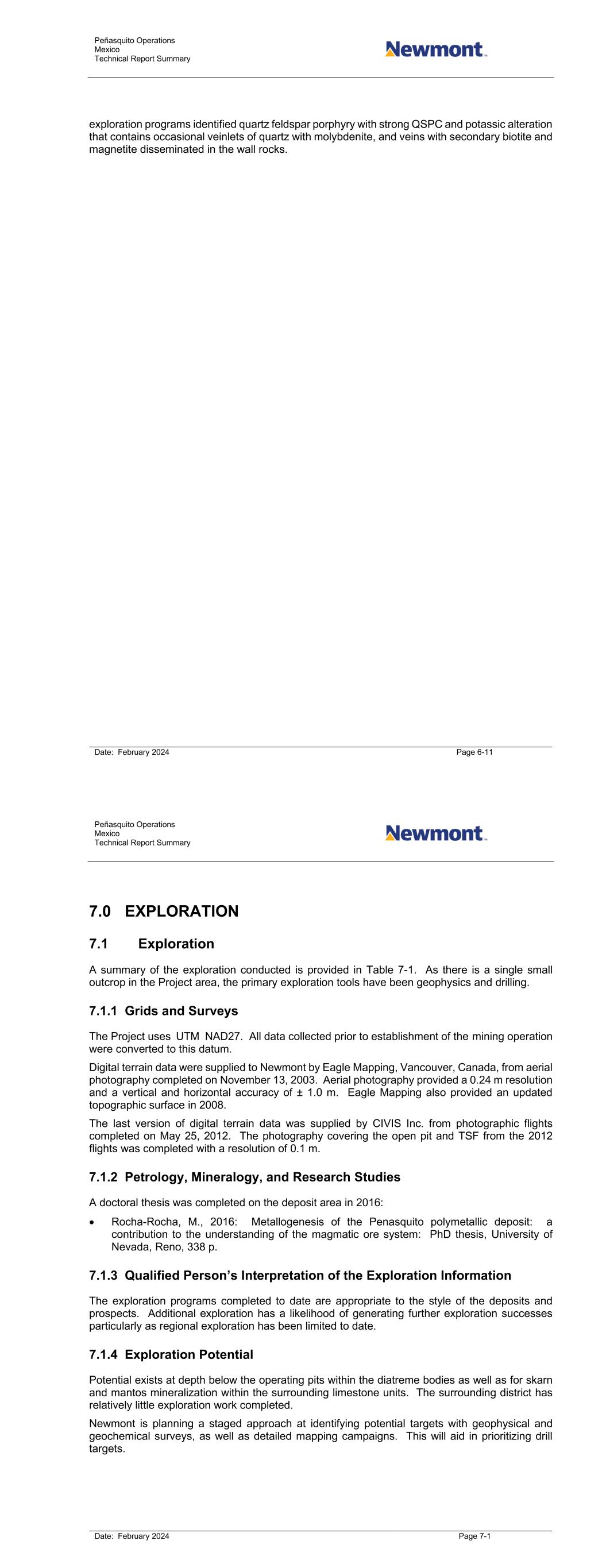Peñasquito Operations Mexico Technical Report Summary Date: February 2024 Page 6-11 exploration programs identified quartz feldspar porphyry with strong QSPC and potassic alteration that contains occasional veinlets of quartz with molybdenite, and veins with secondary biotite and magnetite disseminated in the wall rocks. Peñasquito Operations Mexico Technical Report Summary Date: February 2024 Page 7-1 7.0 EXPLORATION 7.1 Exploration A summary of the exploration conducted is provided in Table 7-1. As there is a single small outcrop in the Project area, the primary exploration tools have been geophysics and drilling. 7.1.1 Grids and Surveys The Project uses UTM NAD27. All data collected prior to establishment of the mining operation were converted to this datum. Digital terrain data were supplied to Newmont by Eagle Mapping, Vancouver, Canada, from aerial photography completed on November 13, 2003. Aerial photography provided a 0.24 m resolution and a vertical and horizontal accuracy of ± 1.0 m. Eagle Mapping also provided an updated topographic surface in 2008. The last version of digital terrain data was supplied by CIVIS Inc. from photographic flights completed on May 25, 2012. The photography covering the open pit and TSF from the 2012 flights was completed with a resolution of 0.1 m. 7.1.2 Petrology, Mineralogy, and Research Studies A doctoral thesis was completed on the deposit area in 2016: • Rocha-Rocha, M., 2016: Metallogenesis of the Penasquito polymetallic deposit: a contribution to the understanding of the magmatic ore system: PhD thesis, University of Nevada, Reno, 338 p. 7.1.3 Qualified Person’s Interpretation of the Exploration Information The exploration programs completed to date are appropriate to the style of the deposits and prospects. Additional exploration has a likelihood of generating further exploration successes particularly as regional exploration has been limited to date. 7.1.4 Exploration Potential Potential exists at depth below the operating pits within the diatreme bodies as well as for skarn and mantos mineralization within the surrounding limestone units. The surrounding district has relatively little exploration work completed. Newmont is planning a staged approach at identifying potential targets with geophysical and geochemical surveys, as well as detailed mapping campaigns. This will aid in prioritizing drill targets.