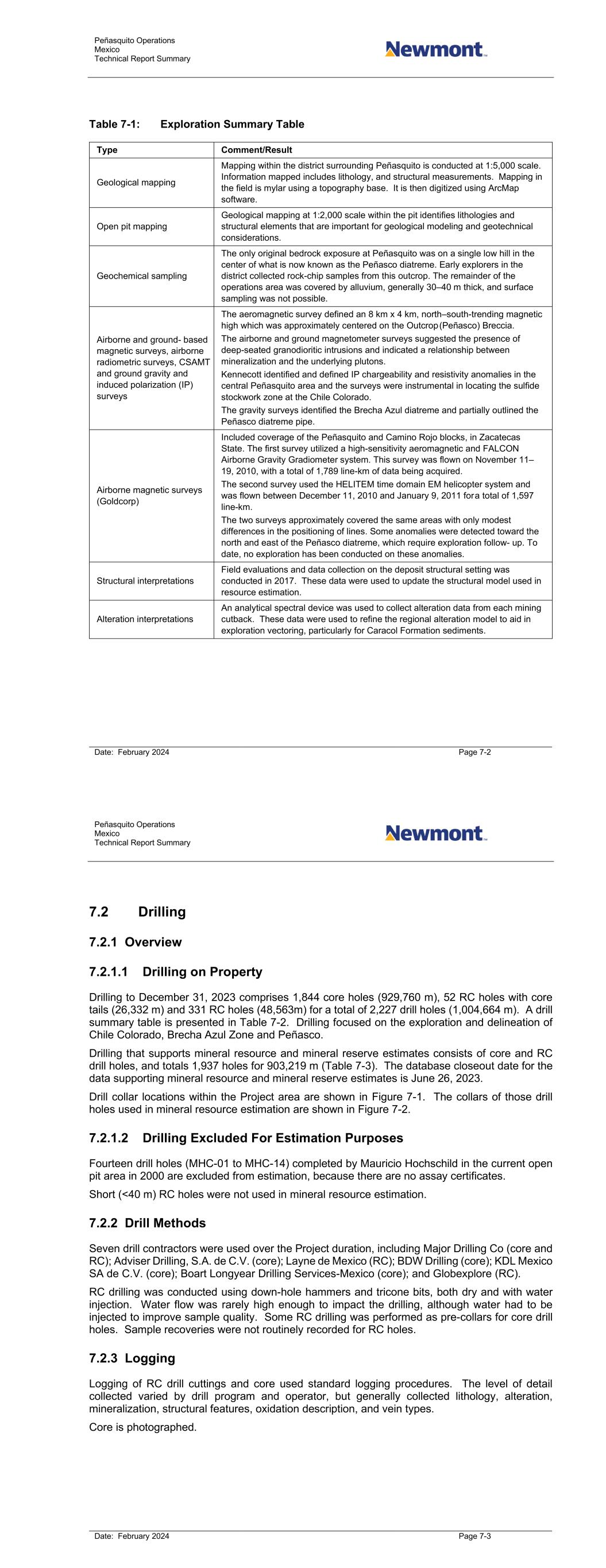 Peñasquito Operations Mexico Technical Report Summary Date: February 2024 Page 7-6 Year Project Operator Core Mixed RC Total Number of Holes Drilled Meters Number of Holes Drilled Meters Number of Holes Drilled Meters Number of Holes Drilled Meters 2016 119 43,754 — — 3 99 122 43,853 2017 43 13,980 5 2,068 35 7,116 83 23,164 2018 26 10,436 21 9,797 50 12,633 97 32,866 2019 Newmont 18 10,162 — — 1 271 19 10,433 2020 42 14,719 — — — — 42 14,719 2021 63 21,360 — — — — 63 21,360 2022 104 42,947 — — 62 6,766 166 49,713 2023 70 19,738 — — — — 70 19,738 Totals 1,591 831,071 52 26,332 290 45,816 1,937 903,219 Note: Metreage has been rounded; totals may not sum due to rounding. Mixed = drilling that commenced with RC and was finished using core. Peñasquito Operations Mexico Technical Report Summary Date: February 2024 Page 7-7 Figure 7-1: Drill Collar Location Map Note: Map current as at December 31, 2023. No drilling occurred between May and December, 2023.