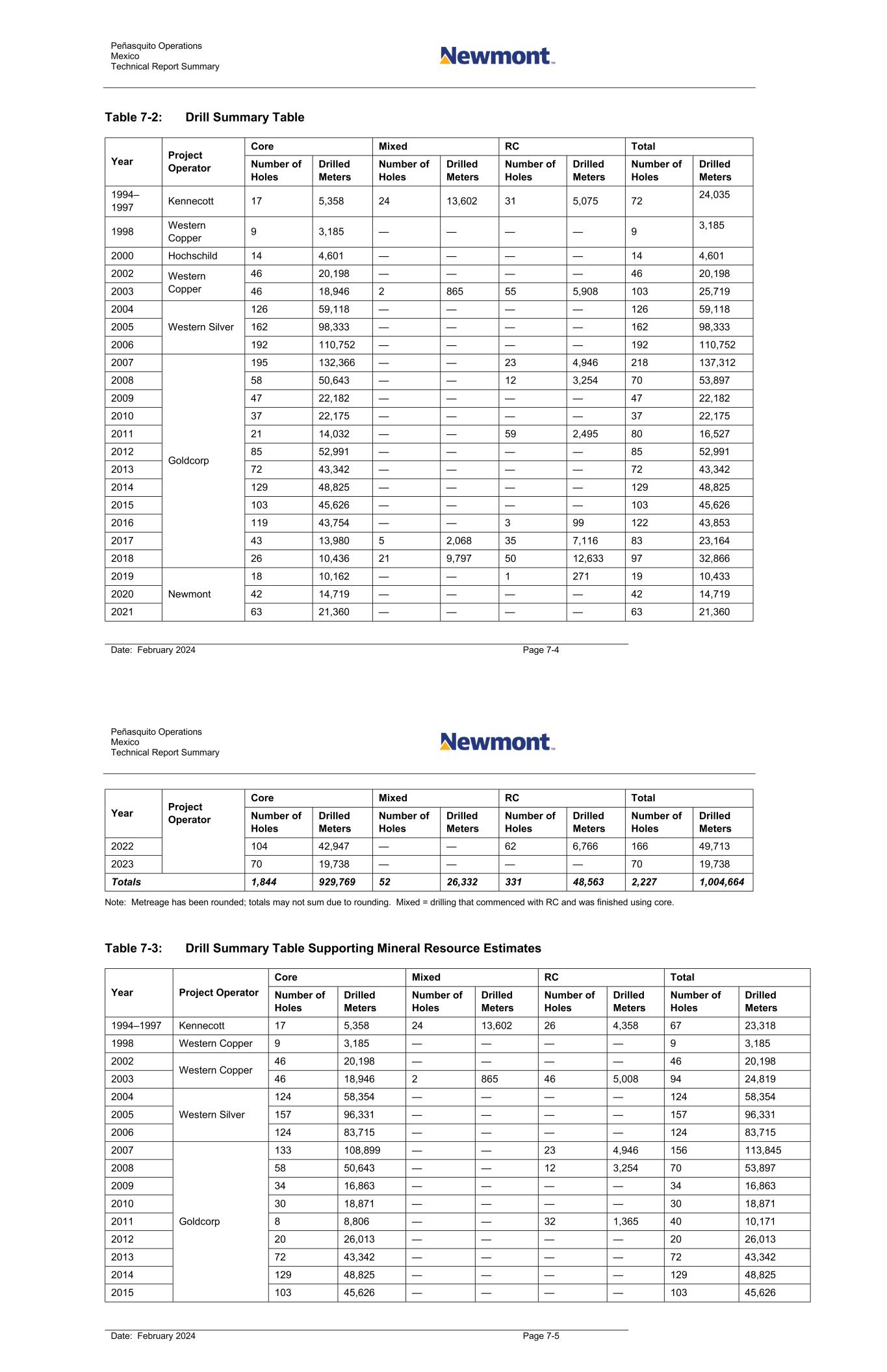 Peñasquito Operations Mexico Technical Report Summary Date: February 2024 Page 7-4 Table 7-2: Drill Summary Table Year Project Operator Core Mixed RC Total Number of Holes Drilled Meters Number of Holes Drilled Meters Number of Holes Drilled Meters Number of Holes Drilled Meters 1994– 1997 Kennecott 17 5,358 24 13,602 31 5,075 72 24,035 1998 Western Copper 9 3,185 — — — — 9 3,185 2000 Hochschild 14 4,601 — — — — 14 4,601 2002 Western Copper 46 20,198 — — — — 46 20,198 2003 46 18,946 2 865 55 5,908 103 25,719 2004 Western Silver 126 59,118 — — — — 126 59,118 2005 162 98,333 — — — — 162 98,333 2006 192 110,752 — — — — 192 110,752 2007 Goldcorp 195 132,366 — — 23 4,946 218 137,312 2008 58 50,643 — — 12 3,254 70 53,897 2009 47 22,182 — — — — 47 22,182 2010 37 22,175 — — — — 37 22,175 2011 21 14,032 — — 59 2,495 80 16,527 2012 85 52,991 — — — — 85 52,991 2013 72 43,342 — — — — 72 43,342 2014 129 48,825 — — — — 129 48,825 2015 103 45,626 — — — — 103 45,626 2016 119 43,754 — — 3 99 122 43,853 2017 43 13,980 5 2,068 35 7,116 83 23,164 2018 26 10,436 21 9,797 50 12,633 97 32,866 2019 Newmont 18 10,162 — — 1 271 19 10,433 2020 42 14,719 — — — — 42 14,719 2021 63 21,360 — — — — 63 21,360 Peñasquito Operations Mexico Technical Report Summary Date: February 2024 Page 7-5 Year Project Operator Core Mixed RC Total Number of Holes Drilled Meters Number of Holes Drilled Meters Number of Holes Drilled Meters Number of Holes Drilled Meters 2022 104 42,947 — — 62 6,766 166 49,713 2023 70 19,738 — — — — 70 19,738 Totals 1,844 929,769 52 26,332 331 48,563 2,227 1,004,664 Note: Metreage has been rounded; totals may not sum due to rounding. Mixed = drilling that commenced with RC and was finished using core. Table 7-3: Drill Summary Table Supporting Mineral Resource Estimates Year Project Operator Core Mixed RC Total Number of Holes Drilled Meters Number of Holes Drilled Meters Number of Holes Drilled Meters Number of Holes Drilled Meters 1994–1997 Kennecott 17 5,358 24 13,602 26 4,358 67 23,318 1998 Western Copper 9 3,185 — — — — 9 3,185 2002 Western Copper 46 20,198 — — — — 46 20,198 2003 46 18,946 2 865 46 5,008 94 24,819 2004 Western Silver 124 58,354 — — — — 124 58,354 2005 157 96,331 — — — — 157 96,331 2006 124 83,715 — — — — 124 83,715 2007 Goldcorp 133 108,899 — — 23 4,946 156 113,845 2008 58 50,643 — — 12 3,254 70 53,897 2009 34 16,863 — — — — 34 16,863 2010 30 18,871 — — — — 30 18,871 2011 8 8,806 — — 32 1,365 40 10,171 2012 20 26,013 — — — — 20 26,013 2013 72 43,342 — — — — 72 43,342 2014 129 48,825 — — — — 129 48,825 2015 103 45,626 — — — — 103 45,626