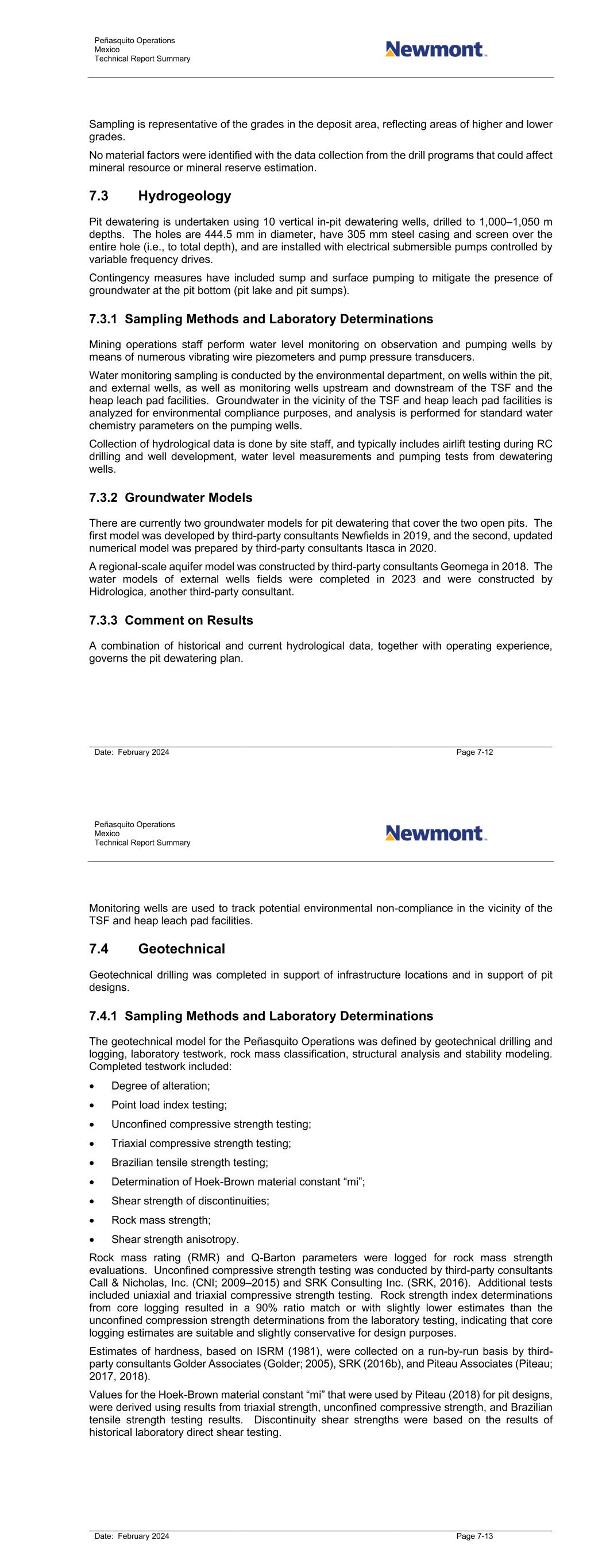 Peñasquito Operations Mexico Technical Report Summary Date: February 2024 Page 7-12 Sampling is representative of the grades in the deposit area, reflecting areas of higher and lower grades. No material factors were identified with the data collection from the drill programs that could affect mineral resource or mineral reserve estimation. 7.3 Hydrogeology Pit dewatering is undertaken using 10 vertical in-pit dewatering wells, drilled to 1,000–1,050 m depths. The holes are 444.5 mm in diameter, have 305 mm steel casing and screen over the entire hole (i.e., to total depth), and are installed with electrical submersible pumps controlled by variable frequency drives. Contingency measures have included sump and surface pumping to mitigate the presence of groundwater at the pit bottom (pit lake and pit sumps). 7.3.1 Sampling Methods and Laboratory Determinations Mining operations staff perform water level monitoring on observation and pumping wells by means of numerous vibrating wire piezometers and pump pressure transducers. Water monitoring sampling is conducted by the environmental department, on wells within the pit, and external wells, as well as monitoring wells upstream and downstream of the TSF and the heap leach pad facilities. Groundwater in the vicinity of the TSF and heap leach pad facilities is analyzed for environmental compliance purposes, and analysis is performed for standard water chemistry parameters on the pumping wells. Collection of hydrological data is done by site staff, and typically includes airlift testing during RC drilling and well development, water level measurements and pumping tests from dewatering wells. 7.3.2 Groundwater Models There are currently two groundwater models for pit dewatering that cover the two open pits. The first model was developed by third-party consultants Newfields in 2019, and the second, updated numerical model was prepared by third-party consultants Itasca in 2020. A regional-scale aquifer model was constructed by third-party consultants Geomega in 2018. The water models of external wells fields were completed in 2023 and were constructed by Hidrologica, another third-party consultant. 7.3.3 Comment on Results A combination of historical and current hydrological data, together with operating experience, governs the pit dewatering plan. Peñasquito Operations Mexico Technical Report Summary Date: February 2024 Page 7-13 Monitoring wells are used to track potential environmental non-compliance in the vicinity of the TSF and heap leach pad facilities. 7.4 Geotechnical Geotechnical drilling was completed in support of infrastructure locations and in support of pit designs. 7.4.1 Sampling Methods and Laboratory Determinations The geotechnical model for the Peñasquito Operations was defined by geotechnical drilling and logging, laboratory testwork, rock mass classification, structural analysis and stability modeling. Completed testwork included: • Degree of alteration; • Point load index testing; • Unconfined compressive strength testing; • Triaxial compressive strength testing; • Brazilian tensile strength testing; • Determination of Hoek-Brown material constant “mi”; • Shear strength of discontinuities; • Rock mass strength; • Shear strength anisotropy. Rock mass rating (RMR) and Q-Barton parameters were logged for rock mass strength evaluations. Unconfined compressive strength testing was conducted by third-party consultants Call & Nicholas, Inc. (CNI; 2009–2015) and SRK Consulting Inc. (SRK, 2016). Additional tests included uniaxial and triaxial compressive strength testing. Rock strength index determinations from core logging resulted in a 90% ratio match or with slightly lower estimates than the unconfined compression strength determinations from the laboratory testing, indicating that core logging estimates are suitable and slightly conservative for design purposes. Estimates of hardness, based on ISRM (1981), were collected on a run-by-run basis by third- party consultants Golder Associates (Golder; 2005), SRK (2016b), and Piteau Associates (Piteau; 2017, 2018). Values for the Hoek-Brown material constant “mi” that were used by Piteau (2018) for pit designs, were derived using results from triaxial strength, unconfined compressive strength, and Brazilian tensile strength testing results. Discontinuity shear strengths were based on the results of historical laboratory direct shear testing.