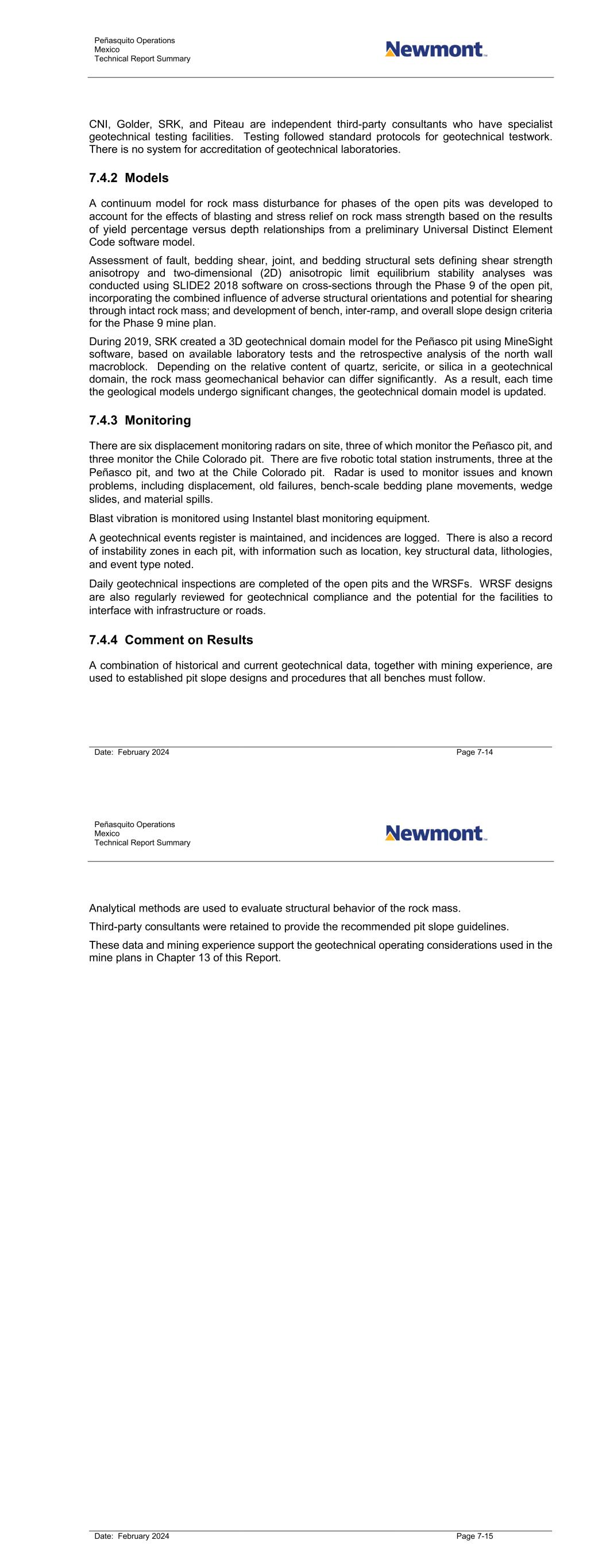 Peñasquito Operations Mexico Technical Report Summary Date: February 2024 Page 7-14 CNI, Golder, SRK, and Piteau are independent third-party consultants who have specialist geotechnical testing facilities. Testing followed standard protocols for geotechnical testwork. There is no system for accreditation of geotechnical laboratories. 7.4.2 Models A continuum model for rock mass disturbance for phases of the open pits was developed to account for the effects of blasting and stress relief on rock mass strength based on the results of yield percentage versus depth relationships from a preliminary Universal Distinct Element Code software model. Assessment of fault, bedding shear, joint, and bedding structural sets defining shear strength anisotropy and two-dimensional (2D) anisotropic limit equilibrium stability analyses was conducted using SLIDE2 2018 software on cross-sections through the Phase 9 of the open pit, incorporating the combined influence of adverse structural orientations and potential for shearing through intact rock mass; and development of bench, inter-ramp, and overall slope design criteria for the Phase 9 mine plan. During 2019, SRK created a 3D geotechnical domain model for the Peñasco pit using MineSight software, based on available laboratory tests and the retrospective analysis of the north wall macroblock. Depending on the relative content of quartz, sericite, or silica in a geotechnical domain, the rock mass geomechanical behavior can differ significantly. As a result, each time the geological models undergo significant changes, the geotechnical domain model is updated. 7.4.3 Monitoring There are six displacement monitoring radars on site, three of which monitor the Peñasco pit, and three monitor the Chile Colorado pit. There are five robotic total station instruments, three at the Peñasco pit, and two at the Chile Colorado pit. Radar is used to monitor issues and known problems, including displacement, old failures, bench-scale bedding plane movements, wedge slides, and material spills. Blast vibration is monitored using Instantel blast monitoring equipment. A geotechnical events register is maintained, and incidences are logged. There is also a record of instability zones in each pit, with information such as location, key structural data, lithologies, and event type noted. Daily geotechnical inspections are completed of the open pits and the WRSFs. WRSF designs are also regularly reviewed for geotechnical compliance and the potential for the facilities to interface with infrastructure or roads. 7.4.4 Comment on Results A combination of historical and current geotechnical data, together with mining experience, are used to established pit slope designs and procedures that all benches must follow. Peñasquito Operations Mexico Technical Report Summary Date: February 2024 Page 7-15 Analytical methods are used to evaluate structural behavior of the rock mass. Third-party consultants were retained to provide the recommended pit slope guidelines. These data and mining experience support the geotechnical operating considerations used in the mine plans in Chapter 13 of this Report.
