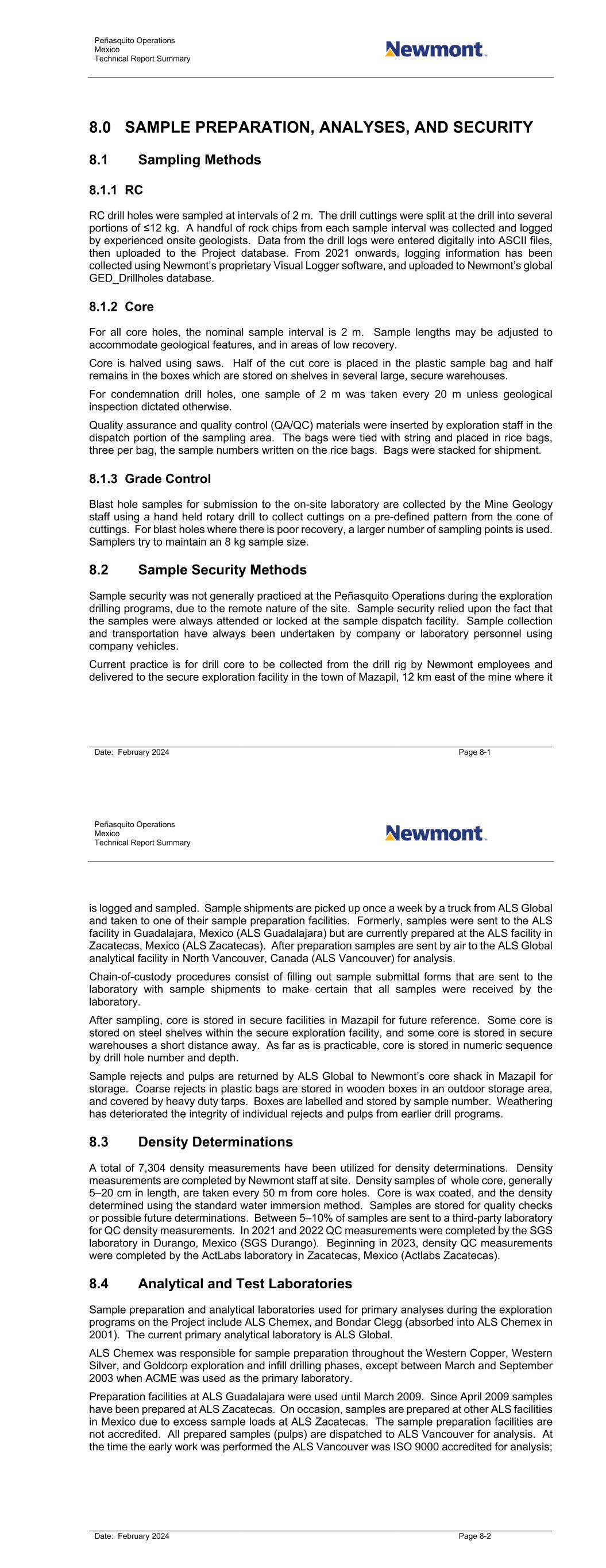 Peñasquito Operations Mexico Technical Report Summary Date: February 2024 Page 8-1 8.0 SAMPLE PREPARATION, ANALYSES, AND SECURITY 8.1 Sampling Methods 8.1.1 RC RC drill holes were sampled at intervals of 2 m. The drill cuttings were split at the drill into several portions of ≤12 kg. A handful of rock chips from each sample interval was collected and logged by experienced onsite geologists. Data from the drill logs were entered digitally into ASCII files, then uploaded to the Project database. From 2021 onwards, logging information has been collected using Newmont’s proprietary Visual Logger software, and uploaded to Newmont’s global GED_Drillholes database. 8.1.2 Core For all core holes, the nominal sample interval is 2 m. Sample lengths may be adjusted to accommodate geological features, and in areas of low recovery. Core is halved using saws. Half of the cut core is placed in the plastic sample bag and half remains in the boxes which are stored on shelves in several large, secure warehouses. For condemnation drill holes, one sample of 2 m was taken every 20 m unless geological inspection dictated otherwise. Quality assurance and quality control (QA/QC) materials were inserted by exploration staff in the dispatch portion of the sampling area. The bags were tied with string and placed in rice bags, three per bag, the sample numbers written on the rice bags. Bags were stacked for shipment. 8.1.3 Grade Control Blast hole samples for submission to the on-site laboratory are collected by the Mine Geology staff using a hand held rotary drill to collect cuttings on a pre-defined pattern from the cone of cuttings. For blast holes where there is poor recovery, a larger number of sampling points is used. Samplers try to maintain an 8 kg sample size. 8.2 Sample Security Methods Sample security was not generally practiced at the Peñasquito Operations during the exploration drilling programs, due to the remote nature of the site. Sample security relied upon the fact that the samples were always attended or locked at the sample dispatch facility. Sample collection and transportation have always been undertaken by company or laboratory personnel using company vehicles. Current practice is for drill core to be collected from the drill rig by Newmont employees and delivered to the secure exploration facility in the town of Mazapil, 12 km east of the mine where it Peñasquito Operations Mexico Technical Report Summary Date: February 2024 Page 8-2 is logged and sampled. Sample shipments are picked up once a week by a truck from ALS Global and taken to one of their sample preparation facilities. Formerly, samples were sent to the ALS facility in Guadalajara, Mexico (ALS Guadalajara) but are currently prepared at the ALS facility in Zacatecas, Mexico (ALS Zacatecas). After preparation samples are sent by air to the ALS Global analytical facility in North Vancouver, Canada (ALS Vancouver) for analysis. Chain-of-custody procedures consist of filling out sample submittal forms that are sent to the laboratory with sample shipments to make certain that all samples were received by the laboratory. After sampling, core is stored in secure facilities in Mazapil for future reference. Some core is stored on steel shelves within the secure exploration facility, and some core is stored in secure warehouses a short distance away. As far as is practicable, core is stored in numeric sequence by drill hole number and depth. Sample rejects and pulps are returned by ALS Global to Newmont’s core shack in Mazapil for storage. Coarse rejects in plastic bags are stored in wooden boxes in an outdoor storage area, and covered by heavy duty tarps. Boxes are labelled and stored by sample number. Weathering has deteriorated the integrity of individual rejects and pulps from earlier drill programs. 8.3 Density Determinations A total of 7,304 density measurements have been utilized for density determinations. Density measurements are completed by Newmont staff at site. Density samples of whole core, generally 5–20 cm in length, are taken every 50 m from core holes. Core is wax coated, and the density determined using the standard water immersion method. Samples are stored for quality checks or possible future determinations. Between 5–10% of samples are sent to a third-party laboratory for QC density measurements. In 2021 and 2022 QC measurements were completed by the SGS laboratory in Durango, Mexico (SGS Durango). Beginning in 2023, density QC measurements were completed by the ActLabs laboratory in Zacatecas, Mexico (Actlabs Zacatecas). 8.4 Analytical and Test Laboratories Sample preparation and analytical laboratories used for primary analyses during the exploration programs on the Project include ALS Chemex, and Bondar Clegg (absorbed into ALS Chemex in 2001). The current primary analytical laboratory is ALS Global. ALS Chemex was responsible for sample preparation throughout the Western Copper, Western Silver, and Goldcorp exploration and infill drilling phases, except between March and September 2003 when ACME was used as the primary laboratory. Preparation facilities at ALS Guadalajara were used until March 2009. Since April 2009 samples have been prepared at ALS Zacatecas. On occasion, samples are prepared at other ALS facilities in Mexico due to excess sample loads at ALS Zacatecas. The sample preparation facilities are not accredited. All prepared samples (pulps) are dispatched to ALS Vancouver for analysis. At the time the early work was performed the ALS Vancouver was ISO 9000 accredited for analysis;