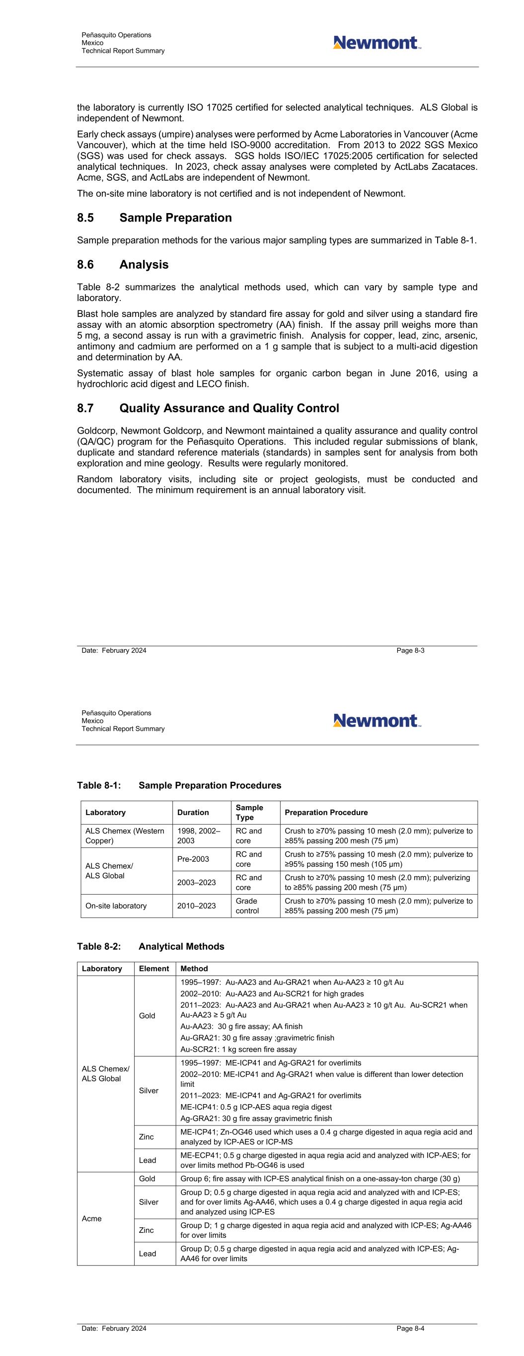 Peñasquito Operations Mexico Technical Report Summary Date: February 2024 Page 8-3 the laboratory is currently ISO 17025 certified for selected analytical techniques. ALS Global is independent of Newmont. Early check assays (umpire) analyses were performed by Acme Laboratories in Vancouver (Acme Vancouver), which at the time held ISO-9000 accreditation. From 2013 to 2022 SGS Mexico (SGS) was used for check assays. SGS holds ISO/IEC 17025:2005 certification for selected analytical techniques. In 2023, check assay analyses were completed by ActLabs Zacataces. Acme, SGS, and ActLabs are independent of Newmont. The on-site mine laboratory is not certified and is not independent of Newmont. 8.5 Sample Preparation Sample preparation methods for the various major sampling types are summarized in Table 8-1. 8.6 Analysis Table 8-2 summarizes the analytical methods used, which can vary by sample type and laboratory. Blast hole samples are analyzed by standard fire assay for gold and silver using a standard fire assay with an atomic absorption spectrometry (AA) finish. If the assay prill weighs more than 5 mg, a second assay is run with a gravimetric finish. Analysis for copper, lead, zinc, arsenic, antimony and cadmium are performed on a 1 g sample that is subject to a multi-acid digestion and determination by AA. Systematic assay of blast hole samples for organic carbon began in June 2016, using a hydrochloric acid digest and LECO finish. 8.7 Quality Assurance and Quality Control Goldcorp, Newmont Goldcorp, and Newmont maintained a quality assurance and quality control (QA/QC) program for the Peñasquito Operations. This included regular submissions of blank, duplicate and standard reference materials (standards) in samples sent for analysis from both exploration and mine geology. Results were regularly monitored. Random laboratory visits, including site or project geologists, must be conducted and documented. The minimum requirement is an annual laboratory visit. Peñasquito Operations Mexico Technical Report Summary Date: February 2024 Page 8-4 Table 8-1: Sample Preparation Procedures Laboratory Duration Sample Type Preparation Procedure ALS Chemex (Western Copper) 1998, 2002– 2003 RC and core Crush to ≥70% passing 10 mesh (2.0 mm); pulverize to ≥85% passing 200 mesh (75 µm) ALS Chemex/ ALS Global Pre-2003 RC and core Crush to ≥75% passing 10 mesh (2.0 mm); pulverize to ≥95% passing 150 mesh (105 µm) 2003–2023 RC and core Crush to ≥70% passing 10 mesh (2.0 mm); pulverizing to ≥85% passing 200 mesh (75 µm) On-site laboratory 2010–2023 Grade control Crush to ≥70% passing 10 mesh (2.0 mm); pulverize to ≥85% passing 200 mesh (75 µm) Table 8-2: Analytical Methods Laboratory Element Method ALS Chemex/ ALS Global Gold 1995–1997: Au-AA23 and Au-GRA21 when Au-AA23 ≥ 10 g/t Au 2002–2010: Au-AA23 and Au-SCR21 for high grades 2011–2023: Au-AA23 and Au-GRA21 when Au-AA23 ≥ 10 g/t Au. Au-SCR21 when Au-AA23 ≥ 5 g/t Au Au-AA23: 30 g fire assay; AA finish Au-GRA21: 30 g fire assay ;gravimetric finish Au-SCR21: 1 kg screen fire assay Silver 1995–1997: ME-ICP41 and Ag-GRA21 for overlimits 2002–2010: ME-ICP41 and Ag-GRA21 when value is different than lower detection limit 2011–2023: ME-ICP41 and Ag-GRA21 for overlimits ME-ICP41: 0.5 g ICP-AES aqua regia digest Ag-GRA21: 30 g fire assay gravimetric finish Zinc ME-ICP41; Zn-OG46 used which uses a 0.4 g charge digested in aqua regia acid and analyzed by ICP-AES or ICP-MS Lead ME-ECP41; 0.5 g charge digested in aqua regia acid and analyzed with ICP-AES; for over limits method Pb-OG46 is used Acme Gold Group 6; fire assay with ICP-ES analytical finish on a one-assay-ton charge (30 g) Silver Group D; 0.5 g charge digested in aqua regia acid and analyzed with and ICP-ES; and for over limits Ag-AA46, which uses a 0.4 g charge digested in aqua regia acid and analyzed using ICP-ES Zinc Group D; 1 g charge digested in aqua regia acid and analyzed with ICP-ES; Ag-AA46 for over limits Lead Group D; 0.5 g charge digested in aqua regia acid and analyzed with ICP-ES; Ag- AA46 for over limits