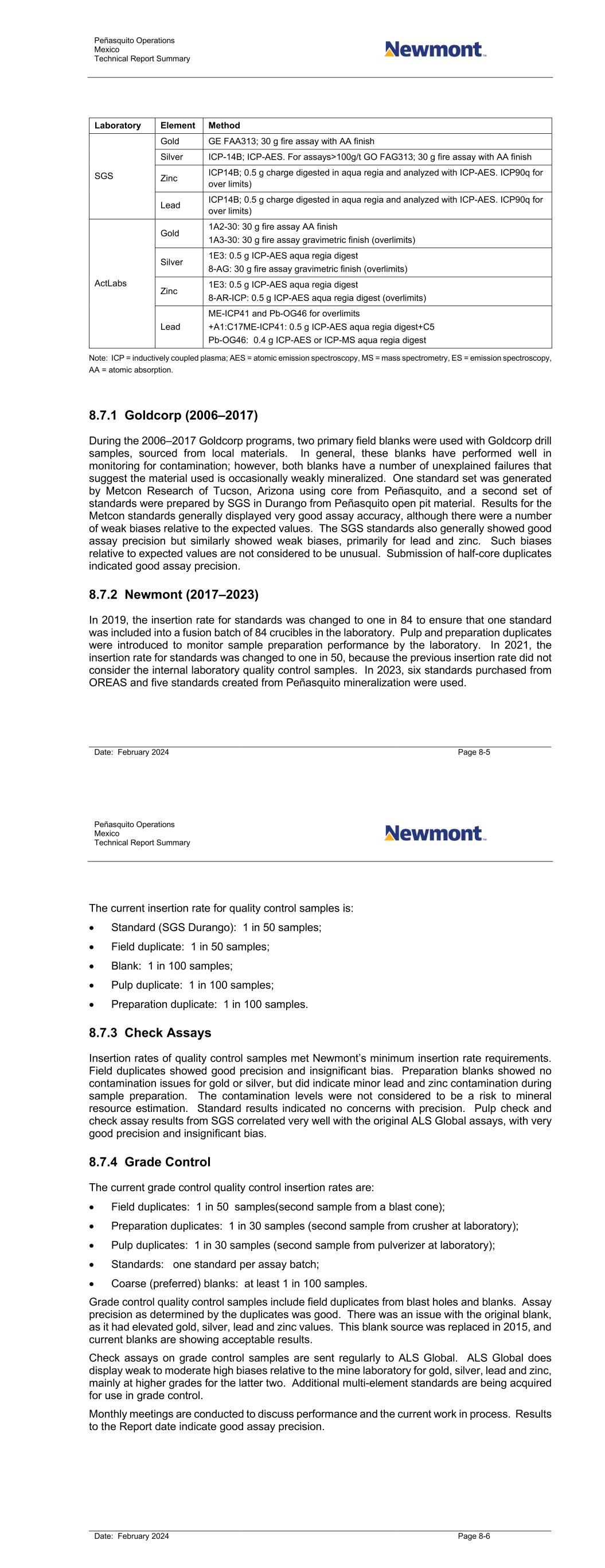 Peñasquito Operations Mexico Technical Report Summary Date: February 2024 Page 8-5 Laboratory Element Method SGS Gold GE FAA313; 30 g fire assay with AA finish Silver ICP-14B; ICP-AES. For assays>100g/t GO FAG313; 30 g fire assay with AA finish Zinc ICP14B; 0.5 g charge digested in aqua regia and analyzed with ICP-AES. ICP90q for over limits) Lead ICP14B; 0.5 g charge digested in aqua regia and analyzed with ICP-AES. ICP90q for over limits) ActLabs Gold 1A2-30: 30 g fire assay AA finish 1A3-30: 30 g fire assay gravimetric finish (overlimits) Silver 1E3: 0.5 g ICP-AES aqua regia digest 8-AG: 30 g fire assay gravimetric finish (overlimits) Zinc 1E3: 0.5 g ICP-AES aqua regia digest 8-AR-ICP: 0.5 g ICP-AES aqua regia digest (overlimits) Lead ME-ICP41 and Pb-OG46 for overlimits +A1:C17ME-ICP41: 0.5 g ICP-AES aqua regia digest+C5 Pb-OG46: 0.4 g ICP-AES or ICP-MS aqua regia digest Note: ICP = inductively coupled plasma; AES = atomic emission spectroscopy, MS = mass spectrometry, ES = emission spectroscopy, AA = atomic absorption. 8.7.1 Goldcorp (2006–2017) During the 2006–2017 Goldcorp programs, two primary field blanks were used with Goldcorp drill samples, sourced from local materials. In general, these blanks have performed well in monitoring for contamination; however, both blanks have a number of unexplained failures that suggest the material used is occasionally weakly mineralized. One standard set was generated by Metcon Research of Tucson, Arizona using core from Peñasquito, and a second set of standards were prepared by SGS in Durango from Peñasquito open pit material. Results for the Metcon standards generally displayed very good assay accuracy, although there were a number of weak biases relative to the expected values. The SGS standards also generally showed good assay precision but similarly showed weak biases, primarily for lead and zinc. Such biases relative to expected values are not considered to be unusual. Submission of half-core duplicates indicated good assay precision. 8.7.2 Newmont (2017–2023) In 2019, the insertion rate for standards was changed to one in 84 to ensure that one standard was included into a fusion batch of 84 crucibles in the laboratory. Pulp and preparation duplicates were introduced to monitor sample preparation performance by the laboratory. In 2021, the insertion rate for standards was changed to one in 50, because the previous insertion rate did not consider the internal laboratory quality control samples. In 2023, six standards purchased from OREAS and five standards created from Peñasquito mineralization were used. Peñasquito Operations Mexico Technical Report Summary Date: February 2024 Page 8-6 The current insertion rate for quality control samples is: • Standard (SGS Durango): 1 in 50 samples; • Field duplicate: 1 in 50 samples; • Blank: 1 in 100 samples; • Pulp duplicate: 1 in 100 samples; • Preparation duplicate: 1 in 100 samples. 8.7.3 Check Assays Insertion rates of quality control samples met Newmont’s minimum insertion rate requirements. Field duplicates showed good precision and insignificant bias. Preparation blanks showed no contamination issues for gold or silver, but did indicate minor lead and zinc contamination during sample preparation. The contamination levels were not considered to be a risk to mineral resource estimation. Standard results indicated no concerns with precision. Pulp check and check assay results from SGS correlated very well with the original ALS Global assays, with very good precision and insignificant bias. 8.7.4 Grade Control The current grade control quality control insertion rates are: • Field duplicates: 1 in 50 samples(second sample from a blast cone); • Preparation duplicates: 1 in 30 samples (second sample from crusher at laboratory); • Pulp duplicates: 1 in 30 samples (second sample from pulverizer at laboratory); • Standards: one standard per assay batch; • Coarse (preferred) blanks: at least 1 in 100 samples. Grade control quality control samples include field duplicates from blast holes and blanks. Assay precision as determined by the duplicates was good. There was an issue with the original blank, as it had elevated gold, silver, lead and zinc values. This blank source was replaced in 2015, and current blanks are showing acceptable results. Check assays on grade control samples are sent regularly to ALS Global. ALS Global does display weak to moderate high biases relative to the mine laboratory for gold, silver, lead and zinc, mainly at higher grades for the latter two. Additional multi-element standards are being acquired for use in grade control. Monthly meetings are conducted to discuss performance and the current work in process. Results to the Report date indicate good assay precision.