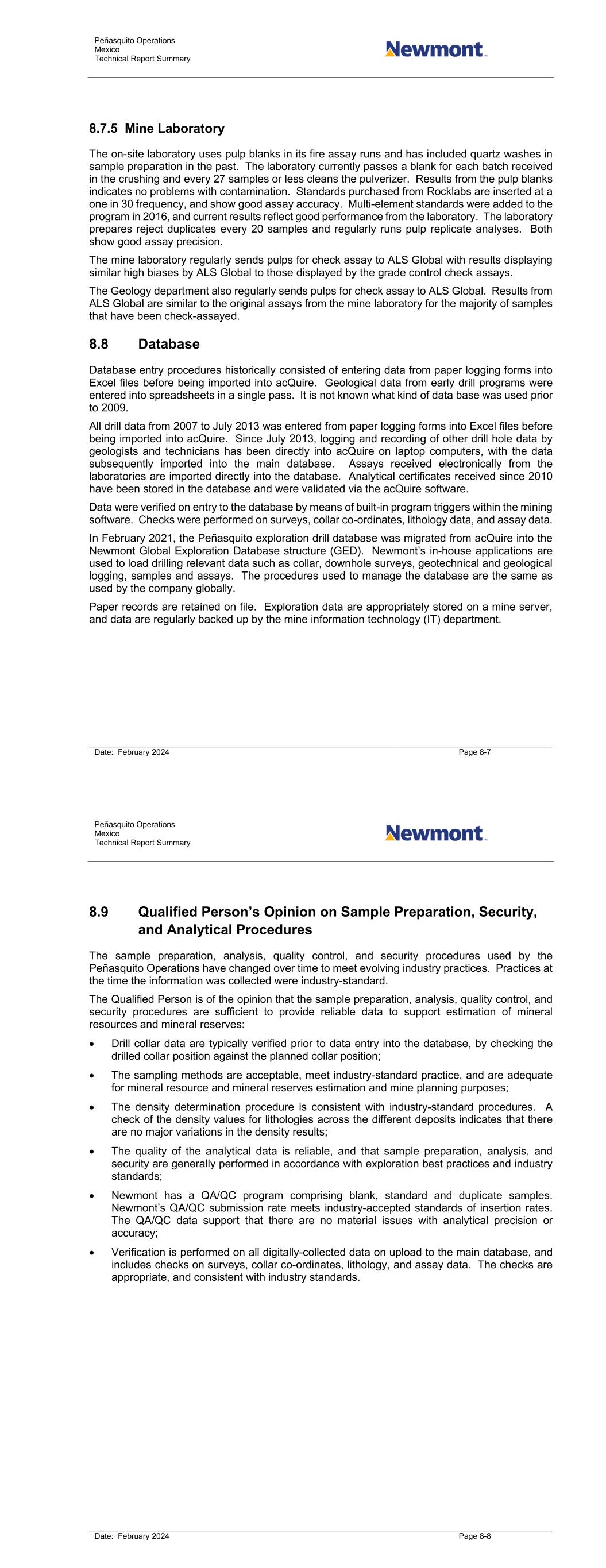 Peñasquito Operations Mexico Technical Report Summary Date: February 2024 Page 8-7 8.7.5 Mine Laboratory The on-site laboratory uses pulp blanks in its fire assay runs and has included quartz washes in sample preparation in the past. The laboratory currently passes a blank for each batch received in the crushing and every 27 samples or less cleans the pulverizer. Results from the pulp blanks indicates no problems with contamination. Standards purchased from Rocklabs are inserted at a one in 30 frequency, and show good assay accuracy. Multi-element standards were added to the program in 2016, and current results reflect good performance from the laboratory. The laboratory prepares reject duplicates every 20 samples and regularly runs pulp replicate analyses. Both show good assay precision. The mine laboratory regularly sends pulps for check assay to ALS Global with results displaying similar high biases by ALS Global to those displayed by the grade control check assays. The Geology department also regularly sends pulps for check assay to ALS Global. Results from ALS Global are similar to the original assays from the mine laboratory for the majority of samples that have been check-assayed. 8.8 Database Database entry procedures historically consisted of entering data from paper logging forms into Excel files before being imported into acQuire. Geological data from early drill programs were entered into spreadsheets in a single pass. It is not known what kind of data base was used prior to 2009. All drill data from 2007 to July 2013 was entered from paper logging forms into Excel files before being imported into acQuire. Since July 2013, logging and recording of other drill hole data by geologists and technicians has been directly into acQuire on laptop computers, with the data subsequently imported into the main database. Assays received electronically from the laboratories are imported directly into the database. Analytical certificates received since 2010 have been stored in the database and were validated via the acQuire software. Data were verified on entry to the database by means of built-in program triggers within the mining software. Checks were performed on surveys, collar co-ordinates, lithology data, and assay data. In February 2021, the Peñasquito exploration drill database was migrated from acQuire into the Newmont Global Exploration Database structure (GED). Newmont’s in-house applications are used to load drilling relevant data such as collar, downhole surveys, geotechnical and geological logging, samples and assays. The procedures used to manage the database are the same as used by the company globally. Paper records are retained on file. Exploration data are appropriately stored on a mine server, and data are regularly backed up by the mine information technology (IT) department. Peñasquito Operations Mexico Technical Report Summary Date: February 2024 Page 8-8 8.9 Qualified Person’s Opinion on Sample Preparation, Security, and Analytical Procedures The sample preparation, analysis, quality control, and security procedures used by the Peñasquito Operations have changed over time to meet evolving industry practices. Practices at the time the information was collected were industry-standard. The Qualified Person is of the opinion that the sample preparation, analysis, quality control, and security procedures are sufficient to provide reliable data to support estimation of mineral resources and mineral reserves: • Drill collar data are typically verified prior to data entry into the database, by checking the drilled collar position against the planned collar position; • The sampling methods are acceptable, meet industry-standard practice, and are adequate for mineral resource and mineral reserves estimation and mine planning purposes; • The density determination procedure is consistent with industry-standard procedures. A check of the density values for lithologies across the different deposits indicates that there are no major variations in the density results; • The quality of the analytical data is reliable, and that sample preparation, analysis, and security are generally performed in accordance with exploration best practices and industry standards; • Newmont has a QA/QC program comprising blank, standard and duplicate samples. Newmont’s QA/QC submission rate meets industry-accepted standards of insertion rates. The QA/QC data support that there are no material issues with analytical precision or accuracy; • Verification is performed on all digitally-collected data on upload to the main database, and includes checks on surveys, collar co-ordinates, lithology, and assay data. The checks are appropriate, and consistent with industry standards.