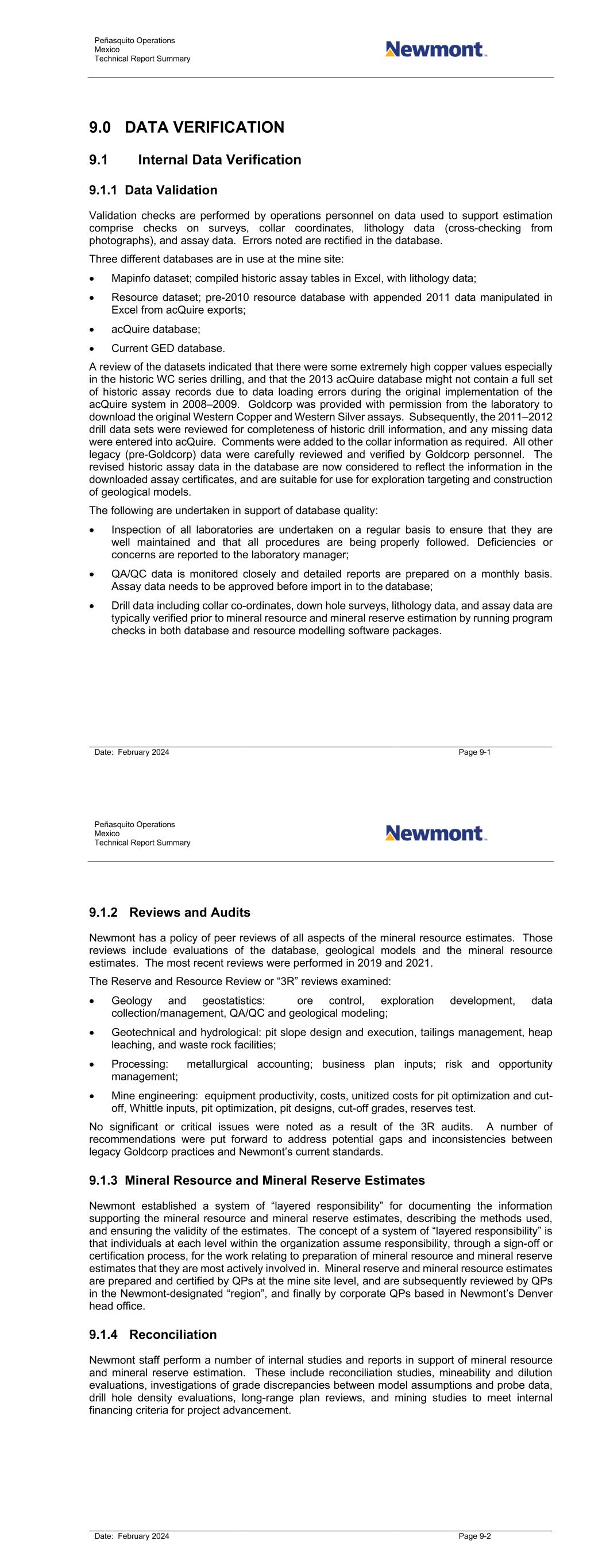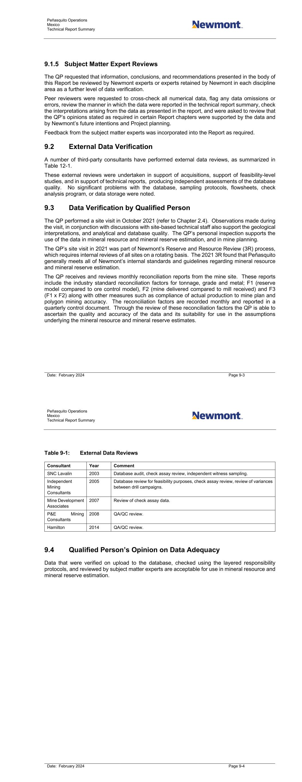 Peñasquito Operations Mexico Technical Report Summary Date: February 2024 Page 9-3 9.1.5 Subject Matter Expert Reviews The QP requested that information, conclusions, and recommendations presented in the body of this Report be reviewed by Newmont experts or experts retained by Newmont in each discipline area as a further level of data verification. Peer reviewers were requested to cross-check all numerical data, flag any data omissions or errors, review the manner in which the data were reported in the technical report summary, check the interpretations arising from the data as presented in the report, and were asked to review that the QP’s opinions stated as required in certain Report chapters were supported by the data and by Newmont’s future intentions and Project planning. Feedback from the subject matter experts was incorporated into the Report as required. 9.2 External Data Verification A number of third-party consultants have performed external data reviews, as summarized in Table 12-1. These external reviews were undertaken in support of acquisitions, support of feasibility-level studies, and in support of technical reports, producing independent assessments of the database quality. No significant problems with the database, sampling protocols, flowsheets, check analysis program, or data storage were noted. 9.3 Data Verification by Qualified Person The QP performed a site visit in October 2021 (refer to Chapter 2.4). Observations made during the visit, in conjunction with discussions with site-based technical staff also support the geological interpretations, and analytical and database quality. The QP’s personal inspection supports the use of the data in mineral resource and mineral reserve estimation, and in mine planning. The QP’s site visit in 2021 was part of Newmont’s Reserve and Resource Review (3R) process, which requires internal reviews of all sites on a rotating basis. The 2021 3R found that Peñasquito generally meets all of Newmont’s internal standards and guidelines regarding mineral resource and mineral reserve estimation. The QP receives and reviews monthly reconciliation reports from the mine site. These reports include the industry standard reconciliation factors for tonnage, grade and metal; F1 (reserve model compared to ore control model), F2 (mine delivered compared to mill received) and F3 (F1 x F2) along with other measures such as compliance of actual production to mine plan and polygon mining accuracy. The reconciliation factors are recorded monthly and reported in a quarterly control document. Through the review of these reconciliation factors the QP is able to ascertain the quality and accuracy of the data and its suitability for use in the assumptions underlying the mineral resource and mineral reserve estimates. Peñasquito Operations Mexico Technical Report Summary Date: February 2024 Page 9-4 Table 9-1: External Data Reviews Consultant Year Comment SNC Lavalin 2003 Database audit, check assay review, independent witness sampling. Independent Mining Consultants 2005 Database review for feasibility purposes, check assay review, review of variances between drill campaigns. Mine Development Associates 2007 Review of check assay data. P&E Mining Consultants 2008 QA/QC review. Hamilton 2014 QA/QC review. 9.4 Qualified Person’s Opinion on Data Adequacy Data that were verified on upload to the database, checked using the layered responsibility protocols, and reviewed by subject matter experts are acceptable for use in mineral resource and mineral reserve estimation.