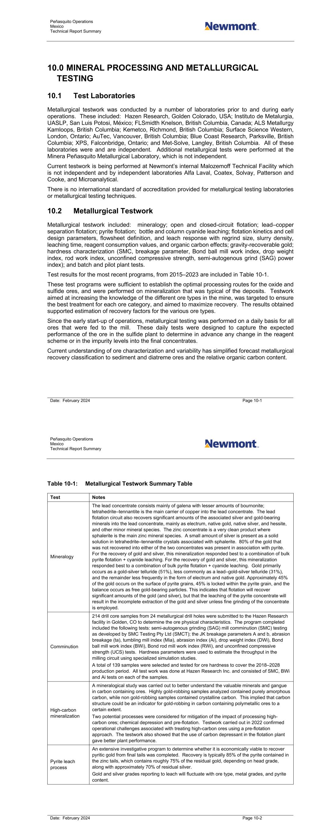 Peñasquito Operations Mexico Technical Report Summary Date: February 2024 Page 10-1 10.0 MINERAL PROCESSING AND METALLURGICAL TESTING 10.1 Test Laboratories Metallurgical testwork was conducted by a number of laboratories prior to and during early operations. These included: Hazen Research, Golden Colorado, USA; Instituto de Metalurgia, UASLP, San Luis Potosi, México; FLSmidth Knelson, British Columbia, Canada; ALS Metallurgy Kamloops, British Columbia; Kemetco, Richmond, British Columbia; Surface Science Western, London, Ontario; AuTec, Vancouver, British Columbia; Blue Coast Research, Parksville, British Columbia; XPS, Falconbridge, Ontario; and Met-Solve, Langley, British Columbia. All of these laboratories were and are independent. Additional metallurgical tests were performed at the Minera Peñasquito Metallurgical Laboratory, which is not independent. Current testwork is being performed at Newmont’s internal Malozemoff Technical Facility which is not independent and by independent laboratories Alfa Laval, Coatex, Solvay, Patterson and Cooke, and Microanalytical. There is no international standard of accreditation provided for metallurgical testing laboratories or metallurgical testing techniques. 10.2 Metallurgical Testwork Metallurgical testwork included: mineralogy; open and closed-circuit flotation; lead–copper separation flotation; pyrite flotation; bottle and column cyanide leaching; flotation kinetics and cell design parameters, flowsheet definition, and leach response with regrind size, slurry density, leaching time, reagent consumption values, and organic carbon effects; gravity-recoverable gold; hardness characterization (SMC, breakage parameter, Bond ball mill work index, drop weight index, rod work index, unconfined compressive strength, semi-autogenous grind (SAG) power index); and batch and pilot plant tests. Test results for the most recent programs, from 2015–2023 are included in Table 10-1. These test programs were sufficient to establish the optimal processing routes for the oxide and sulfide ores, and were performed on mineralization that was typical of the deposits. Testwork aimed at increasing the knowledge of the different ore types in the mine, was targeted to ensure the best treatment for each ore category, and aimed to maximize recovery. The results obtained supported estimation of recovery factors for the various ore types. Since the early start-up of operations, metallurgical testing was performed on a daily basis for all ores that were fed to the mill. These daily tests were designed to capture the expected performance of the ore in the sulfide plant to determine in advance any change in the reagent scheme or in the impurity levels into the final concentrates. Current understanding of ore characterization and variability has simplified forecast metallurgical recovery classification to sediment and diatreme ores and the relative organic carbon content. Peñasquito Operations Mexico Technical Report Summary Date: February 2024 Page 10-2 Table 10-1: Metallurgical Testwork Summary Table Test Notes Mineralogy The lead concentrate consists mainly of galena with lesser amounts of bournonite; tetrahedrite–tennantite is the main carrier of copper into the lead concentrate. The lead flotation circuit also recovers significant amounts of the associated silver and gold-bearing minerals into the lead concentrate, mainly as electrum, native gold, native silver, and hessite, and other minor mineral species. The zinc concentrate is a very clean product where sphalerite is the main zinc mineral species. A small amount of silver is present as a solid solution in tetrahedrite–tennantite crystals associated with sphalerite. 80% of the gold that was not recovered into either of the two concentrates was present in association with pyrite. For the recovery of gold and silver, this mineralization responded best to a combination of bulk pyrite flotation + cyanide leaching. For the recovery of gold and silver, this mineralization responded best to a combination of bulk pyrite flotation + cyanide leaching. Gold primarily occurs as a gold-silver telluride (51%), less commonly as a lead–gold-silver telluride (31%), and the remainder less frequently in the form of electrum and native gold. Approximately 45% of the gold occurs on the surface of pyrite grains, 45% is locked within the pyrite grain, and the balance occurs as free gold-bearing particles. This indicates that flotation will recover significant amounts of the gold (and silver), but that the leaching of the pyrite concentrate will result in the incomplete extraction of the gold and silver unless fine grinding of the concentrate is employed. Comminution 214 drill core samples from 24 metallurgical drill holes were submitted to the Hazen Research facility in Golden, CO to determine the ore physical characteristics. The program completed included the following tests: semi-autogenous grinding (SAG) mill comminution (SMC) testing as developed by SMC Testing Pty Ltd (SMCT); the JK breakage parameters A and b, abrasion breakage (ta), tumbling mill index (Mia), abrasion index (Ai), drop weight index (DWi), Bond ball mill work index (BWi), Bond rod mill work index (RWi), and unconfined compressive strength (UCS) tests. Hardness parameters were used to estimate the throughput in the milling circuit using specialized simulation studies. A total of 139 samples were selected and tested for ore hardness to cover the 2018–2028 production period. All test work was done at Hazen Research Inc. and consisted of SMC, BWi and Ai tests on each of the samples. High-carbon mineralization A mineralogical study was carried out to better understand the valuable minerals and gangue in carbon containing ores. Highly gold-robbing samples analyzed contained purely amorphous carbon, while non gold-robbing samples contained crystalline carbon. This implied that carbon structure could be an indicator for gold-robbing in carbon containing polym