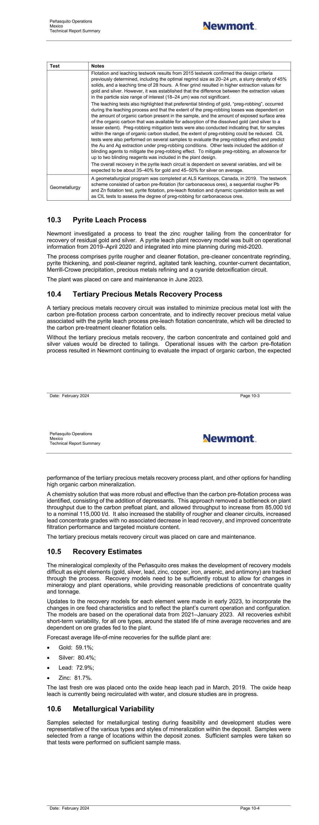 Peñasquito Operations Mexico Technical Report Summary Date: February 2024 Page 10-3 Test Notes Flotation and leaching testwork results from 2015 testwork confirmed the design criteria previously determined, including the optimal regrind size as 20–24 μm, a slurry density of 45% solids, and a leaching time of 28 hours. A finer grind resulted in higher extraction values for gold and silver. However, it was established that the difference between the extraction values in the particle size range of interest (18–24 µm) was not significant. The leaching tests also highlighted that preferential blinding of gold, “preg-robbing”, occurred during the leaching process and that the extent of the preg-robbing losses was dependent on the amount of organic carbon present in the sample, and the amount of exposed surface area of the organic carbon that was available for adsorption of the dissolved gold (and silver to a lesser extent). Preg-robbing mitigation tests were also conducted indicating that, for samples within the range of organic carbon studied, the extent of preg-robbing could be reduced. CIL tests were also performed on several samples to evaluate the preg-robbing effect and predict the Au and Ag extraction under preg-robbing conditions. Other tests included the addition of blinding agents to mitigate the preg-robbing effect. To mitigate preg-robbing, an allowance for up to two blinding reagents was included in the plant design. The overall recovery in the pyrite leach circuit is dependent on several variables, and will be expected to be about 35–40% for gold and 45–50% for silver on average. Geometallurgy A geometallurgical program was completed at ALS Kamloops, Canada, in 2019. The testwork scheme consisted of carbon pre-flotation (for carbonaceous ores), a sequential rougher Pb and Zn flotation test, pyrite flotation, pre-leach flotation and dynamic cyanidation tests as well as CIL tests to assess the degree of preg-robbing for carbonaceous ores. 10.3 Pyrite Leach Process Newmont investigated a process to treat the zinc rougher tailing from the concentrator for recovery of residual gold and silver. A pyrite leach plant recovery model was built on operational information from 2019–April 2020 and integrated into mine planning during mid-2020. The process comprises pyrite rougher and cleaner flotation, pre-cleaner concentrate regrinding, pyrite thickening, and post-cleaner regrind, agitated tank leaching, counter-current decantation, Merrill-Crowe precipitation, precious metals refining and a cyanide detoxification circuit. The plant was placed on care and maintenance in June 2023. 10.4 Tertiary Precious Metals Recovery Process A tertiary precious metals recovery circuit was installed to minimize precious metal lost with the carbon pre-flotation process carbon concentrate, and to indirectly recover precious metal value associated with the pyrite leach process pre-leach flotation concentrate, which will be directed to the carbon pre-treatment cleaner flotation cells. Without the tertiary precious metals recovery, the carbon concentrate and contained gold and silver values would be directed to tailings. Operational issues with the carbon pre-flotation process resulted in Newmont continuing to evaluate the impact of organic carbon, the expected Peñasquito Operations Mexico Technical Report Summary Date: February 2024 Page 10-4 performance of the tertiary precious metals recovery process plant, and other options for handling high organic carbon mineralization. A chemistry solution that was more robust and effective than the carbon pre-flotation process was identified, consisting of the addition of depressants. This approach removed a bottleneck on plant throughput due to the carbon prefloat plant, and allowed throughput to increase from 85,000 t/d to a nominal 115,000 t/d. It also increased the stability of rougher and cleaner circuits, increased lead concentrate grades with no associated decrease in lead recovery, and improved concentrate filtration performance and targeted moisture content. The tertiary precious metals recovery circuit was placed on care and maintenance. 10.5 Recovery Estimates The mineralogical complexity of the Peñasquito ores makes the development of recovery models difficult as eight elements (gold, silver, lead, zinc, copper, iron, arsenic, and antimony) are tracked through the process. Recovery models need to be sufficiently robust to allow for changes in mineralogy and plant operations, while providing reasonable predictions of concentrate quality and tonnage. Updates to the recovery models for each element were made in early 2023, to incorporate the changes in ore feed characteristics and to reflect the plant’s current operation and configuration. The models are based on the operational data from 2021–January 2023. All recoveries exhibit short-term variability, for all ore types, around the stated life of mine average recoveries and are dependent on ore grades fed to the plant. Forecast average life-of-mine recoveries for the sulfide plant are: • Gold: 59.1%; • Silver: 80.4%; • Lead: 72.9%; • Zinc: 81.7%. The last fresh ore was placed onto the oxide heap leach pad in March, 2019. The oxide heap leach is currently being recirculated with water, and closure studies are in progress. 10.6 Metallurgical Variability Samples selected for metallurgical testing during feasibility and development studies were representative of the various types and styles of mineralization within the deposit. Samples were selected from a range of locations within the deposit zones. Sufficient samples were taken so that tests were performed on sufficient sample mass.