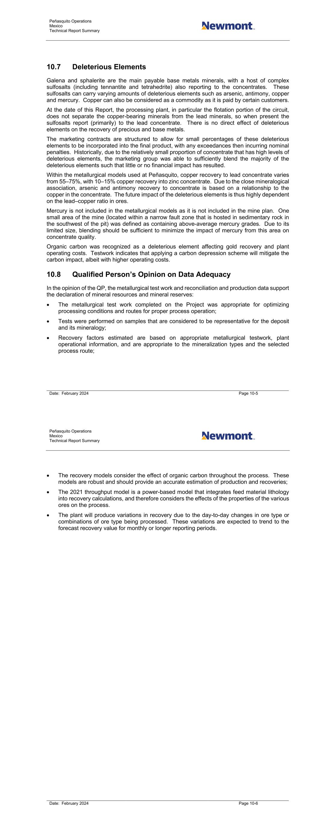 Peñasquito Operations Mexico Technical Report Summary Date: February 2024 Page 10-5 10.7 Deleterious Elements Galena and sphalerite are the main payable base metals minerals, with a host of complex sulfosalts (including tennantite and tetrahedrite) also reporting to the concentrates. These sulfosalts can carry varying amounts of deleterious elements such as arsenic, antimony, copper and mercury. Copper can also be considered as a commodity as it is paid by certain customers. At the date of this Report, the processing plant, in particular the flotation portion of the circuit, does not separate the copper-bearing minerals from the lead minerals, so when present the sulfosalts report (primarily) to the lead concentrate. There is no direct effect of deleterious elements on the recovery of precious and base metals. The marketing contracts are structured to allow for small percentages of these deleterious elements to be incorporated into the final product, with any exceedances then incurring nominal penalties. Historically, due to the relatively small proportion of concentrate that has high levels of deleterious elements, the marketing group was able to sufficiently blend the majority of the deleterious elements such that little or no financial impact has resulted. Within the metallurgical models used at Peñasquito, copper recovery to lead concentrate varies from 55–75%, with 10–15% copper recovery into zinc concentrate. Due to the close mineralogical association, arsenic and antimony recovery to concentrate is based on a relationship to the copper in the concentrate. The future impact of the deleterious elements is thus highly dependent on the lead–copper ratio in ores. Mercury is not included in the metallurgical models as it is not included in the mine plan. One small area of the mine (located within a narrow fault zone that is hosted in sedimentary rock in the southwest of the pit) was defined as containing above-average mercury grades. Due to its limited size, blending should be sufficient to minimize the impact of mercury from this area on concentrate quality. Organic carbon was recognized as a deleterious element affecting gold recovery and plant operating costs. Testwork indicates that applying a carbon depression scheme will mitigate the carbon impact, albeit with higher operating costs. 10.8 Qualified Person’s Opinion on Data Adequacy In the opinion of the QP, the metallurgical test work and reconciliation and production data support the declaration of mineral resources and mineral reserves: • The metallurgical test work completed on the Project was appropriate for optimizing processing conditions and routes for proper process operation; • Tests were performed on samples that are considered to be representative for the deposit and its mineralogy; • Recovery factors estimated are based on appropriate metallurgical testwork, plant operational information, and are appropriate to the mineralization types and the selected process route; Peñasquito Operations Mexico Technical Report Summary Date: February 2024 Page 10-6 • The recovery models consider the effect of organic carbon throughout the process. These models are robust and should provide an accurate estimation of production and recoveries; • The 2021 throughput model is a power-based model that integrates feed material lithology into recovery calculations, and therefore considers the effects of the properties of the various ores on the process. • The plant will produce variations in recovery due to the day-to-day changes in ore type or combinations of ore type being processed. These variations are expected to trend to the forecast recovery value for monthly or longer reporting periods.