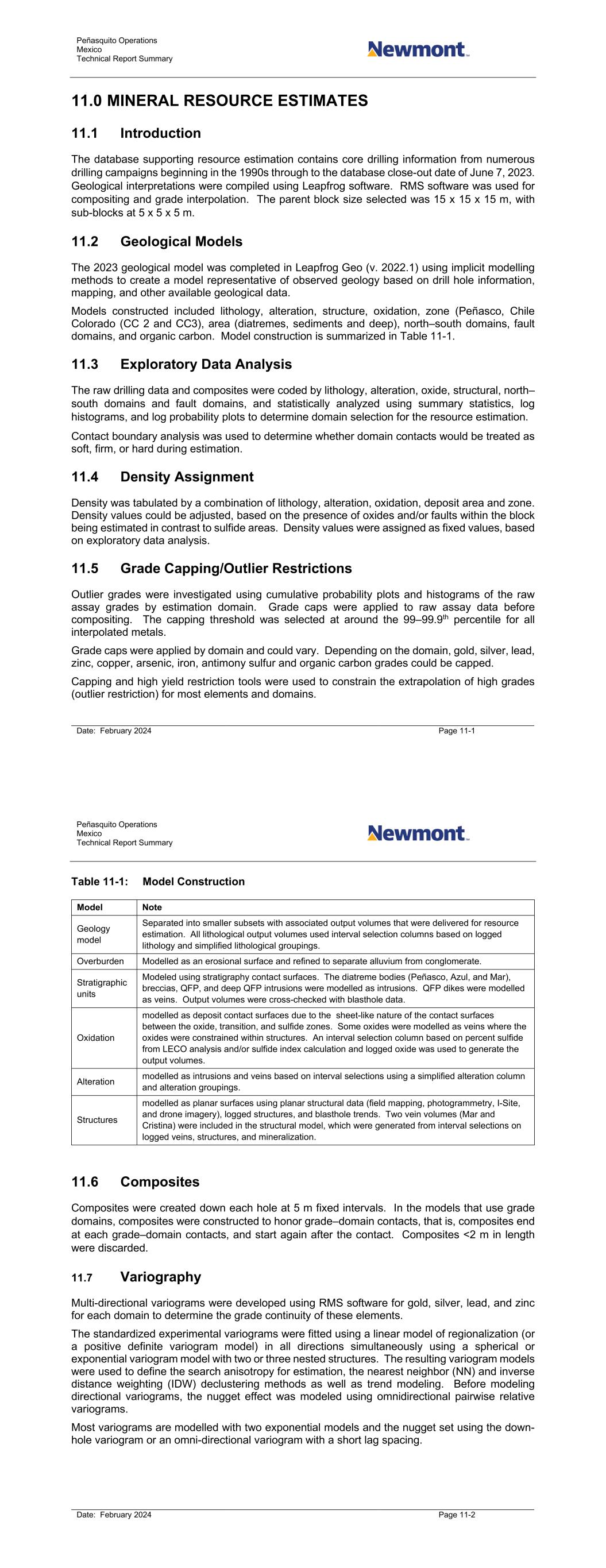 Peñasquito Operations Mexico Technical Report Summary Date: February 2024 Page 11-1 11.0 MINERAL RESOURCE ESTIMATES 11.1 Introduction The database supporting resource estimation contains core drilling information from numerous drilling campaigns beginning in the 1990s through to the database close-out date of June 7, 2023. Geological interpretations were compiled using Leapfrog software. RMS software was used for compositing and grade interpolation. The parent block size selected was 15 x 15 x 15 m, with sub-blocks at 5 x 5 x 5 m. 11.2 Geological Models The 2023 geological model was completed in Leapfrog Geo (v. 2022.1) using implicit modelling methods to create a model representative of observed geology based on drill hole information, mapping, and other available geological data. Models constructed included lithology, alteration, structure, oxidation, zone (Peñasco, Chile Colorado (CC 2 and CC3), area (diatremes, sediments and deep), north–south domains, fault domains, and organic carbon. Model construction is summarized in Table 11-1. 11.3 Exploratory Data Analysis The raw drilling data and composites were coded by lithology, alteration, oxide, structural, north– south domains and fault domains, and statistically analyzed using summary statistics, log histograms, and log probability plots to determine domain selection for the resource estimation. Contact boundary analysis was used to determine whether domain contacts would be treated as soft, firm, or hard during estimation. 11.4 Density Assignment Density was tabulated by a combination of lithology, alteration, oxidation, deposit area and zone. Density values could be adjusted, based on the presence of oxides and/or faults within the block being estimated in contrast to sulfide areas. Density values were assigned as fixed values, based on exploratory data analysis. 11.5 Grade Capping/Outlier Restrictions Outlier grades were investigated using cumulative probability plots and histograms of the raw assay grades by estimation domain. Grade caps were applied to raw assay data before compositing. The capping threshold was selected at around the 99–99.9th percentile for all interpolated metals. Grade caps were applied by domain and could vary. Depending on the domain, gold, silver, lead, zinc, copper, arsenic, iron, antimony sulfur and organic carbon grades could be capped. Capping and high yield restriction tools were used to constrain the extrapolation of high grades (outlier restriction) for most elements and domains. Peñasquito Operations Mexico Technical Report Summary Date: February 2024 Page 11-2 Table 11-1: Model Construction Model Note Geology model Separated into smaller subsets with associated output volumes that were delivered for resource estimation. All lithological output volumes used interval selection columns based on logged lithology and simplified lithological groupings. Overburden Modelled as an erosional surface and refined to separate alluvium from conglomerate. Stratigraphic units Modeled using stratigraphy contact surfaces. The diatreme bodies (Peñasco, Azul, and Mar), breccias, QFP, and deep QFP intrusions were modelled as intrusions. QFP dikes were modelled as veins. Output volumes were cross-checked with blasthole data. Oxidation modelled as deposit contact surfaces due to the sheet-like nature of the contact surfaces between the oxide, transition, and sulfide zones. Some oxides were modelled as veins where the oxides were constrained within structures. An interval selection column based on percent sulfide from LECO analysis and/or sulfide index calculation and logged oxide was used to generate the output volumes. Alteration modelled as intrusions and veins based on interval selections using a simplified alteration column and alteration groupings. Structures modelled as planar surfaces using planar structural data (field mapping, photogrammetry, I-Site, and drone imagery), logged structures, and blasthole trends. Two vein volumes (Mar and Cristina) were included in the structural model, which were generated from interval selections on logged veins, structures, and mineralization. 11.6 Composites Composites were created down each hole at 5 m fixed intervals. In the models that use grade domains, composites were constructed to honor grade–domain contacts, that is, composites end at each grade–domain contacts, and start again after the contact. Composites <2 m in length were discarded. 11.7 Variography Multi-directional variograms were developed using RMS software for gold, silver, lead, and zinc for each domain to determine the grade continuity of these elements. The standardized experimental variograms were fitted using a linear model of regionalization (or a positive definite variogram model) in all directions simultaneously using a spherical or exponential variogram model with two or three nested structures. The resulting variogram models were used to define the search anisotropy for estimation, the nearest neighbor (NN) and inverse distance weighting (IDW) declustering methods as well as trend modeling. Before modeling directional variograms, the nugget effect was modeled using omnidirectional pairwise relative variograms. Most variograms are modelled with two exponential models and the nugget set using the down- hole variogram or an omni-directional variogram with a short lag spacing.