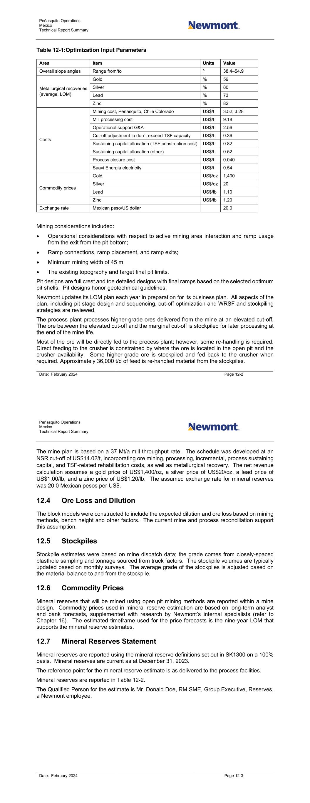 Peñasquito Operations Mexico Technical Report Summary Date: February 2024 Page 12-2 Table 12-1:Optimization Input Parameters Area Item Units Value Overall slope angles Range from/to º 38.4–54.9 Metallurgical recoveries (average, LOM) Gold % 59 Silver % 80 Lead % 73 Zinc % 82 Costs Mining cost, Penasquito, Chile Colorado US$/t 3.52; 3.28 Mill processing cost US$/t 9.18 Operational support G&A US$/t 2.56 Cut-off adjustment to don´t exceed TSF capacity US$/t 0.36 Sustaining capital allocation (TSF construction cost) US$/t 0.82 Sustaining capital allocation (other) US$/t 0.52 Process closure cost US$/t 0.040 Saavi Energia electricity US$/t 0.54 Commodity prices Gold US$/oz 1,400 Silver US$/oz 20 Lead US$/lb 1.10 Zinc US$/lb 1.20 Exchange rate Mexican peso/US dollar 20.0 Mining considerations included: • Operational considerations with respect to active mining area interaction and ramp usage from the exit from the pit bottom; • Ramp connections, ramp placement, and ramp exits; • Minimum mining width of 45 m; • The existing topography and target final pit limits. Pit designs are full crest and toe detailed designs with final ramps based on the selected optimum pit shells. Pit designs honor geotechnical guidelines. Newmont updates its LOM plan each year in preparation for its business plan. All aspects of the plan, including pit stage design and sequencing, cut-off optimization and WRSF and stockpiling strategies are reviewed. The process plant processes higher-grade ores delivered from the mine at an elevated cut-off. The ore between the elevated cut-off and the marginal cut-off is stockpiled for later processing at the end of the mine life. Most of the ore will be directly fed to the process plant; however, some re-handling is required. Direct feeding to the crusher is constrained by where the ore is located in the open pit and the crusher availability. Some higher-grade ore is stockpiled and fed back to the crusher when required. Approximately 36,000 t/d of feed is re-handled material from the stockpiles. Peñasquito Operations Mexico Technical Report Summary Date: February 2024 Page 12-3 The mine plan is based on a 37 Mt/a mill throughput rate. The schedule was developed at an NSR cut-off of US$14.02/t, incorporating ore mining, processing, incremental, process sustaining capital, and TSF-related rehabilitation costs, as well as metallurgical recovery. The net revenue calculation assumes a gold price of US$1,400/oz, a silver price of US$20/oz, a lead price of US$1.00/lb, and a zinc price of US$1.20/lb. The assumed exchange rate for mineral reserves was 20.0 Mexican pesos per US$. 12.4 Ore Loss and Dilution The block models were constructed to include the expected dilution and ore loss based on mining methods, bench height and other factors. The current mine and process reconciliation support this assumption. 12.5 Stockpiles Stockpile estimates were based on mine dispatch data; the grade comes from closely-spaced blasthole sampling and tonnage sourced from truck factors. The stockpile volumes are typically updated based on monthly surveys. The average grade of the stockpiles is adjusted based on the material balance to and from the stockpile. 12.6 Commodity Prices Mineral reserves that will be mined using open pit mining methods are reported within a mine design. Commodity prices used in mineral reserve estimation are based on long-term analyst and bank forecasts, supplemented with research by Newmont’s internal specialists (refer to Chapter 16). The estimated timeframe used for the price forecasts is the nine-year LOM that supports the mineral reserve estimates. 12.7 Mineral Reserves Statement Mineral reserves are reported using the mineral reserve definitions set out in SK1300 on a 100% basis. Mineral reserves are current as at December 31, 2023. The reference point for the mineral reserve estimate is as delivered to the process facilities. Mineral reserves are reported in Table 12-2. The Qualified Person for the estimate is Mr. Donald Doe, RM SME, Group Executive, Reserves, a Newmont employee.