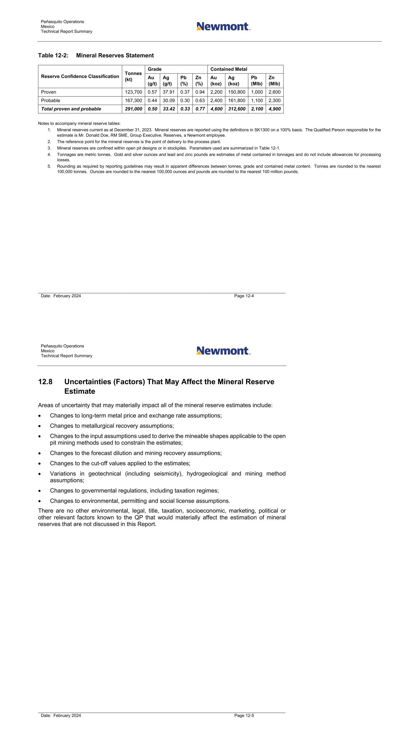 Peñasquito Operations Mexico Technical Report Summary Date: February 2024 Page 12-4 Table 12-2: Mineral Reserves Statement Reserve Confidence Classification Tonnes (kt) Grade Contained Metal Au (g/t) Ag (g/t) Pb (%) Zn (%) Au (koz) Ag (koz) Pb (Mlb) Zn (Mlb) Proven 123,700 0.57 37.91 0.37 0.94 2,200 150,800 1,000 2,600 Probable 167,300 0.44 30.09 0.30 0.63 2,400 161,800 1,100 2,300 Total proven and probable 291,000 0.50 33.42 0.33 0.77 4,600 312,600 2,100 4,900 Notes to accompany mineral reserve tables: 1. Mineral reserves current as at December 31, 2023. Mineral reserves are reported using the definitions in SK1300 on a 100% basis. The Qualified Person responsible for the estimate is Mr. Donald Doe, RM SME, Group Executive, Reserves, a Newmont employee. 2. The reference point for the mineral reserves is the point of delivery to the process plant. 3. Mineral reserves are confined within open pit designs or in stockpiles. Parameters used are summarized in Table 12-1. 4. Tonnages are metric tonnes. Gold and silver ounces and lead and zinc pounds are estimates of metal contained in tonnages and do not include allowances for processing losses. 5. Rounding as required by reporting guidelines may result in apparent differences between tonnes, grade and contained metal content. Tonnes are rounded to the nearest 100,000 tonnes. Ounces are rounded to the nearest 100,000 ounces and pounds are rounded to the nearest 100 million pounds. Peñasquito Operations Mexico Technical Report Summary Date: February 2024 Page 12-5 12.8 Uncertainties (Factors) That May Affect the Mineral Reserve Estimate Areas of uncertainty that may materially impact all of the mineral reserve estimates include: • Changes to long-term metal price and exchange rate assumptions; • Changes to metallurgical recovery assumptions; • Changes to the input assumptions used to derive the mineable shapes applicable to the open pit mining methods used to constrain the estimates; • Changes to the forecast dilution and mining recovery assumptions; • Changes to the cut-off values applied to the estimates; • Variations in geotechnical (including seismicity), hydrogeological and mining method assumptions; • Changes to governmental regulations, including taxation regimes; • Changes to environmental, permitting and social license assumptions. There are no other environmental, legal, title, taxation, socioeconomic, marketing, political or other relevant factors known to the QP that would materially affect the estimation of mineral reserves that are not discussed in this Report.