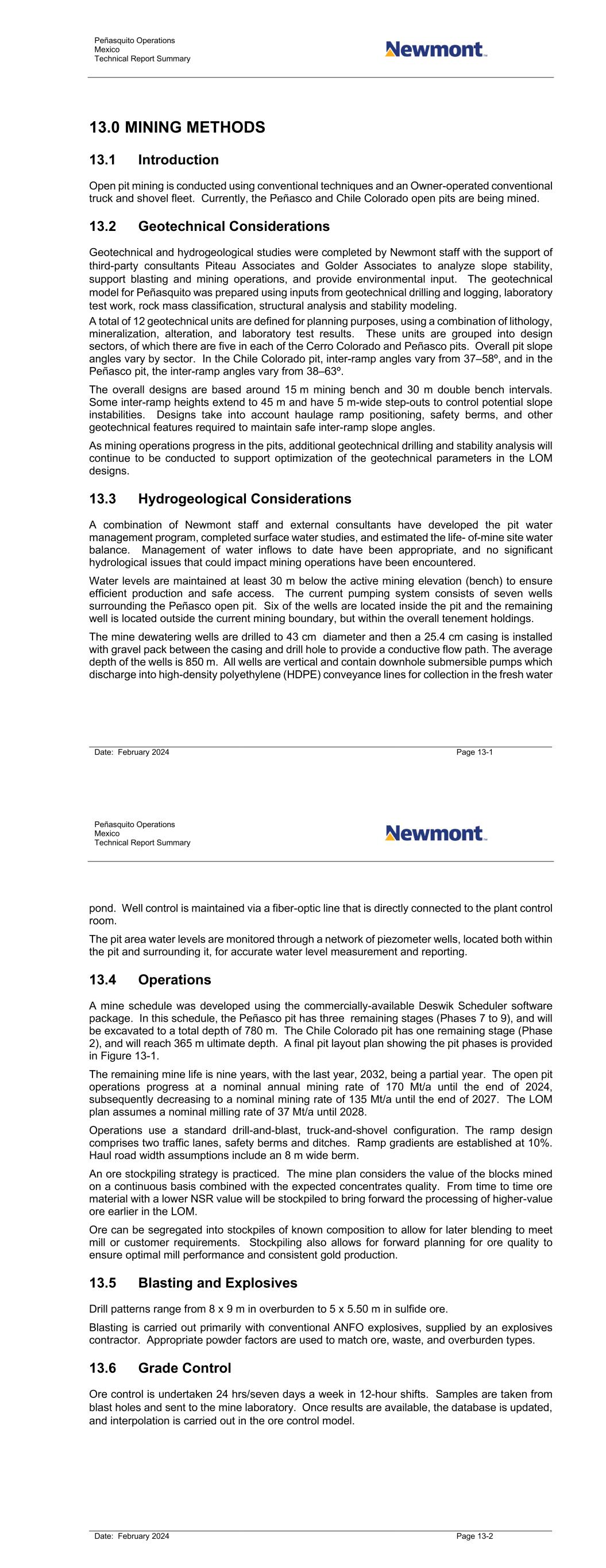 Peñasquito Operations Mexico Technical Report Summary Date: February 2024 Page 13-1 13.0 MINING METHODS 13.1 Introduction Open pit mining is conducted using conventional techniques and an Owner-operated conventional truck and shovel fleet. Currently, the Peñasco and Chile Colorado open pits are being mined. 13.2 Geotechnical Considerations Geotechnical and hydrogeological studies were completed by Newmont staff with the support of third-party consultants Piteau Associates and Golder Associates to analyze slope stability, support blasting and mining operations, and provide environmental input. The geotechnical model for Peñasquito was prepared using inputs from geotechnical drilling and logging, laboratory test work, rock mass classification, structural analysis and stability modeling. A total of 12 geotechnical units are defined for planning purposes, using a combination of lithology, mineralization, alteration, and laboratory test results. These units are grouped into design sectors, of which there are five in each of the Cerro Colorado and Peñasco pits. Overall pit slope angles vary by sector. In the Chile Colorado pit, inter-ramp angles vary from 37–58º, and in the Peñasco pit, the inter-ramp angles vary from 38–63º. The overall designs are based around 15 m mining bench and 30 m double bench intervals. Some inter-ramp heights extend to 45 m and have 5 m-wide step-outs to control potential slope instabilities. Designs take into account haulage ramp positioning, safety berms, and other geotechnical features required to maintain safe inter-ramp slope angles. As mining operations progress in the pits, additional geotechnical drilling and stability analysis will continue to be conducted to support optimization of the geotechnical parameters in the LOM designs. 13.3 Hydrogeological Considerations A combination of Newmont staff and external consultants have developed the pit water management program, completed surface water studies, and estimated the life- of-mine site water balance. Management of water inflows to date have been appropriate, and no significant hydrological issues that could impact mining operations have been encountered. Water levels are maintained at least 30 m below the active mining elevation (bench) to ensure efficient production and safe access. The current pumping system consists of seven wells surrounding the Peñasco open pit. Six of the wells are located inside the pit and the remaining well is located outside the current mining boundary, but within the overall tenement holdings. The mine dewatering wells are drilled to 43 cm diameter and then a 25.4 cm casing is installed with gravel pack between the casing and drill hole to provide a conductive flow path. The average depth of the wells is 850 m. All wells are vertical and contain downhole submersible pumps which discharge into high-density polyethylene (HDPE) conveyance lines for collection in the fresh water Peñasquito Operations Mexico Technical Report Summary Date: February 2024 Page 13-2 pond. Well control is maintained via a fiber-optic line that is directly connected to the plant control room. The pit area water levels are monitored through a network of piezometer wells, located both within the pit and surrounding it, for accurate water level measurement and reporting. 13.4 Operations A mine schedule was developed using the commercially-available Deswik Scheduler software package. In this schedule, the Peñasco pit has three remaining stages (Phases 7 to 9), and will be excavated to a total depth of 780 m. The Chile Colorado pit has one remaining stage (Phase 2), and will reach 365 m ultimate depth. A final pit layout plan showing the pit phases is provided in Figure 13-1. The remaining mine life is nine years, with the last year, 2032, being a partial year. The open pit operations progress at a nominal annual mining rate of 170 Mt/a until the end of 2024, subsequently decreasing to a nominal mining rate of 135 Mt/a until the end of 2027. The LOM plan assumes a nominal milling rate of 37 Mt/a until 2028. Operations use a standard drill-and-blast, truck-and-shovel configuration. The ramp design comprises two traffic lanes, safety berms and ditches. Ramp gradients are established at 10%. Haul road width assumptions include an 8 m wide berm. An ore stockpiling strategy is practiced. The mine plan considers the value of the blocks mined on a continuous basis combined with the expected concentrates quality. From time to time ore material with a lower NSR value will be stockpiled to bring forward the processing of higher-value ore earlier in the LOM. Ore can be segregated into stockpiles of known composition to allow for later blending to meet mill or customer requirements. Stockpiling also allows for forward planning for ore quality to ensure optimal mill performance and consistent gold production. 13.5 Blasting and Explosives Drill patterns range from 8 x 9 m in overburden to 5 x 5.50 m in sulfide ore. Blasting is carried out primarily with conventional ANFO explosives, supplied by an explosives contractor. Appropriate powder factors are used to match ore, waste, and overburden types. 13.6 Grade Control Ore control is undertaken 24 hrs/seven days a week in 12-hour shifts. Samples are taken from blast holes and sent to the mine laboratory. Once results are available, the database is updated, and interpolation is carried out in the ore control model.