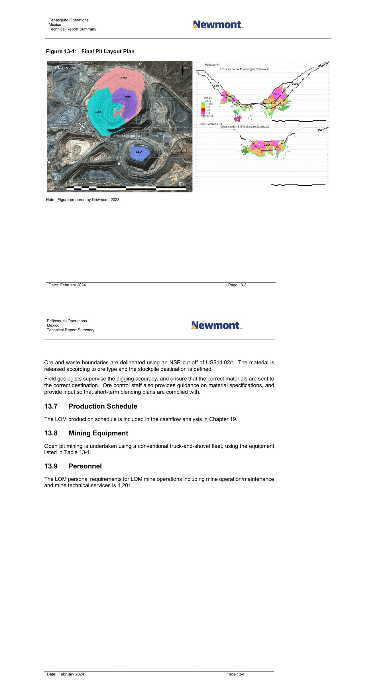 Peñasquito Operations Mexico Technical Report Summary Date: February 2024 Page 13-3 Figure 13-1: Final Pit Layout Plan Note: Figure prepared by Newmont, 2023. Peñasquito Operations Mexico Technical Report Summary Date: February 2024 Page 13-4 Ore and waste boundaries are delineated using an NSR cut-off of US$14.02/t. The material is released according to ore type and the stockpile destination is defined. Field geologists supervise the digging accuracy, and ensure that the correct materials are sent to the correct destination. Ore control staff also provides guidance on material specifications, and provide input so that short-term blending plans are complied with. 13.7 Production Schedule The LOM production schedule is included in the cashflow analysis in Chapter 19. 13.8 Mining Equipment Open pit mining is undertaken using a conventional truck-and-shovel fleet, using the equipment listed in Table 13-1. 13.9 Personnel The LOM personal requirements for LOM mine operations including mine operation/maintenance and mine technical services is 1,201.