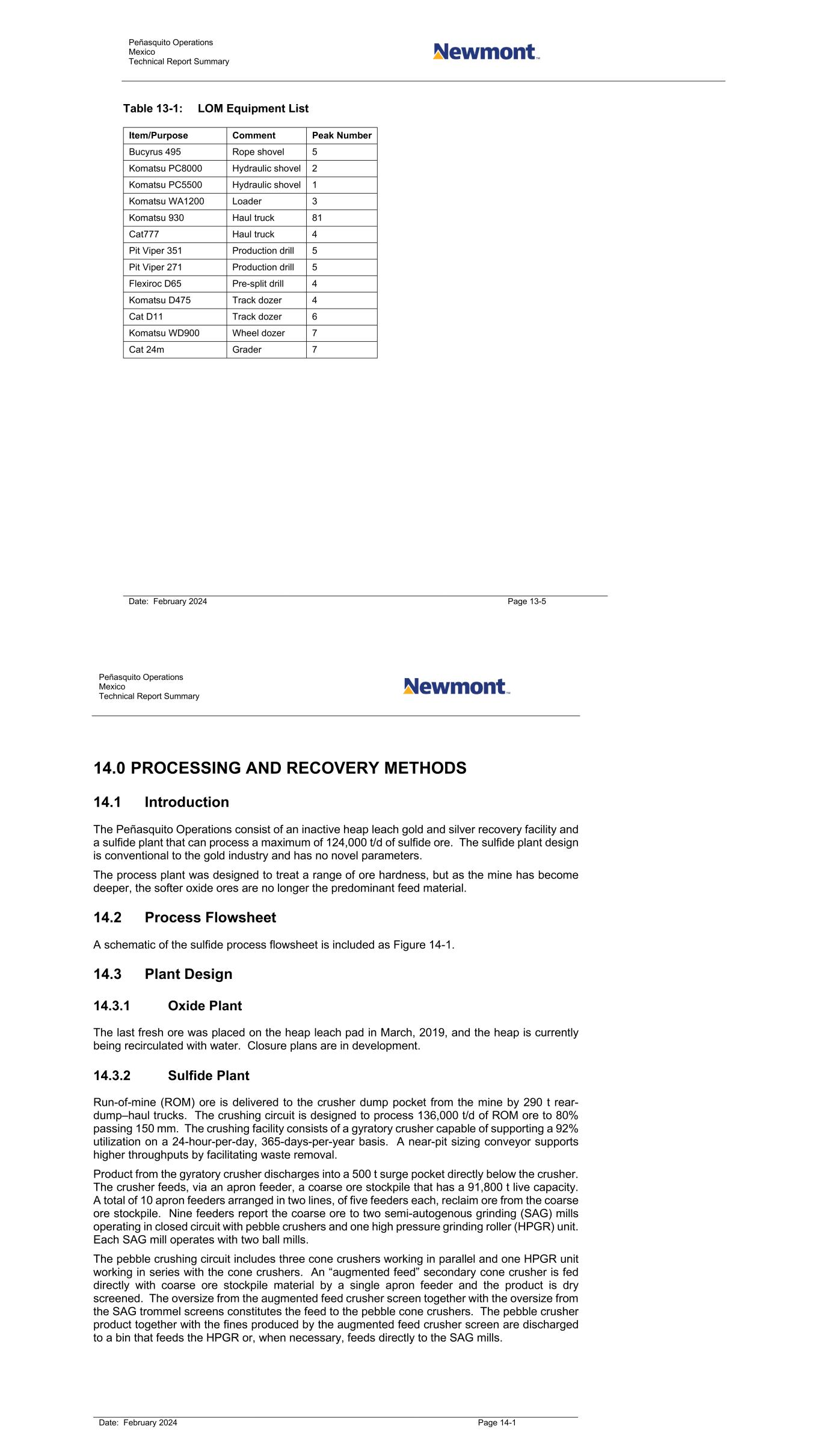 Peñasquito Operations Mexico Technical Report Summary Date: February 2024 Page 13-5 Table 13-1: LOM Equipment List Item/Purpose Comment Peak Number Bucyrus 495 Rope shovel 5 Komatsu PC8000 Hydraulic shovel 2 Komatsu PC5500 Hydraulic shovel 1 Komatsu WA1200 Loader 3 Komatsu 930 Haul truck 81 Cat777 Haul truck 4 Pit Viper 351 Production drill 5 Pit Viper 271 Production drill 5 Flexiroc D65 Pre-split drill 4 Komatsu D475 Track dozer 4 Cat D11 Track dozer 6 Komatsu WD900 Wheel dozer 7 Cat 24m Grader 7 Peñasquito Operations Mexico Technical Report Summary Date: February 2024 Page 14-1 14.0 PROCESSING AND RECOVERY METHODS 14.1 Introduction The Peñasquito Operations consist of an inactive heap leach gold and silver recovery facility and a sulfide plant that can process a maximum of 124,000 t/d of sulfide ore. The sulfide plant design is conventional to the gold industry and has no novel parameters. The process plant was designed to treat a range of ore hardness, but as the mine has become deeper, the softer oxide ores are no longer the predominant feed material. 14.2 Process Flowsheet A schematic of the sulfide process flowsheet is included as Figure 14-1. 14.3 Plant Design 14.3.1 Oxide Plant The last fresh ore was placed on the heap leach pad in March, 2019, and the heap is currently being recirculated with water. Closure plans are in development. 14.3.2 Sulfide Plant Run-of-mine (ROM) ore is delivered to the crusher dump pocket from the mine by 290 t rear- dump–haul trucks. The crushing circuit is designed to process 136,000 t/d of ROM ore to 80% passing 150 mm. The crushing facility consists of a gyratory crusher capable of supporting a 92% utilization on a 24-hour-per-day, 365-days-per-year basis. A near-pit sizing conveyor supports higher throughputs by facilitating waste removal. Product from the gyratory crusher discharges into a 500 t surge pocket directly below the crusher. The crusher feeds, via an apron feeder, a coarse ore stockpile that has a 91,800 t live capacity. A total of 10 apron feeders arranged in two lines, of five feeders each, reclaim ore from the coarse ore stockpile. Nine feeders report the coarse ore to two semi-autogenous grinding (SAG) mills operating in closed circuit with pebble crushers and one high pressure grinding roller (HPGR) unit. Each SAG mill operates with two ball mills. The pebble crushing circuit includes three cone crushers working in parallel and one HPGR unit working in series with the cone crushers. An “augmented feed” secondary cone crusher is fed directly with coarse ore stockpile material by a single apron feeder and the product is dry screened. The oversize from the augmented feed crusher screen together with the oversize from the SAG trommel screens constitutes the feed to the pebble cone crushers. The pebble crusher product together with the fines produced by the augmented feed crusher screen are discharged to a bin that feeds the HPGR or, when necessary, feeds directly to the SAG mills.