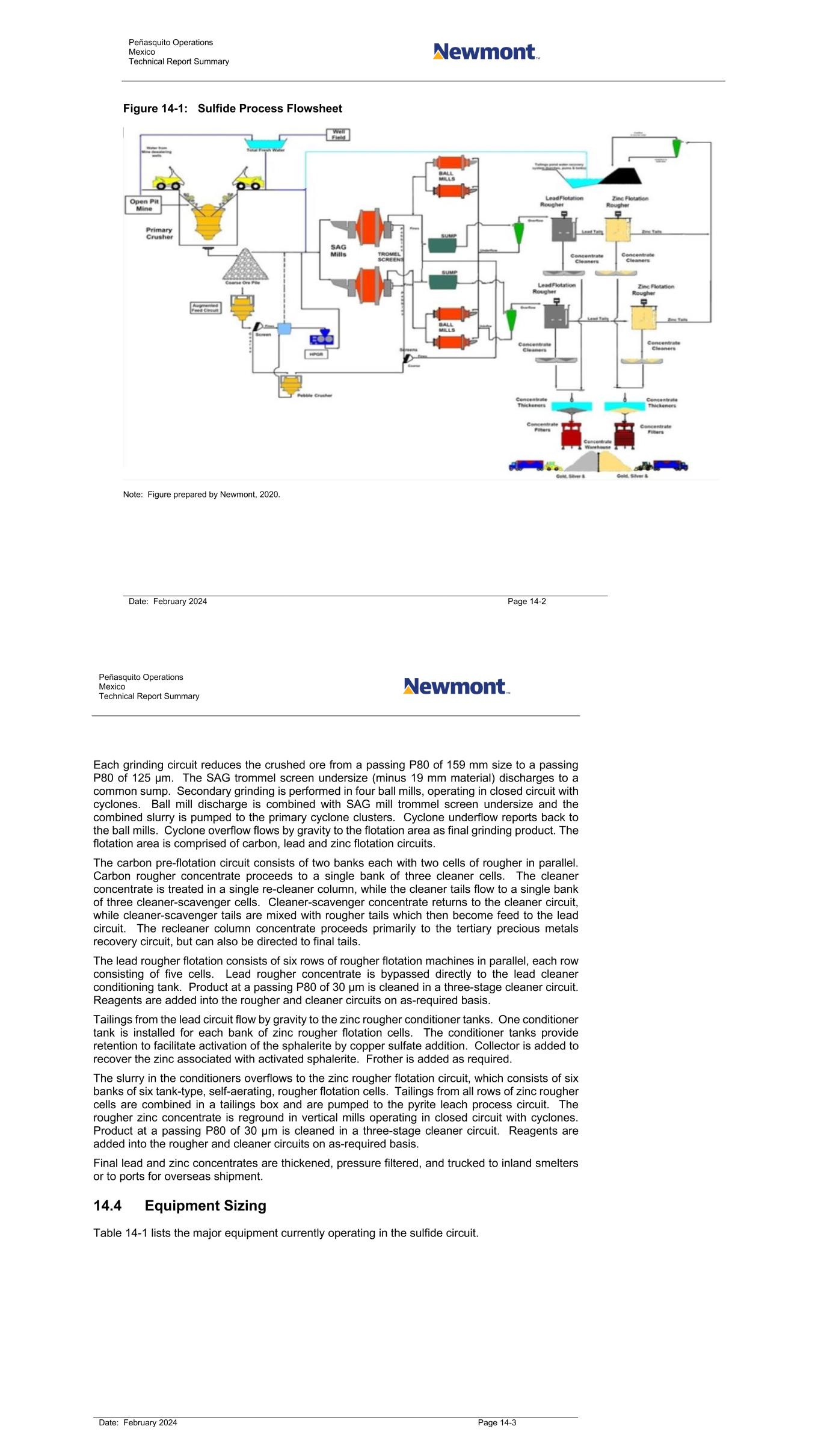 Peñasquito Operations Mexico Technical Report Summary Date: February 2024 Page 14-2 Figure 14-1: Sulfide Process Flowsheet Note: Figure prepared by Newmont, 2020. Peñasquito Operations Mexico Technical Report Summary Date: February 2024 Page 14-3 Each grinding circuit reduces the crushed ore from a passing P80 of 159 mm size to a passing P80 of 125 µm. The SAG trommel screen undersize (minus 19 mm material) discharges to a common sump. Secondary grinding is performed in four ball mills, operating in closed circuit with cyclones. Ball mill discharge is combined with SAG mill trommel screen undersize and the combined slurry is pumped to the primary cyclone clusters. Cyclone underflow reports back to the ball mills. Cyclone overflow flows by gravity to the flotation area as final grinding product. The flotation area is comprised of carbon, lead and zinc flotation circuits. The carbon pre-flotation circuit consists of two banks each with two cells of rougher in parallel. Carbon rougher concentrate proceeds to a single bank of three cleaner cells. The cleaner concentrate is treated in a single re-cleaner column, while the cleaner tails flow to a single bank of three cleaner-scavenger cells. Cleaner-scavenger concentrate returns to the cleaner circuit, while cleaner-scavenger tails are mixed with rougher tails which then become feed to the lead circuit. The recleaner column concentrate proceeds primarily to the tertiary precious metals recovery circuit, but can also be directed to final tails. The lead rougher flotation consists of six rows of rougher flotation machines in parallel, each row consisting of five cells. Lead rougher concentrate is bypassed directly to the lead cleaner conditioning tank. Product at a passing P80 of 30 µm is cleaned in a three-stage cleaner circuit. Reagents are added into the rougher and cleaner circuits on as-required basis. Tailings from the lead circuit flow by gravity to the zinc rougher conditioner tanks. One conditioner tank is installed for each bank of zinc rougher flotation cells. The conditioner tanks provide retention to facilitate activation of the sphalerite by copper sulfate addition. Collector is added to recover the zinc associated with activated sphalerite. Frother is added as required. The slurry in the conditioners overflows to the zinc rougher flotation circuit, which consists of six banks of six tank-type, self-aerating, rougher flotation cells. Tailings from all rows of zinc rougher cells are combined in a tailings box and are pumped to the pyrite leach process circuit. The rougher zinc concentrate is reground in vertical mills operating in closed circuit with cyclones. Product at a passing P80 of 30 µm is cleaned in a three-stage cleaner circuit. Reagents are added into the rougher and cleaner circuits on as-required basis. Final lead and zinc concentrates are thickened, pressure filtered, and trucked to inland smelters or to ports for overseas shipment. 14.4 Equipment Sizing Table 14-1 lists the major equipment currently operating in the sulfide circuit.