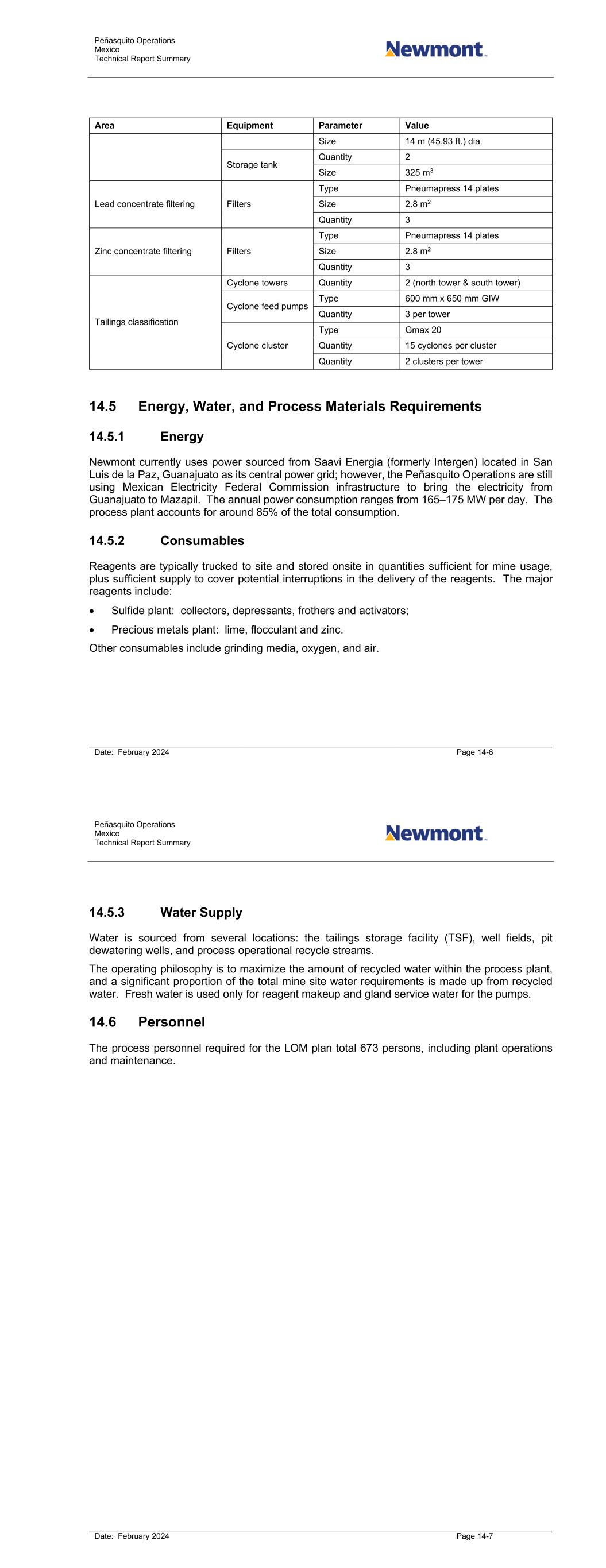 Peñasquito Operations Mexico Technical Report Summary Date: February 2024 Page 14-6 Area Equipment Parameter Value Size 14 m (45.93 ft.) dia Storage tank Quantity 2 Size 325 m3 Lead concentrate filtering Filters Type Pneumapress 14 plates Size 2.8 m2 Quantity 3 Zinc concentrate filtering Filters Type Pneumapress 14 plates Size 2.8 m2 Quantity 3 Tailings classification Cyclone towers Quantity 2 (north tower & south tower) Cyclone feed pumps Type 600 mm x 650 mm GIW Quantity 3 per tower Cyclone cluster Type Gmax 20 Quantity 15 cyclones per cluster Quantity 2 clusters per tower 14.5 Energy, Water, and Process Materials Requirements 14.5.1 Energy Newmont currently uses power sourced from Saavi Energia (formerly Intergen) located in San Luis de la Paz, Guanajuato as its central power grid; however, the Peñasquito Operations are still using Mexican Electricity Federal Commission infrastructure to bring the electricity from Guanajuato to Mazapil. The annual power consumption ranges from 165–175 MW per day. The process plant accounts for around 85% of the total consumption. 14.5.2 Consumables Reagents are typically trucked to site and stored onsite in quantities sufficient for mine usage, plus sufficient supply to cover potential interruptions in the delivery of the reagents. The major reagents include: • Sulfide plant: collectors, depressants, frothers and activators; • Precious metals plant: lime, flocculant and zinc. Other consumables include grinding media, oxygen, and air. Peñasquito Operations Mexico Technical Report Summary Date: February 2024 Page 14-7 14.5.3 Water Supply Water is sourced from several locations: the tailings storage facility (TSF), well fields, pit dewatering wells, and process operational recycle streams. The operating philosophy is to maximize the amount of recycled water within the process plant, and a significant proportion of the total mine site water requirements is made up from recycled water. Fresh water is used only for reagent makeup and gland service water for the pumps. 14.6 Personnel The process personnel required for the LOM plan total 673 persons, including plant operations and maintenance.