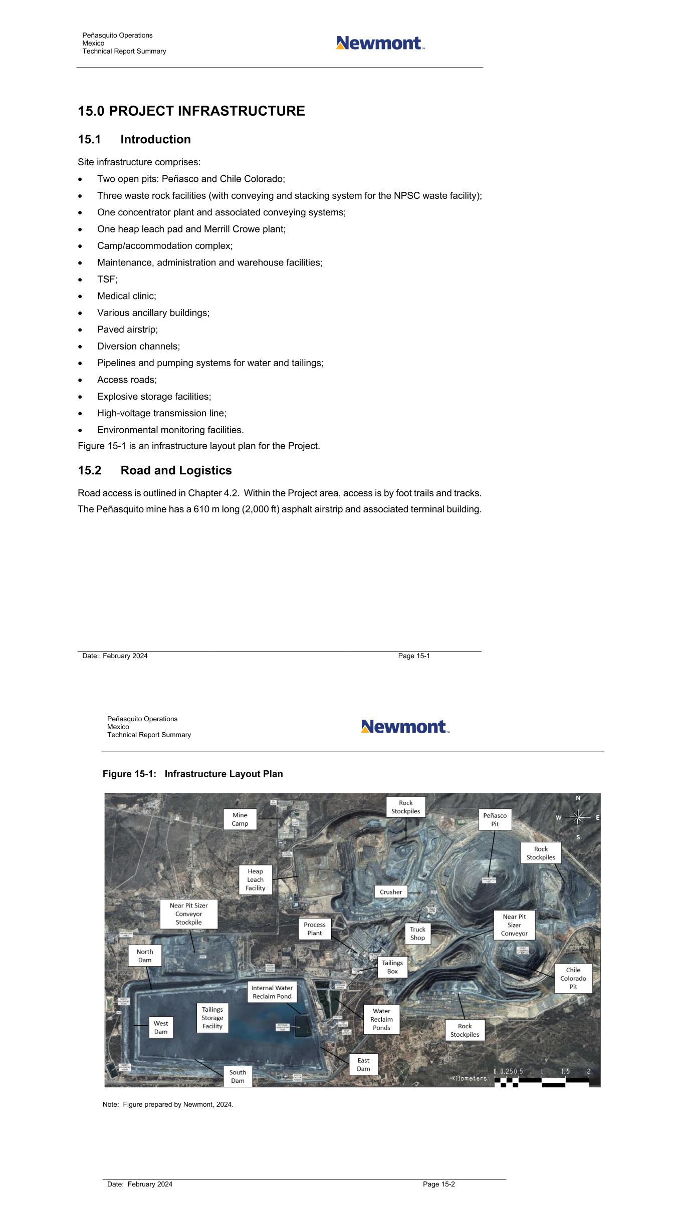 Peñasquito Operations Mexico Technical Report Summary Date: February 2024 Page 15-1 15.0 PROJECT INFRASTRUCTURE 15.1 Introduction Site infrastructure comprises: • Two open pits: Peñasco and Chile Colorado; • Three waste rock facilities (with conveying and stacking system for the NPSC waste facility); • One concentrator plant and associated conveying systems; • One heap leach pad and Merrill Crowe plant; • Camp/accommodation complex; • Maintenance, administration and warehouse facilities; • TSF; • Medical clinic; • Various ancillary buildings; • Paved airstrip; • Diversion channels; • Pipelines and pumping systems for water and tailings; • Access roads; • Explosive storage facilities; • High-voltage transmission line; • Environmental monitoring facilities. Figure 15-1 is an infrastructure layout plan for the Project. 15.2 Road and Logistics Road access is outlined in Chapter 4.2. Within the Project area, access is by foot trails and tracks. The Peñasquito mine has a 610 m long (2,000 ft) asphalt airstrip and associated terminal building. Peñasquito Operations Mexico Technical Report Summary Date: February 2024 Page 15-2 Figure 15-1: Infrastructure Layout Plan Note: Figure prepared by Newmont, 2024.