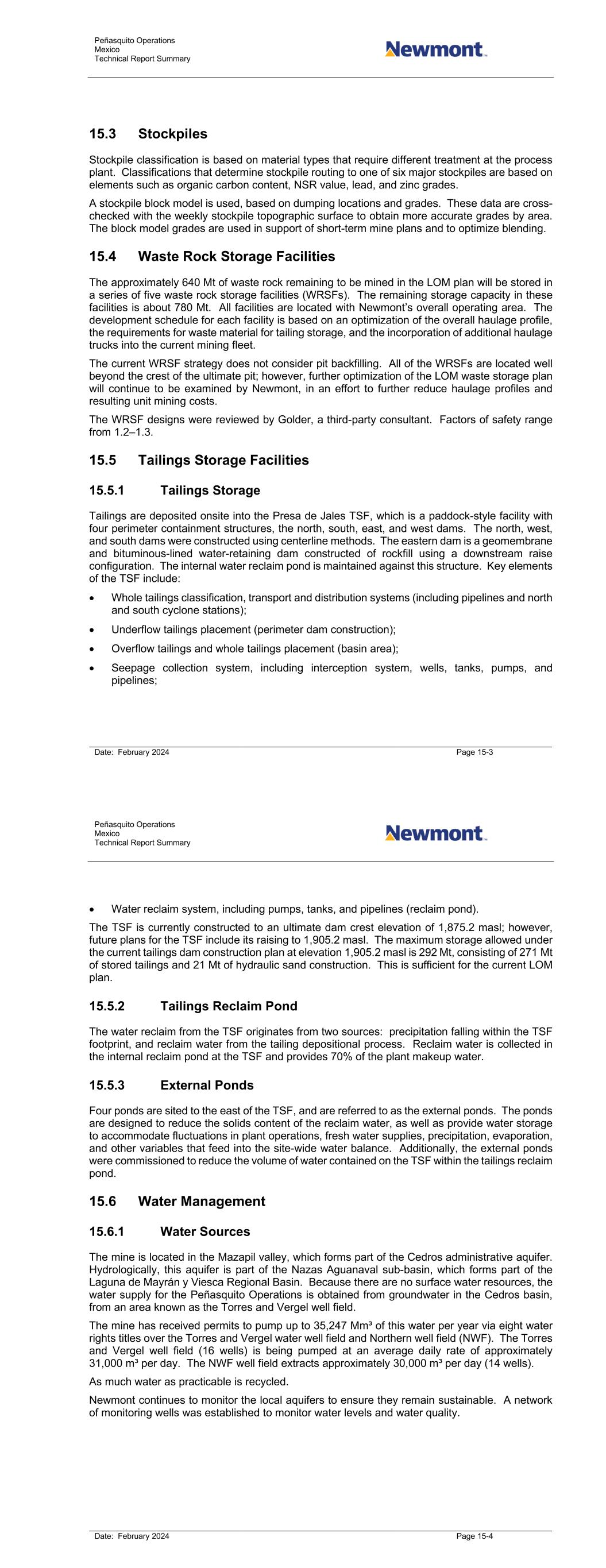 Peñasquito Operations Mexico Technical Report Summary Date: February 2024 Page 15-3 15.3 Stockpiles Stockpile classification is based on material types that require different treatment at the process plant. Classifications that determine stockpile routing to one of six major stockpiles are based on elements such as organic carbon content, NSR value, lead, and zinc grades. A stockpile block model is used, based on dumping locations and grades. These data are cross- checked with the weekly stockpile topographic surface to obtain more accurate grades by area. The block model grades are used in support of short-term mine plans and to optimize blending. 15.4 Waste Rock Storage Facilities The approximately 640 Mt of waste rock remaining to be mined in the LOM plan will be stored in a series of five waste rock storage facilities (WRSFs). The remaining storage capacity in these facilities is about 780 Mt. All facilities are located with Newmont’s overall operating area. The development schedule for each facility is based on an optimization of the overall haulage profile, the requirements for waste material for tailing storage, and the incorporation of additional haulage trucks into the current mining fleet. The current WRSF strategy does not consider pit backfilling. All of the WRSFs are located well beyond the crest of the ultimate pit; however, further optimization of the LOM waste storage plan will continue to be examined by Newmont, in an effort to further reduce haulage profiles and resulting unit mining costs. The WRSF designs were reviewed by Golder, a third-party consultant. Factors of safety range from 1.2–1.3. 15.5 Tailings Storage Facilities 15.5.1 Tailings Storage Tailings are deposited onsite into the Presa de Jales TSF, which is a paddock-style facility with four perimeter containment structures, the north, south, east, and west dams. The north, west, and south dams were constructed using centerline methods. The eastern dam is a geomembrane and bituminous-lined water-retaining dam constructed of rockfill using a downstream raise configuration. The internal water reclaim pond is maintained against this structure. Key elements of the TSF include: • Whole tailings classification, transport and distribution systems (including pipelines and north and south cyclone stations); • Underflow tailings placement (perimeter dam construction); • Overflow tailings and whole tailings placement (basin area); • Seepage collection system, including interception system, wells, tanks, pumps, and pipelines; Peñasquito Operations Mexico Technical Report Summary Date: February 2024 Page 15-4 • Water reclaim system, including pumps, tanks, and pipelines (reclaim pond). The TSF is currently constructed to an ultimate dam crest elevation of 1,875.2 masl; however, future plans for the TSF include its raising to 1,905.2 masl. The maximum storage allowed under the current tailings dam construction plan at elevation 1,905.2 masl is 292 Mt, consisting of 271 Mt of stored tailings and 21 Mt of hydraulic sand construction. This is sufficient for the current LOM plan. 15.5.2 Tailings Reclaim Pond The water reclaim from the TSF originates from two sources: precipitation falling within the TSF footprint, and reclaim water from the tailing depositional process. Reclaim water is collected in the internal reclaim pond at the TSF and provides 70% of the plant makeup water. 15.5.3 External Ponds Four ponds are sited to the east of the TSF, and are referred to as the external ponds. The ponds are designed to reduce the solids content of the reclaim water, as well as provide water storage to accommodate fluctuations in plant operations, fresh water supplies, precipitation, evaporation, and other variables that feed into the site-wide water balance. Additionally, the external ponds were commissioned to reduce the volume of water contained on the TSF within the tailings reclaim pond. 15.6 Water Management 15.6.1 Water Sources The mine is located in the Mazapil valley, which forms part of the Cedros administrative aquifer. Hydrologically, this aquifer is part of the Nazas Aguanaval sub-basin, which forms part of the Laguna de Mayrán y Viesca Regional Basin. Because there are no surface water resources, the water supply for the Peñasquito Operations is obtained from groundwater in the Cedros basin, from an area known as the Torres and Vergel well field. The mine has received permits to pump up to 35,247 Mm³ of this water per year via eight water rights titles over the Torres and Vergel water well field and Northern well field (NWF). The Torres and Vergel well field (16 wells) is being pumped at an average daily rate of approximately 31,000 m³ per day. The NWF well field extracts approximately 30,000 m³ per day (14 wells). As much water as practicable is recycled. Newmont continues to monitor the local aquifers to ensure they remain sustainable. A network of monitoring wells was established to monitor water levels and water quality.