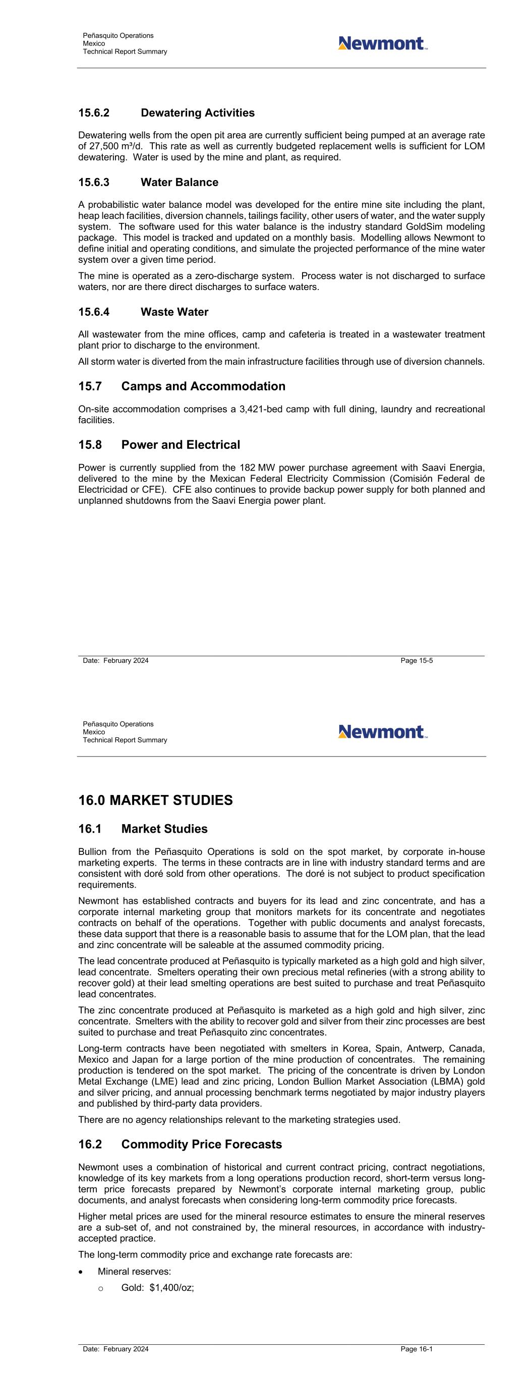 Peñasquito Operations Mexico Technical Report Summary Date: February 2024 Page 15-5 15.6.2 Dewatering Activities Dewatering wells from the open pit area are currently sufficient being pumped at an average rate of 27,500 m³/d. This rate as well as currently budgeted replacement wells is sufficient for LOM dewatering. Water is used by the mine and plant, as required. 15.6.3 Water Balance A probabilistic water balance model was developed for the entire mine site including the plant, heap leach facilities, diversion channels, tailings facility, other users of water, and the water supply system. The software used for this water balance is the industry standard GoldSim modeling package. This model is tracked and updated on a monthly basis. Modelling allows Newmont to define initial and operating conditions, and simulate the projected performance of the mine water system over a given time period. The mine is operated as a zero-discharge system. Process water is not discharged to surface waters, nor are there direct discharges to surface waters. 15.6.4 Waste Water All wastewater from the mine offices, camp and cafeteria is treated in a wastewater treatment plant prior to discharge to the environment. All storm water is diverted from the main infrastructure facilities through use of diversion channels. 15.7 Camps and Accommodation On-site accommodation comprises a 3,421-bed camp with full dining, laundry and recreational facilities. 15.8 Power and Electrical Power is currently supplied from the 182 MW power purchase agreement with Saavi Energia, delivered to the mine by the Mexican Federal Electricity Commission (Comisión Federal de Electricidad or CFE). CFE also continues to provide backup power supply for both planned and unplanned shutdowns from the Saavi Energia power plant. Peñasquito Operations Mexico Technical Report Summary Date: February 2024 Page 16-1 16.0 MARKET STUDIES 16.1 Market Studies Bullion from the Peñasquito Operations is sold on the spot market, by corporate in-house marketing experts. The terms in these contracts are in line with industry standard terms and are consistent with doré sold from other operations. The doré is not subject to product specification requirements. Newmont has established contracts and buyers for its lead and zinc concentrate, and has a corporate internal marketing group that monitors markets for its concentrate and negotiates contracts on behalf of the operations. Together with public documents and analyst forecasts, these data support that there is a reasonable basis to assume that for the LOM plan, that the lead and zinc concentrate will be saleable at the assumed commodity pricing. The lead concentrate produced at Peñasquito is typically marketed as a high gold and high silver, lead concentrate. Smelters operating their own precious metal refineries (with a strong ability to recover gold) at their lead smelting operations are best suited to purchase and treat Peñasquito lead concentrates. The zinc concentrate produced at Peñasquito is marketed as a high gold and high silver, zinc concentrate. Smelters with the ability to recover gold and silver from their zinc processes are best suited to purchase and treat Peñasquito zinc concentrates. Long-term contracts have been negotiated with smelters in Korea, Spain, Antwerp, Canada, Mexico and Japan for a large portion of the mine production of concentrates. The remaining production is tendered on the spot market. The pricing of the concentrate is driven by London Metal Exchange (LME) lead and zinc pricing, London Bullion Market Association (LBMA) gold and silver pricing, and annual processing benchmark terms negotiated by major industry players and published by third-party data providers. There are no agency relationships relevant to the marketing strategies used. 16.2 Commodity Price Forecasts Newmont uses a combination of historical and current contract pricing, contract negotiations, knowledge of its key markets from a long operations production record, short-term versus long- term price forecasts prepared by Newmont’s corporate internal marketing group, public documents, and analyst forecasts when considering long-term commodity price forecasts. Higher metal prices are used for the mineral resource estimates to ensure the mineral reserves are a sub-set of, and not constrained by, the mineral resources, in accordance with industry- accepted practice. The long-term commodity price and exchange rate forecasts are: • Mineral reserves: o Gold: $1,400/oz;