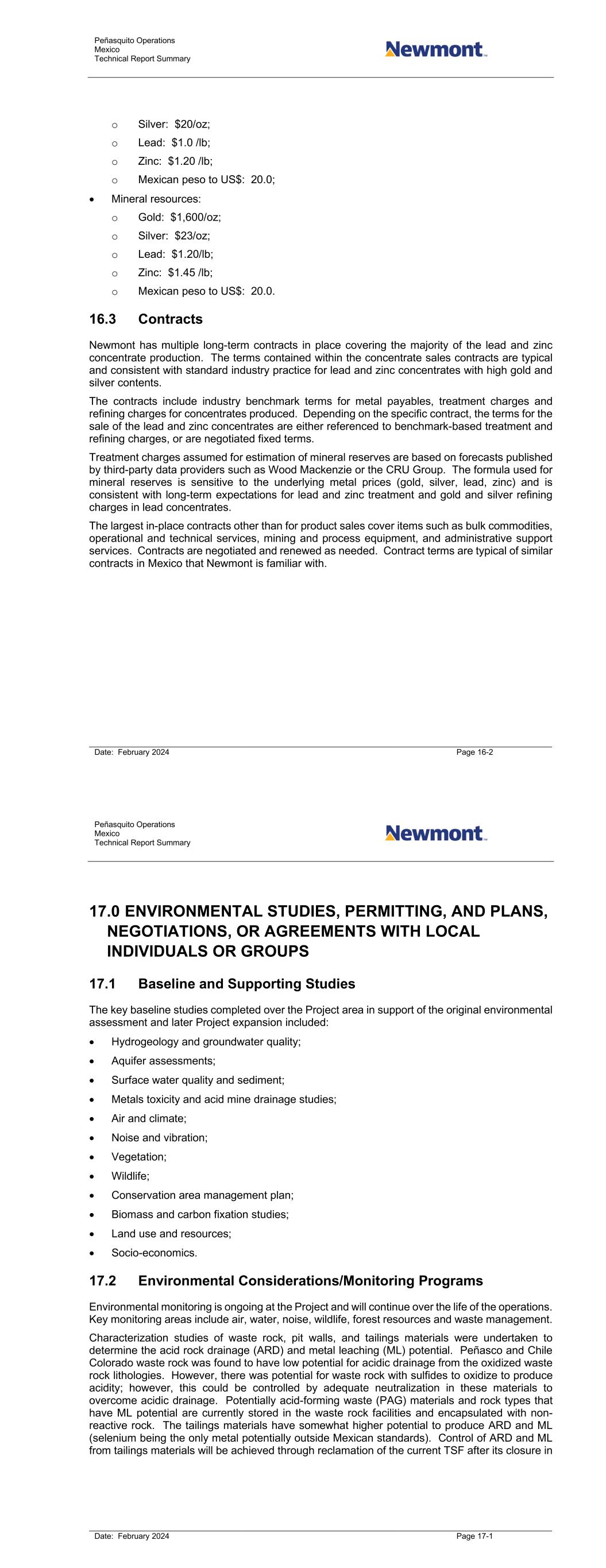 Peñasquito Operations Mexico Technical Report Summary Date: February 2024 Page 16-2 o Silver: $20/oz; o Lead: $1.0 /lb; o Zinc: $1.20 /lb; o Mexican peso to US$: 20.0; • Mineral resources: o Gold: $1,600/oz; o Silver: $23/oz; o Lead: $1.20/lb; o Zinc: $1.45 /lb; o Mexican peso to US$: 20.0. 16.3 Contracts Newmont has multiple long-term contracts in place covering the majority of the lead and zinc concentrate production. The terms contained within the concentrate sales contracts are typical and consistent with standard industry practice for lead and zinc concentrates with high gold and silver contents. The contracts include industry benchmark terms for metal payables, treatment charges and refining charges for concentrates produced. Depending on the specific contract, the terms for the sale of the lead and zinc concentrates are either referenced to benchmark-based treatment and refining charges, or are negotiated fixed terms. Treatment charges assumed for estimation of mineral reserves are based on forecasts published by third-party data providers such as Wood Mackenzie or the CRU Group. The formula used for mineral reserves is sensitive to the underlying metal prices (gold, silver, lead, zinc) and is consistent with long-term expectations for lead and zinc treatment and gold and silver refining charges in lead concentrates. The largest in-place contracts other than for product sales cover items such as bulk commodities, operational and technical services, mining and process equipment, and administrative support services. Contracts are negotiated and renewed as needed. Contract terms are typical of similar contracts in Mexico that Newmont is familiar with. Peñasquito Operations Mexico Technical Report Summary Date: February 2024 Page 17-1 17.0 ENVIRONMENTAL STUDIES, PERMITTING, AND PLANS, NEGOTIATIONS, OR AGREEMENTS WITH LOCAL INDIVIDUALS OR GROUPS 17.1 Baseline and Supporting Studies The key baseline studies completed over the Project area in support of the original environmental assessment and later Project expansion included: • Hydrogeology and groundwater quality; • Aquifer assessments; • Surface water quality and sediment; • Metals toxicity and acid mine drainage studies; • Air and climate; • Noise and vibration; • Vegetation; • Wildlife; • Conservation area management plan; • Biomass and carbon fixation studies; • Land use and resources; • Socio-economics. 17.2 Environmental Considerations/Monitoring Programs Environmental monitoring is ongoing at the Project and will continue over the life of the operations. Key monitoring areas include air, water, noise, wildlife, forest resources and waste management. Characterization studies of waste rock, pit walls, and tailings materials were undertaken to determine the acid rock drainage (ARD) and metal leaching (ML) potential. Peñasco and Chile Colorado waste rock was found to have low potential for acidic drainage from the oxidized waste rock lithologies. However, there was potential for waste rock with sulfides to oxidize to produce acidity; however, this could be controlled by adequate neutralization in these materials to overcome acidic drainage. Potentially acid-forming waste (PAG) materials and rock types that have ML potential are currently stored in the waste rock facilities and encapsulated with non- reactive rock. The tailings materials have somewhat higher potential to produce ARD and ML (selenium being the only metal potentially outside Mexican standards). Control of ARD and ML from tailings materials will be achieved through reclamation of the current TSF after its closure in