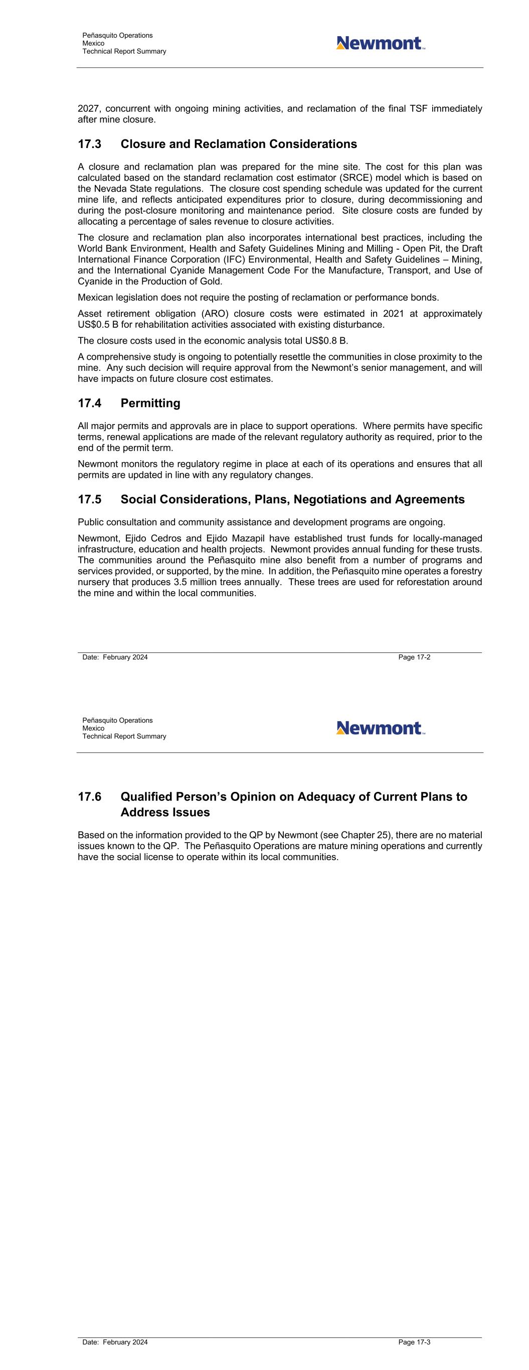 Peñasquito Operations Mexico Technical Report Summary Date: February 2024 Page 17-2 2027, concurrent with ongoing mining activities, and reclamation of the final TSF immediately after mine closure. 17.3 Closure and Reclamation Considerations A closure and reclamation plan was prepared for the mine site. The cost for this plan was calculated based on the standard reclamation cost estimator (SRCE) model which is based on the Nevada State regulations. The closure cost spending schedule was updated for the current mine life, and reflects anticipated expenditures prior to closure, during decommissioning and during the post-closure monitoring and maintenance period. Site closure costs are funded by allocating a percentage of sales revenue to closure activities. The closure and reclamation plan also incorporates international best practices, including the World Bank Environment, Health and Safety Guidelines Mining and Milling - Open Pit, the Draft International Finance Corporation (IFC) Environmental, Health and Safety Guidelines – Mining, and the International Cyanide Management Code For the Manufacture, Transport, and Use of Cyanide in the Production of Gold. Mexican legislation does not require the posting of reclamation or performance bonds. Asset retirement obligation (ARO) closure costs were estimated in 2021 at approximately US$0.5 B for rehabilitation activities associated with existing disturbance. The closure costs used in the economic analysis total US$0.8 B. A comprehensive study is ongoing to potentially resettle the communities in close proximity to the mine. Any such decision will require approval from the Newmont’s senior management, and will have impacts on future closure cost estimates. 17.4 Permitting All major permits and approvals are in place to support operations. Where permits have specific terms, renewal applications are made of the relevant regulatory authority as required, prior to the end of the permit term. Newmont monitors the regulatory regime in place at each of its operations and ensures that all permits are updated in line with any regulatory changes. 17.5 Social Considerations, Plans, Negotiations and Agreements Public consultation and community assistance and development programs are ongoing. Newmont, Ejido Cedros and Ejido Mazapil have established trust funds for locally-managed infrastructure, education and health projects. Newmont provides annual funding for these trusts. The communities around the Peñasquito mine also benefit from a number of programs and services provided, or supported, by the mine. In addition, the Peñasquito mine operates a forestry nursery that produces 3.5 million trees annually. These trees are used for reforestation around the mine and within the local communities. Peñasquito Operations Mexico Technical Report Summary Date: February 2024 Page 17-3 17.6 Qualified Person’s Opinion on Adequacy of Current Plans to Address Issues Based on the information provided to the QP by Newmont (see Chapter 25), there are no material issues known to the QP. The Peñasquito Operations are mature mining operations and currently have the social license to operate within its local communities.