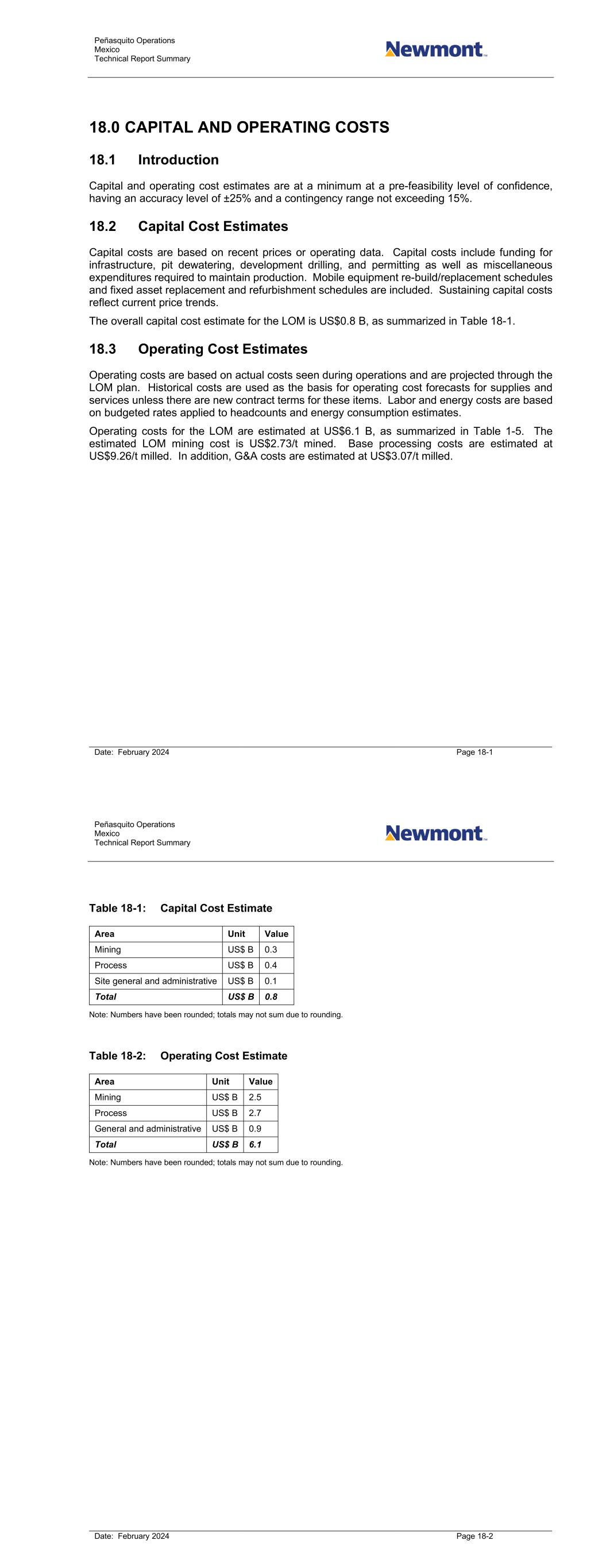 Peñasquito Operations Mexico Technical Report Summary Date: February 2024 Page 18-1 18.0 CAPITAL AND OPERATING COSTS 18.1 Introduction Capital and operating cost estimates are at a minimum at a pre-feasibility level of confidence, having an accuracy level of ±25% and a contingency range not exceeding 15%. 18.2 Capital Cost Estimates Capital costs are based on recent prices or operating data. Capital costs include funding for infrastructure, pit dewatering, development drilling, and permitting as well as miscellaneous expenditures required to maintain production. Mobile equipment re-build/replacement schedules and fixed asset replacement and refurbishment schedules are included. Sustaining capital costs reflect current price trends. The overall capital cost estimate for the LOM is US$0.8 B, as summarized in Table 18-1. 18.3 Operating Cost Estimates Operating costs are based on actual costs seen during operations and are projected through the LOM plan. Historical costs are used as the basis for operating cost forecasts for supplies and services unless there are new contract terms for these items. Labor and energy costs are based on budgeted rates applied to headcounts and energy consumption estimates. Operating costs for the LOM are estimated at US$6.1 B, as summarized in Table 1-5. The estimated LOM mining cost is US$2.73/t mined. Base processing costs are estimated at US$9.26/t milled. In addition, G&A costs are estimated at US$3.07/t milled. Peñasquito Operations Mexico Technical Report Summary Date: February 2024 Page 18-2 Table 18-1: Capital Cost Estimate Area Unit Value Mining US$ B 0.3 Process US$ B 0.4 Site general and administrative US$ B 0.1 Total US$ B 0.8 Note: Numbers have been rounded; totals may not sum due to rounding. Table 18-2: Operating Cost Estimate Area Unit Value Mining US$ B 2.5 Process US$ B 2.7 General and administrative US$ B 0.9 Total US$ B 6.1 Note: Numbers have been rounded; totals may not sum due to rounding.