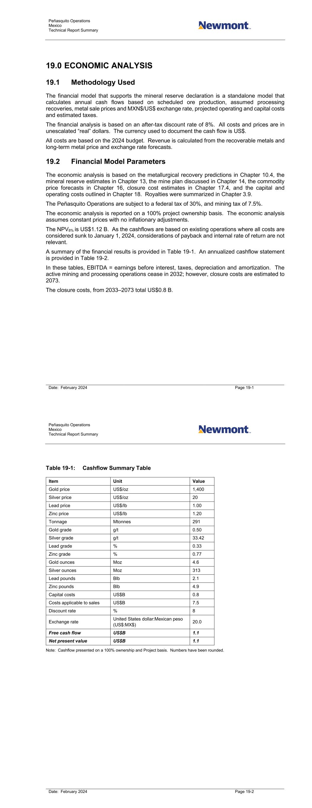 Peñasquito Operations Mexico Technical Report Summary Date: February 2024 Page 19-1 19.0 ECONOMIC ANALYSIS 19.1 Methodology Used The financial model that supports the mineral reserve declaration is a standalone model that calculates annual cash flows based on scheduled ore production, assumed processing recoveries, metal sale prices and MXN$/US$ exchange rate, projected operating and capital costs and estimated taxes. The financial analysis is based on an after-tax discount rate of 8%. All costs and prices are in unescalated “real” dollars. The currency used to document the cash flow is US$. All costs are based on the 2024 budget. Revenue is calculated from the recoverable metals and long-term metal price and exchange rate forecasts. 19.2 Financial Model Parameters The economic analysis is based on the metallurgical recovery predictions in Chapter 10.4, the mineral reserve estimates in Chapter 13, the mine plan discussed in Chapter 14, the commodity price forecasts in Chapter 16, closure cost estimates in Chapter 17.4, and the capital and operating costs outlined in Chapter 18. Royalties were summarized in Chapter 3.9. The Peñasquito Operations are subject to a federal tax of 30%, and mining tax of 7.5%. The economic analysis is reported on a 100% project ownership basis. The economic analysis assumes constant prices with no inflationary adjustments. The NPV8% is US$1.12 B. As the cashflows are based on existing operations where all costs are considered sunk to January 1, 2024, considerations of payback and internal rate of return are not relevant. A summary of the financial results is provided in Table 19-1. An annualized cashflow statement is provided in Table 19-2. In these tables, EBITDA = earnings before interest, taxes, depreciation and amortization. The active mining and processing operations cease in 2032; however, closure costs are estimated to 2073. The closure costs, from 2033–2073 total US$0.8 B. Peñasquito Operations Mexico Technical Report Summary Date: February 2024 Page 19-2 Table 19-1: Cashflow Summary Table Item Unit Value Gold price US$/oz 1,400 Silver price US$/oz 20 Lead price US$/lb 1.00 Zinc price US$/lb 1.20 Tonnage Mtonnes 291 Gold grade g/t 0.50 Silver grade g/t 33.42 Lead grade % 0.33 Zinc grade % 0.77 Gold ounces Moz 4.6 Silver ounces Moz 313 Lead pounds Blb 2.1 Zinc pounds Blb 4.9 Capital costs US$B 0.8 Costs applicable to sales US$B 7.5 Discount rate % 8 Exchange rate United States dollar:Mexican peso (US$:MX$) 20.0 Free cash flow US$B 1.1 Net present value US$B 1.1 Note: Cashflow presented on a 100% ownership and Project basis. Numbers have been rounded.