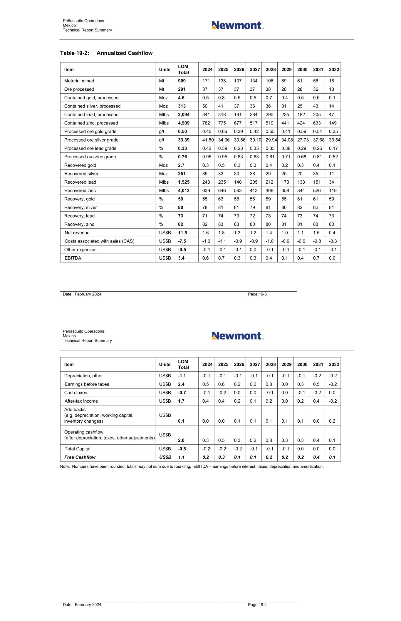 Peñasquito Operations Mexico Technical Report Summary Date: February 2024 Page 19-3 Table 19-2: Annualized Cashflow Item Units LOM Total 2024 2025 2026 2027 2028 2029 2030 2031 2032 Material mined Mt 909 171 138 137 134 106 89 61 56 18 Ore processed Mt 291 37 37 37 37 38 28 28 36 13 Contained gold, processed Moz 4.6 0.5 0.8 0.5 0.5 0.7 0.4 0.5 0.6 0.1 Contained silver, processed Moz 313 50 41 37 36 36 31 25 43 14 Contained lead, processed Mlbs 2,094 341 318 191 284 290 235 182 205 47 Contained zinc, processed Mlbs 4,909 782 775 677 517 510 441 424 633 149 Processed ore gold grade g/t 0.50 0.45 0.66 0.39 0.42 0.55 0.41 0.59 0.54 0.35 Processed ore silver grade g/t 33.39 41.80 34.06 30.66 30.10 29.94 34.08 27.73 37.68 33.54 Processed ore lead grade % 0.33 0.42 0.39 0.23 0.35 0.35 0.38 0.29 0.26 0.17 Processed ore zinc grade % 0.76 0.95 0.95 0.83 0.63 0.61 0.71 0.68 0.81 0.52 Recovered gold Moz 2.7 0.3 0.5 0.3 0.3 0.4 0.2 0.3 0.4 0.1 Recovered silver Moz 251 39 33 30 28 29 25 20 35 11 Recovered lead Mlbs 1,525 243 235 140 205 212 173 133 151 34 Recovered zinc Mlbs 4,013 639 646 563 413 406 358 344 526 119 Recovery, gold % 59 55 63 58 56 59 55 61 61 59 Recovery, silver % 80 78 81 81 79 81 80 82 82 81 Recovery, lead % 73 71 74 73 72 73 74 73 74 73 Recovery, zinc % 82 82 83 83 80 80 81 81 83 80 Net revenue US$B 11.5 1.6 1.8 1.3 1.2 1.4 1.0 1.1 1.5 0.4 Costs associated with sales (CAS) US$B -7.5 -1.0 -1.1 -0.9 -0.9 -1.0 -0.9 -0.6 -0.8 -0.3 Other expenses US$B -0.5 -0.1 -0.1 -0.1 0.0 -0.1 -0.1 -0.1 -0.1 -0.1 EBITDA US$B 3.4 0.6 0.7 0.3 0.3 0.4 0.1 0.4 0.7 0.0 Peñasquito Operations Mexico Technical Report Summary Date: February 2024 Page 19-4 Item Units LOM Total 2024 2025 2026 2027 2028 2029 2030 2031 2032 Depreciation, other US$B -1.1 -0.1 -0.1 -0.1 -0.1 -0.1 -0.1 -0.1 -0.2 -0.2 Earnings before taxes US$B 2.4 0.5 0.6 0.2 0.2 0.3 0.0 0.3 0.5 -0.2 Cash taxes US$B -0.7 -0.1 -0.2 0.0 0.0 -0.1 0.0 -0.1 -0.2 0.0 After-tax income US$B 1.7 0.4 0.4 0.2 0.1 0.2 0.0 0.2 0.4 -0.2 Add backs (e.g. depreciation, working capital, inventory changes) US$B 0.1 0.0 0.0 0.1 0.1 0.1 0.1 0.1 0.0 0.2 Operating cashflow (after depreciation, taxes, other adjustments) US$B 2.0 0.3 0.5 0.3 0.2 0.3 0.3 0.3 0.4 0.1 Total Capital US$B -0.8 -0.2 -0.2 -0.2 -0.1 -0.1 -0.1 0.0 0.0 0.0 Free Cashflow US$B 1.1 0.2 0.3 0.1 0.1 0.2 0.2 0.2 0.4 0.1 Note: Numbers have been rounded; totals may not sum due to rounding. EBITDA = earnings before interest, taxes, depreciation and amortization.