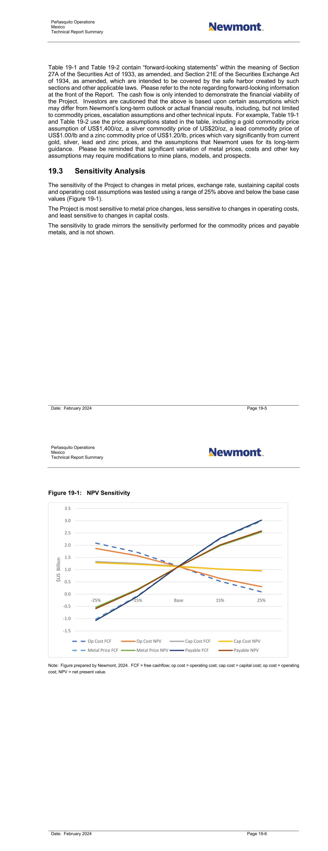 Peñasquito Operations Mexico Technical Report Summary Date: February 2024 Page 19-5 Table 19-1 and Table 19-2 contain “forward-looking statements” within the meaning of Section 27A of the Securities Act of 1933, as amended, and Section 21E of the Securities Exchange Act of 1934, as amended, which are intended to be covered by the safe harbor created by such sections and other applicable laws. Please refer to the note regarding forward-looking information at the front of the Report. The cash flow is only intended to demonstrate the financial viability of the Project. Investors are cautioned that the above is based upon certain assumptions which may differ from Newmont’s long-term outlook or actual financial results, including, but not limited to commodity prices, escalation assumptions and other technical inputs. For example, Table 19-1 and Table 19-2 use the price assumptions stated in the table, including a gold commodity price assumption of US$1,400/oz, a silver commodity price of US$20/oz, a lead commodity price of US$1.00/lb and a zinc commodity price of US$1.20/lb, prices which vary significantly from current gold, silver, lead and zinc prices, and the assumptions that Newmont uses for its long-term guidance. Please be reminded that significant variation of metal prices, costs and other key assumptions may require modifications to mine plans, models, and prospects. 19.3 Sensitivity Analysis The sensitivity of the Project to changes in metal prices, exchange rate, sustaining capital costs and operating cost assumptions was tested using a range of 25% above and below the base case values (Figure 19-1). The Project is most sensitive to metal price changes, less sensitive to changes in operating costs, and least sensitive to changes in capital costs. The sensitivity to grade mirrors the sensitivity performed for the commodity prices and payable metals, and is not shown. Peñasquito Operations Mexico Technical Report Summary Date: February 2024 Page 19-6 Figure 19-1: NPV Sensitivity Note: Figure prepared by Newmont, 2024. FCF = free cashflow; op cost = operating cost; cap cost = capital cost; op cost = operating cost; NPV = net present value. -1.5 -1.0 -0.5 0.0 0.5 1.0 1.5 2.0 2.5 3.0 3.5 -25% -15% Base 15% 25% $U S B ill io n Op Cost FCF Op Cost NPV Cap Cost FCF Cap Cost NPV Metal Price FCF Metal Price NPV Payable FCF Payable NPV