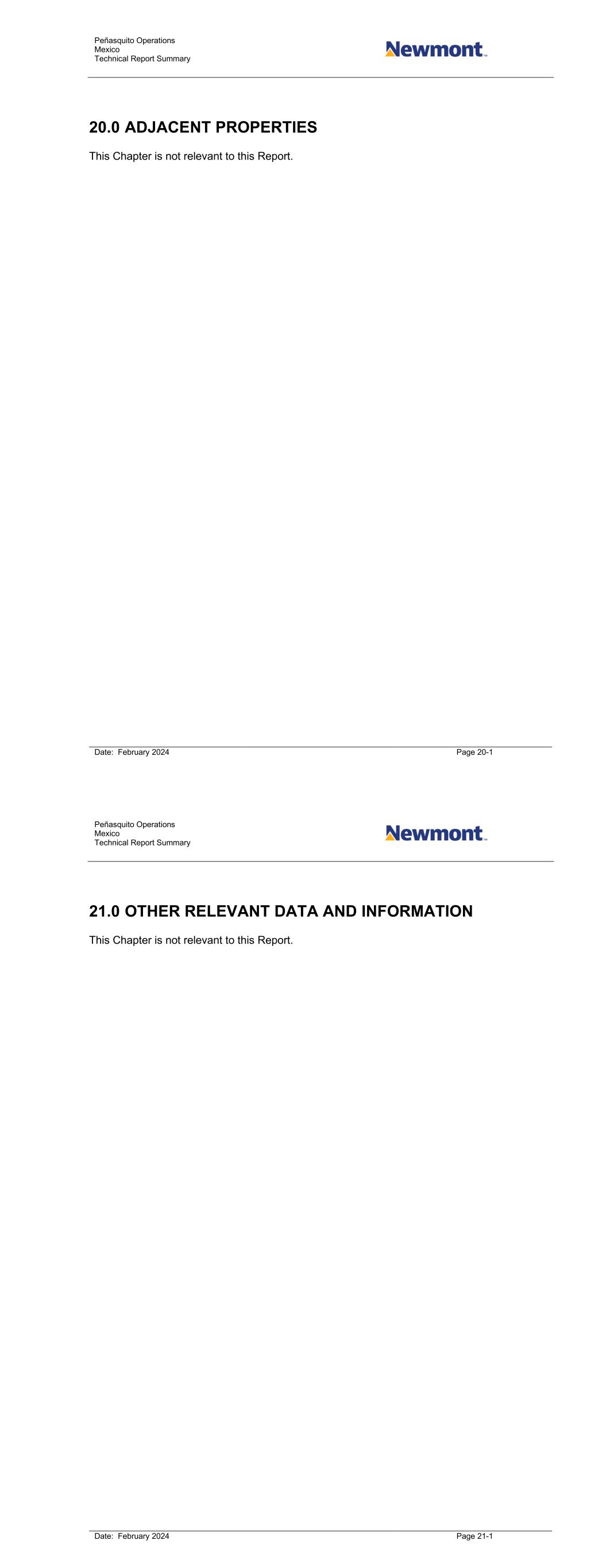 Peñasquito Operations Mexico Technical Report Summary Date: February 2024 Page 20-1 20.0 ADJACENT PROPERTIES This Chapter is not relevant to this Report. Peñasquito Operations Mexico Technical Report Summary Date: February 2024 Page 21-1 21.0 OTHER RELEVANT DATA AND INFORMATION This Chapter is not relevant to this Report.
