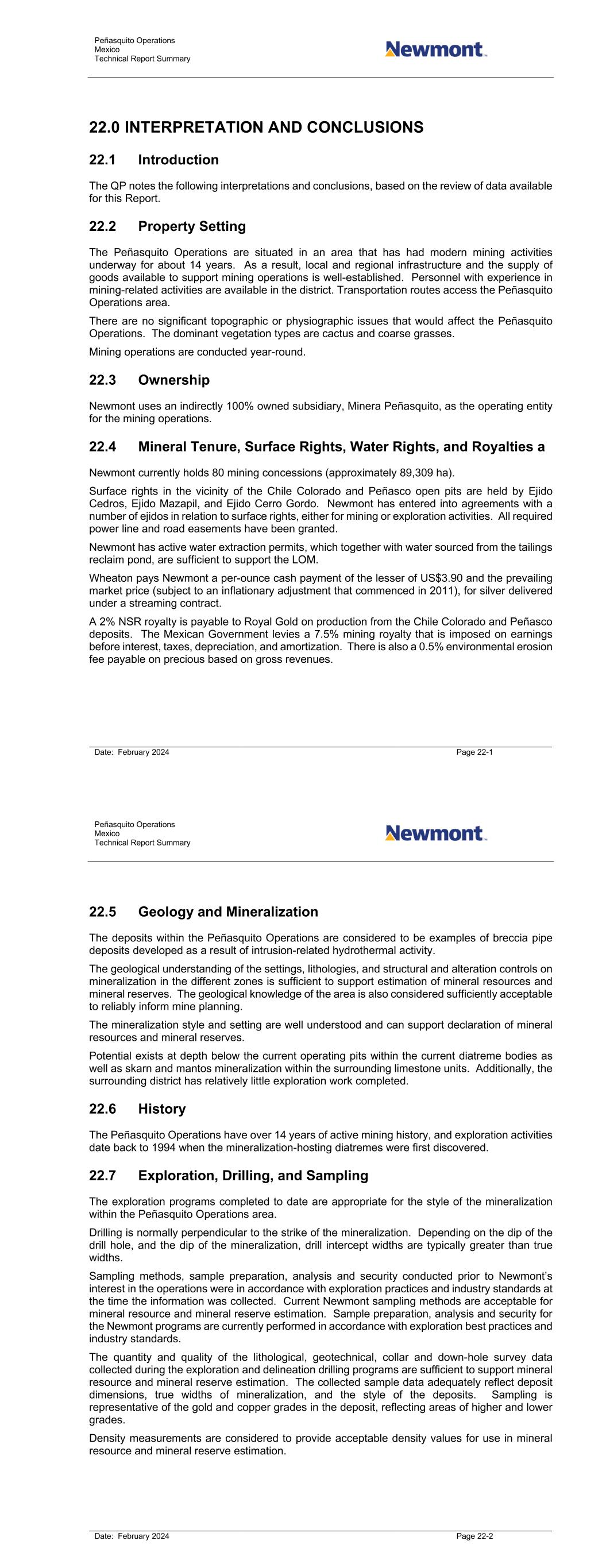 Peñasquito Operations Mexico Technical Report Summary Date: February 2024 Page 22-1 22.0 INTERPRETATION AND CONCLUSIONS 22.1 Introduction The QP notes the following interpretations and conclusions, based on the review of data available for this Report. 22.2 Property Setting The Peñasquito Operations are situated in an area that has had modern mining activities underway for about 14 years. As a result, local and regional infrastructure and the supply of goods available to support mining operations is well-established. Personnel with experience in mining-related activities are available in the district. Transportation routes access the Peñasquito Operations area. There are no significant topographic or physiographic issues that would affect the Peñasquito Operations. The dominant vegetation types are cactus and coarse grasses. Mining operations are conducted year-round. 22.3 Ownership Newmont uses an indirectly 100% owned subsidiary, Minera Peñasquito, as the operating entity for the mining operations. 22.4 Mineral Tenure, Surface Rights, Water Rights, and Royalties a Newmont currently holds 80 mining concessions (approximately 89,309 ha). Surface rights in the vicinity of the Chile Colorado and Peñasco open pits are held by Ejido Cedros, Ejido Mazapil, and Ejido Cerro Gordo. Newmont has entered into agreements with a number of ejidos in relation to surface rights, either for mining or exploration activities. All required power line and road easements have been granted. Newmont has active water extraction permits, which together with water sourced from the tailings reclaim pond, are sufficient to support the LOM. Wheaton pays Newmont a per-ounce cash payment of the lesser of US$3.90 and the prevailing market price (subject to an inflationary adjustment that commenced in 2011), for silver delivered under a streaming contract. A 2% NSR royalty is payable to Royal Gold on production from the Chile Colorado and Peñasco deposits. The Mexican Government levies a 7.5% mining royalty that is imposed on earnings before interest, taxes, depreciation, and amortization. There is also a 0.5% environmental erosion fee payable on precious based on gross revenues. Peñasquito Operations Mexico Technical Report Summary Date: February 2024 Page 22-2 22.5 Geology and Mineralization The deposits within the Peñasquito Operations are considered to be examples of breccia pipe deposits developed as a result of intrusion-related hydrothermal activity. The geological understanding of the settings, lithologies, and structural and alteration controls on mineralization in the different zones is sufficient to support estimation of mineral resources and mineral reserves. The geological knowledge of the area is also considered sufficiently acceptable to reliably inform mine planning. The mineralization style and setting are well understood and can support declaration of mineral resources and mineral reserves. Potential exists at depth below the current operating pits within the current diatreme bodies as well as skarn and mantos mineralization within the surrounding limestone units. Additionally, the surrounding district has relatively little exploration work completed. 22.6 History The Peñasquito Operations have over 14 years of active mining history, and exploration activities date back to 1994 when the mineralization-hosting diatremes were first discovered. 22.7 Exploration, Drilling, and Sampling The exploration programs completed to date are appropriate for the style of the mineralization within the Peñasquito Operations area. Drilling is normally perpendicular to the strike of the mineralization. Depending on the dip of the drill hole, and the dip of the mineralization, drill intercept widths are typically greater than true widths. Sampling methods, sample preparation, analysis and security conducted prior to Newmont’s interest in the operations were in accordance with exploration practices and industry standards at the time the information was collected. Current Newmont sampling methods are acceptable for mineral resource and mineral reserve estimation. Sample preparation, analysis and security for the Newmont programs are currently performed in accordance with exploration best practices and industry standards. The quantity and quality of the lithological, geotechnical, collar and down-hole survey data collected during the exploration and delineation drilling programs are sufficient to support mineral resource and mineral reserve estimation. The collected sample data adequately reflect deposit dimensions, true widths of mineralization, and the style of the deposits. Sampling is representative of the gold and copper grades in the deposit, reflecting areas of higher and lower grades. Density measurements are considered to provide acceptable density values for use in mineral resource and mineral reserve estimation.