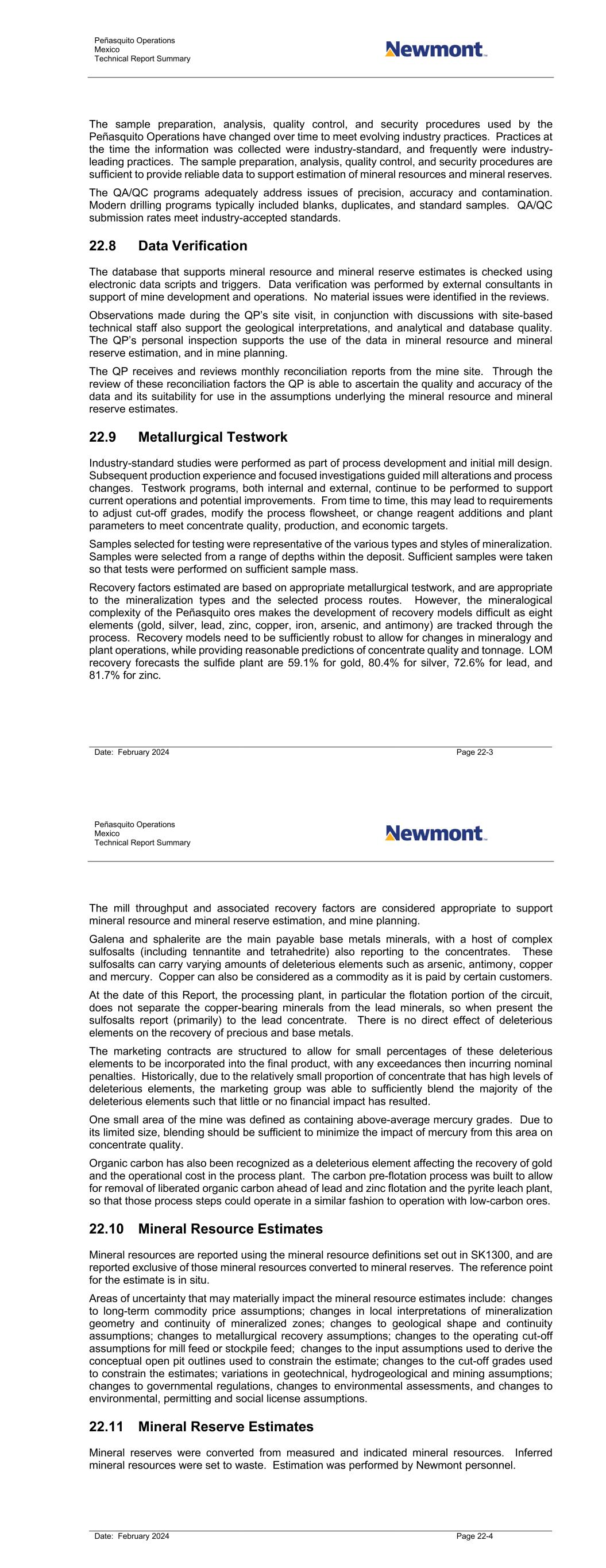 Peñasquito Operations Mexico Technical Report Summary Date: February 2024 Page 22-3 The sample preparation, analysis, quality control, and security procedures used by the Peñasquito Operations have changed over time to meet evolving industry practices. Practices at the time the information was collected were industry-standard, and frequently were industry- leading practices. The sample preparation, analysis, quality control, and security procedures are sufficient to provide reliable data to support estimation of mineral resources and mineral reserves. The QA/QC programs adequately address issues of precision, accuracy and contamination. Modern drilling programs typically included blanks, duplicates, and standard samples. QA/QC submission rates meet industry-accepted standards. 22.8 Data Verification The database that supports mineral resource and mineral reserve estimates is checked using electronic data scripts and triggers. Data verification was performed by external consultants in support of mine development and operations. No material issues were identified in the reviews. Observations made during the QP’s site visit, in conjunction with discussions with site-based technical staff also support the geological interpretations, and analytical and database quality. The QP’s personal inspection supports the use of the data in mineral resource and mineral reserve estimation, and in mine planning. The QP receives and reviews monthly reconciliation reports from the mine site. Through the review of these reconciliation factors the QP is able to ascertain the quality and accuracy of the data and its suitability for use in the assumptions underlying the mineral resource and mineral reserve estimates. 22.9 Metallurgical Testwork Industry-standard studies were performed as part of process development and initial mill design. Subsequent production experience and focused investigations guided mill alterations and process changes. Testwork programs, both internal and external, continue to be performed to support current operations and potential improvements. From time to time, this may lead to requirements to adjust cut-off grades, modify the process flowsheet, or change reagent additions and plant parameters to meet concentrate quality, production, and economic targets. Samples selected for testing were representative of the various types and styles of mineralization. Samples were selected from a range of depths within the deposit. Sufficient samples were taken so that tests were performed on sufficient sample mass. Recovery factors estimated are based on appropriate metallurgical testwork, and are appropriate to the mineralization types and the selected process routes. However, the mineralogical complexity of the Peñasquito ores makes the development of recovery models difficult as eight elements (gold, silver, lead, zinc, copper, iron, arsenic, and antimony) are tracked through the process. Recovery models need to be sufficiently robust to allow for changes in mineralogy and plant operations, while providing reasonable predictions of concentrate quality and tonnage. LOM recovery forecasts the sulfide plant are 59.1% for gold, 80.4% for silver, 72.6% for lead, and 81.7% for zinc. Peñasquito Operations Mexico Technical Report Summary Date: February 2024 Page 22-4 The mill throughput and associated recovery factors are considered appropriate to support mineral resource and mineral reserve estimation, and mine planning. Galena and sphalerite are the main payable base metals minerals, with a host of complex sulfosalts (including tennantite and tetrahedrite) also reporting to the concentrates. These sulfosalts can carry varying amounts of deleterious elements such as arsenic, antimony, copper and mercury. Copper can also be considered as a commodity as it is paid by certain customers. At the date of this Report, the processing plant, in particular the flotation portion of the circuit, does not separate the copper-bearing minerals from the lead minerals, so when present the sulfosalts report (primarily) to the lead concentrate. There is no direct effect of deleterious elements on the recovery of precious and base metals. The marketing contracts are structured to allow for small percentages of these deleterious elements to be incorporated into the final product, with any exceedances then incurring nominal penalties. Historically, due to the relatively small proportion of concentrate that has high levels of deleterious elements, the marketing group was able to sufficiently blend the majority of the deleterious elements such that little or no financial impact has resulted. One small area of the mine was defined as containing above-average mercury grades. Due to its limited size, blending should be sufficient to minimize the impact of mercury from this area on concentrate quality. Organic carbon has also been recognized as a deleterious element affecting the recovery of gold and the operational cost in the process plant. The carbon pre-flotation process was built to allow for removal of liberated organic carbon ahead of lead and zinc flotation and the pyrite leach plant, so that those process steps could operate in a similar fashion to operation with low-carbon ores. 22.10 Mineral Resource Estimates Mineral resources are reported using the mineral resource definitions set out in SK1300, and are reported exclusive of those mineral resources converted to mineral reserves. The reference point for the estimate is in situ. Areas of uncertainty that may materially impact the mineral resource estimates include: changes to long-term commodity price assumptions; changes in local interpretations of mineralization geometry and continuity of mineralized zones; changes to geological shape and continuity assumptions; changes to metallurgical recovery assumptions; changes to the operating cut-off assumptions for mill feed or stockpile feed; changes to the input assumptions used to derive the conceptual open pit ou