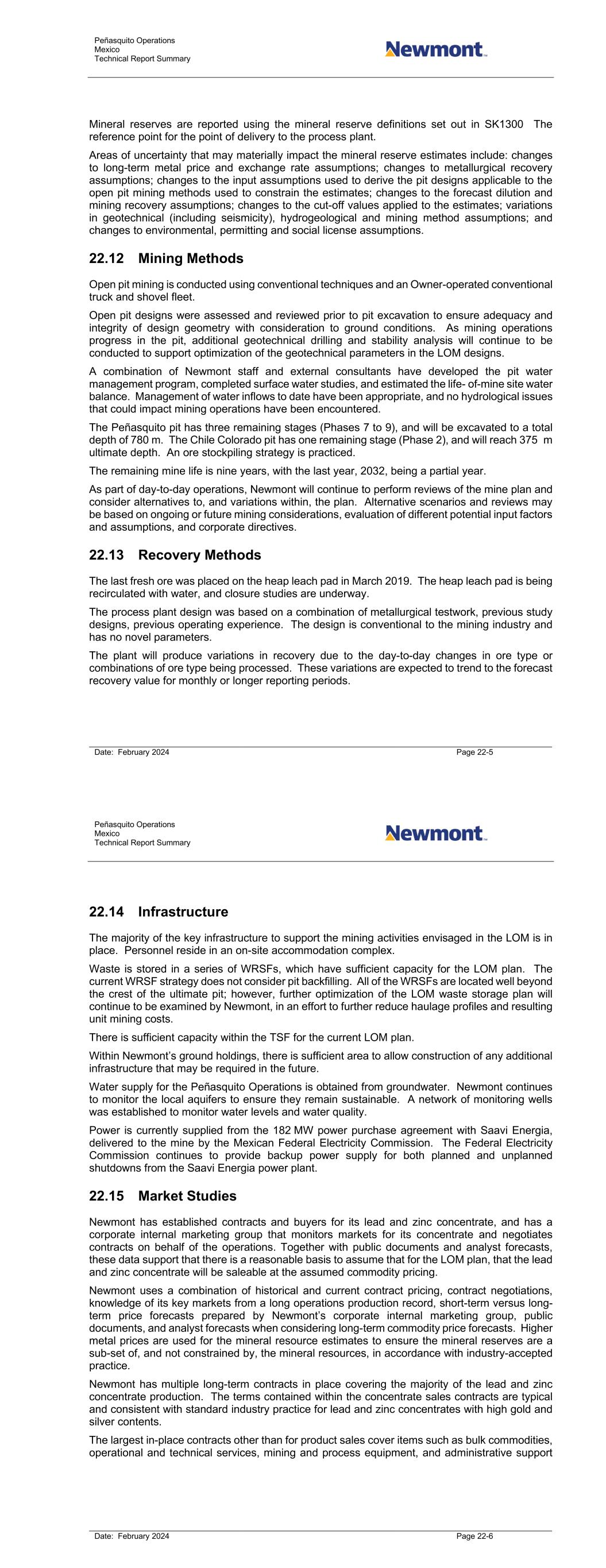 Peñasquito Operations Mexico Technical Report Summary Date: February 2024 Page 22-5 Mineral reserves are reported using the mineral reserve definitions set out in SK1300 The reference point for the point of delivery to the process plant. Areas of uncertainty that may materially impact the mineral reserve estimates include: changes to long-term metal price and exchange rate assumptions; changes to metallurgical recovery assumptions; changes to the input assumptions used to derive the pit designs applicable to the open pit mining methods used to constrain the estimates; changes to the forecast dilution and mining recovery assumptions; changes to the cut-off values applied to the estimates; variations in geotechnical (including seismicity), hydrogeological and mining method assumptions; and changes to environmental, permitting and social license assumptions. 22.12 Mining Methods Open pit mining is conducted using conventional techniques and an Owner-operated conventional truck and shovel fleet. Open pit designs were assessed and reviewed prior to pit excavation to ensure adequacy and integrity of design geometry with consideration to ground conditions. As mining operations progress in the pit, additional geotechnical drilling and stability analysis will continue to be conducted to support optimization of the geotechnical parameters in the LOM designs. A combination of Newmont staff and external consultants have developed the pit water management program, completed surface water studies, and estimated the life- of-mine site water balance. Management of water inflows to date have been appropriate, and no hydrological issues that could impact mining operations have been encountered. The Peñasquito pit has three remaining stages (Phases 7 to 9), and will be excavated to a total depth of 780 m. The Chile Colorado pit has one remaining stage (Phase 2), and will reach 375 m ultimate depth. An ore stockpiling strategy is practiced. The remaining mine life is nine years, with the last year, 2032, being a partial year. As part of day-to-day operations, Newmont will continue to perform reviews of the mine plan and consider alternatives to, and variations within, the plan. Alternative scenarios and reviews may be based on ongoing or future mining considerations, evaluation of different potential input factors and assumptions, and corporate directives. 22.13 Recovery Methods The last fresh ore was placed on the heap leach pad in March 2019. The heap leach pad is being recirculated with water, and closure studies are underway. The process plant design was based on a combination of metallurgical testwork, previous study designs, previous operating experience. The design is conventional to the mining industry and has no novel parameters. The plant will produce variations in recovery due to the day-to-day changes in ore type or combinations of ore type being processed. These variations are expected to trend to the forecast recovery value for monthly or longer reporting periods. Peñasquito Operations Mexico Technical Report Summary Date: February 2024 Page 22-6 22.14 Infrastructure The majority of the key infrastructure to support the mining activities envisaged in the LOM is in place. Personnel reside in an on-site accommodation complex. Waste is stored in a series of WRSFs, which have sufficient capacity for the LOM plan. The current WRSF strategy does not consider pit backfilling. All of the WRSFs are located well beyond the crest of the ultimate pit; however, further optimization of the LOM waste storage plan will continue to be examined by Newmont, in an effort to further reduce haulage profiles and resulting unit mining costs. There is sufficient capacity within the TSF for the current LOM plan. Within Newmont’s ground holdings, there is sufficient area to allow construction of any additional infrastructure that may be required in the future. Water supply for the Peñasquito Operations is obtained from groundwater. Newmont continues to monitor the local aquifers to ensure they remain sustainable. A network of monitoring wells was established to monitor water levels and water quality. Power is currently supplied from the 182 MW power purchase agreement with Saavi Energia, delivered to the mine by the Mexican Federal Electricity Commission. The Federal Electricity Commission continues to provide backup power supply for both planned and unplanned shutdowns from the Saavi Energia power plant. 22.15 Market Studies Newmont has established contracts and buyers for its lead and zinc concentrate, and has a corporate internal marketing group that monitors markets for its concentrate and negotiates contracts on behalf of the operations. Together with public documents and analyst forecasts, these data support that there is a reasonable basis to assume that for the LOM plan, that the lead and zinc concentrate will be saleable at the assumed commodity pricing. Newmont uses a combination of historical and current contract pricing, contract negotiations, knowledge of its key markets from a long operations production record, short-term versus long- term price forecasts prepared by Newmont’s corporate internal marketing group, public documents, and analyst forecasts when considering long-term commodity price forecasts. Higher metal prices are used for the mineral resource estimates to ensure the mineral reserves are a sub-set of, and not constrained by, the mineral resources, in accordance with industry-accepted practice. Newmont has multiple long-term contracts in place covering the majority of the lead and zinc concentrate production. The terms contained within the concentrate sales contracts are typical and consistent with standard industry practice for lead and zinc concentrates with high gold and silver contents. The largest in-place contracts other than for product sales cover items such as bulk commodities, operational and technical services, mining and process equipment, and administrative support