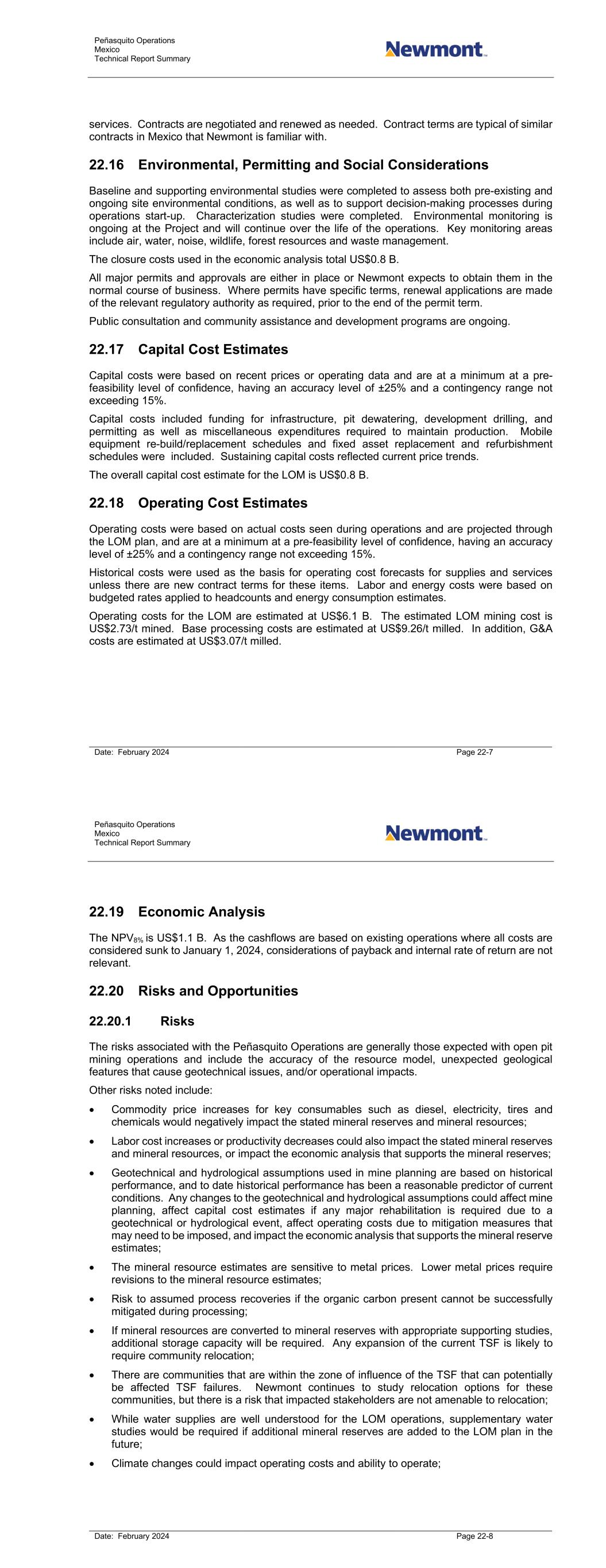 Peñasquito Operations Mexico Technical Report Summary Date: February 2024 Page 22-7 services. Contracts are negotiated and renewed as needed. Contract terms are typical of similar contracts in Mexico that Newmont is familiar with. 22.16 Environmental, Permitting and Social Considerations Baseline and supporting environmental studies were completed to assess both pre-existing and ongoing site environmental conditions, as well as to support decision-making processes during operations start-up. Characterization studies were completed. Environmental monitoring is ongoing at the Project and will continue over the life of the operations. Key monitoring areas include air, water, noise, wildlife, forest resources and waste management. The closure costs used in the economic analysis total US$0.8 B. All major permits and approvals are either in place or Newmont expects to obtain them in the normal course of business. Where permits have specific terms, renewal applications are made of the relevant regulatory authority as required, prior to the end of the permit term. Public consultation and community assistance and development programs are ongoing. 22.17 Capital Cost Estimates Capital costs were based on recent prices or operating data and are at a minimum at a pre- feasibility level of confidence, having an accuracy level of ±25% and a contingency range not exceeding 15%. Capital costs included funding for infrastructure, pit dewatering, development drilling, and permitting as well as miscellaneous expenditures required to maintain production. Mobile equipment re-build/replacement schedules and fixed asset replacement and refurbishment schedules were included. Sustaining capital costs reflected current price trends. The overall capital cost estimate for the LOM is US$0.8 B. 22.18 Operating Cost Estimates Operating costs were based on actual costs seen during operations and are projected through the LOM plan, and are at a minimum at a pre-feasibility level of confidence, having an accuracy level of ±25% and a contingency range not exceeding 15%. Historical costs were used as the basis for operating cost forecasts for supplies and services unless there are new contract terms for these items. Labor and energy costs were based on budgeted rates applied to headcounts and energy consumption estimates. Operating costs for the LOM are estimated at US$6.1 B. The estimated LOM mining cost is US$2.73/t mined. Base processing costs are estimated at US$9.26/t milled. In addition, G&A costs are estimated at US$3.07/t milled. Peñasquito Operations Mexico Technical Report Summary Date: February 2024 Page 22-8 22.19 Economic Analysis The NPV8% is US$1.1 B. As the cashflows are based on existing operations where all costs are considered sunk to January 1, 2024, considerations of payback and internal rate of return are not relevant. 22.20 Risks and Opportunities 22.20.1 Risks The risks associated with the Peñasquito Operations are generally those expected with open pit mining operations and include the accuracy of the resource model, unexpected geological features that cause geotechnical issues, and/or operational impacts. Other risks noted include: • Commodity price increases for key consumables such as diesel, electricity, tires and chemicals would negatively impact the stated mineral reserves and mineral resources; • Labor cost increases or productivity decreases could also impact the stated mineral reserves and mineral resources, or impact the economic analysis that supports the mineral reserves; • Geotechnical and hydrological assumptions used in mine planning are based on historical performance, and to date historical performance has been a reasonable predictor of current conditions. Any changes to the geotechnical and hydrological assumptions could affect mine planning, affect capital cost estimates if any major rehabilitation is required due to a geotechnical or hydrological event, affect operating costs due to mitigation measures that may need to be imposed, and impact the economic analysis that supports the mineral reserve estimates; • The mineral resource estimates are sensitive to metal prices. Lower metal prices require revisions to the mineral resource estimates; • Risk to assumed process recoveries if the organic carbon present cannot be successfully mitigated during processing; • If mineral resources are converted to mineral reserves with appropriate supporting studies, additional storage capacity will be required. Any expansion of the current TSF is likely to require community relocation; • There are communities that are within the zone of influence of the TSF that can potentially be affected TSF failures. Newmont continues to study relocation options for these communities, but there is a risk that impacted stakeholders are not amenable to relocation; • While water supplies are well understood for the LOM operations, supplementary water studies would be required if additional mineral reserves are added to the LOM plan in the future; • Climate changes could impact operating costs and ability to operate;