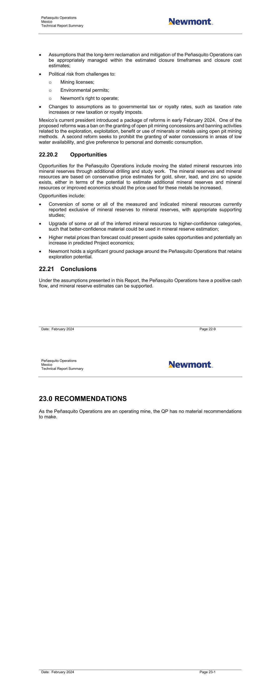 Peñasquito Operations Mexico Technical Report Summary Date: February 2024 Page 22-9 • Assumptions that the long-term reclamation and mitigation of the Peñasquito Operations can be appropriately managed within the estimated closure timeframes and closure cost estimates; • Political risk from challenges to: o Mining licenses; o Environmental permits; o Newmont’s right to operate; • Changes to assumptions as to governmental tax or royalty rates, such as taxation rate increases or new taxation or royalty imposts. Mexico’s current president introduced a package of reforms in early February 2024. One of the proposed reforms was a ban on the granting of open pit mining concessions and banning activities related to the exploration, exploitation, benefit or use of minerals or metals using open pit mining methods. A second reform seeks to prohibit the granting of water concessions in areas of low water availability, and give preference to personal and domestic consumption. 22.20.2 Opportunities Opportunities for the Peñasquito Operations include moving the stated mineral resources into mineral reserves through additional drilling and study work. The mineral reserves and mineral resources are based on conservative price estimates for gold, silver, lead, and zinc so upside exists, either in terms of the potential to estimate additional mineral reserves and mineral resources or improved economics should the price used for these metals be increased. Opportunities include: • Conversion of some or all of the measured and indicated mineral resources currently reported exclusive of mineral reserves to mineral reserves, with appropriate supporting studies; • Upgrade of some or all of the inferred mineral resources to higher-confidence categories, such that better-confidence material could be used in mineral reserve estimation; • Higher metal prices than forecast could present upside sales opportunities and potentially an increase in predicted Project economics; • Newmont holds a significant ground package around the Peñasquito Operations that retains exploration potential. 22.21 Conclusions Under the assumptions presented in this Report, the Peñasquito Operations have a positive cash flow, and mineral reserve estimates can be supported. Peñasquito Operations Mexico Technical Report Summary Date: February 2024 Page 23-1 23.0 RECOMMENDATIONS As the Peñasquito Operations are an operating mine, the QP has no material recommendations to make.