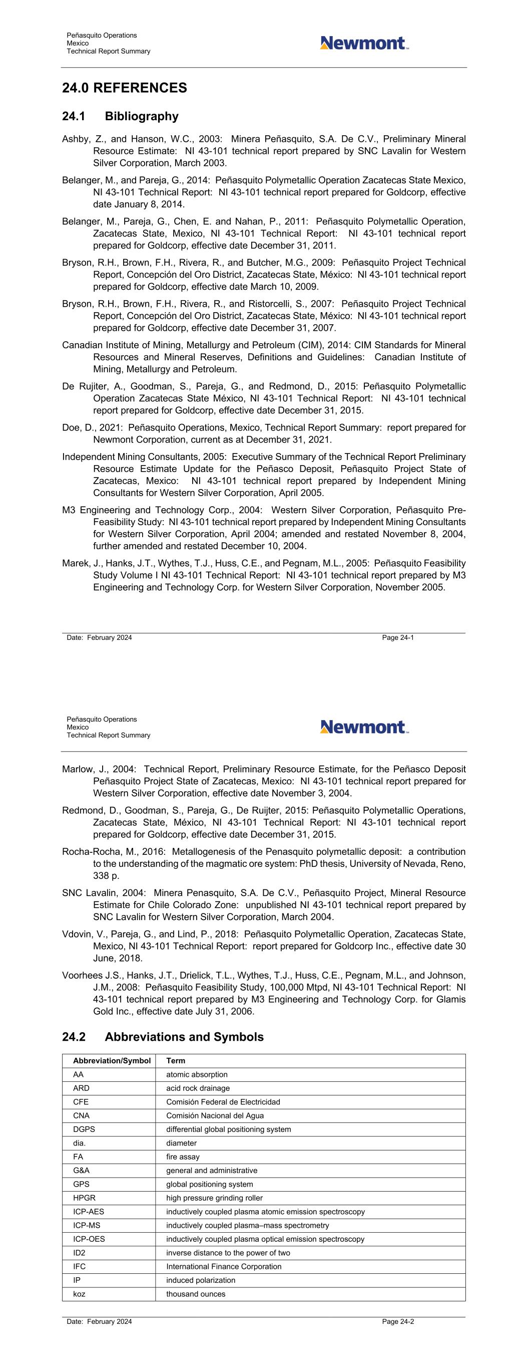 Peñasquito Operations Mexico Technical Report Summary Date: February 2024 Page 24-1 24.0 REFERENCES 24.1 Bibliography Ashby, Z., and Hanson, W.C., 2003: Minera Peñasquito, S.A. De C.V., Preliminary Mineral Resource Estimate: NI 43-101 technical report prepared by SNC Lavalin for Western Silver Corporation, March 2003. Belanger, M., and Pareja, G., 2014: Peñasquito Polymetallic Operation Zacatecas State Mexico, NI 43-101 Technical Report: NI 43-101 technical report prepared for Goldcorp, effective date January 8, 2014. Belanger, M., Pareja, G., Chen, E. and Nahan, P., 2011: Peñasquito Polymetallic Operation, Zacatecas State, Mexico, NI 43-101 Technical Report: NI 43-101 technical report prepared for Goldcorp, effective date December 31, 2011. Bryson, R.H., Brown, F.H., Rivera, R., and Butcher, M.G., 2009: Peñasquito Project Technical Report, Concepción del Oro District, Zacatecas State, México: NI 43-101 technical report prepared for Goldcorp, effective date March 10, 2009. Bryson, R.H., Brown, F.H., Rivera, R., and Ristorcelli, S., 2007: Peñasquito Project Technical Report, Concepción del Oro District, Zacatecas State, México: NI 43-101 technical report prepared for Goldcorp, effective date December 31, 2007. Canadian Institute of Mining, Metallurgy and Petroleum (CIM), 2014: CIM Standards for Mineral Resources and Mineral Reserves, Definitions and Guidelines: Canadian Institute of Mining, Metallurgy and Petroleum. De Rujiter, A., Goodman, S., Pareja, G., and Redmond, D., 2015: Peñasquito Polymetallic Operation Zacatecas State México, NI 43-101 Technical Report: NI 43-101 technical report prepared for Goldcorp, effective date December 31, 2015. Doe, D., 2021: Peñasquito Operations, Mexico, Technical Report Summary: report prepared for Newmont Corporation, current as at December 31, 2021. Independent Mining Consultants, 2005: Executive Summary of the Technical Report Preliminary Resource Estimate Update for the Peñasco Deposit, Peñasquito Project State of Zacatecas, Mexico: NI 43-101 technical report prepared by Independent Mining Consultants for Western Silver Corporation, April 2005. M3 Engineering and Technology Corp., 2004: Western Silver Corporation, Peñasquito Pre- Feasibility Study: NI 43-101 technical report prepared by Independent Mining Consultants for Western Silver Corporation, April 2004; amended and restated November 8, 2004, further amended and restated December 10, 2004. Marek, J., Hanks, J.T., Wythes, T.J., Huss, C.E., and Pegnam, M.L., 2005: Peñasquito Feasibility Study Volume I NI 43-101 Technical Report: NI 43-101 technical report prepared by M3 Engineering and Technology Corp. for Western Silver Corporation, November 2005. Peñasquito Operations Mexico Technical Report Summary Date: February 2024 Page 24-2 Marlow, J., 2004: Technical Report, Preliminary Resource Estimate, for the Peñasco Deposit Peñasquito Project State of Zacatecas, Mexico: NI 43-101 technical report prepared for Western Silver Corporation, effective date November 3, 2004. Redmond, D., Goodman, S., Pareja, G., De Ruijter, 2015: Peñasquito Polymetallic Operations, Zacatecas State, México, NI 43-101 Technical Report: NI 43-101 technical report prepared for Goldcorp, effective date December 31, 2015. Rocha-Rocha, M., 2016: Metallogenesis of the Penasquito polymetallic deposit: a contribution to the understanding of the magmatic ore system: PhD thesis, University of Nevada, Reno, 338 p. SNC Lavalin, 2004: Minera Penasquito, S.A. De C.V., Peñasquito Project, Mineral Resource Estimate for Chile Colorado Zone: unpublished NI 43-101 technical report prepared by SNC Lavalin for Western Silver Corporation, March 2004. Vdovin, V., Pareja, G., and Lind, P., 2018: Peñasquito Polymetallic Operation, Zacatecas State, Mexico, NI 43-101 Technical Report: report prepared for Goldcorp Inc., effective date 30 June, 2018. Voorhees J.S., Hanks, J.T., Drielick, T.L., Wythes, T.J., Huss, C.E., Pegnam, M.L., and Johnson, J.M., 2008: Peñasquito Feasibility Study, 100,000 Mtpd, NI 43-101 Technical Report: NI 43-101 technical report prepared by M3 Engineering and Technology Corp. for Glamis Gold Inc., effective date July 31, 2006. 24.2 Abbreviations and Symbols Abbreviation/Symbol Term AA atomic absorption ARD acid rock drainage CFE Comisión Federal de Electricidad CNA Comisión Nacional del Agua DGPS differential global positioning system dia. diameter FA fire assay G&A general and administrative GPS global positioning system HPGR high pressure grinding roller ICP-AES inductively coupled plasma atomic emission spectroscopy ICP-MS inductively coupled plasma–mass spectrometry ICP-OES inductively coupled plasma optical emission spectroscopy ID2 inverse distance to the power of two IFC International Finance Corporation IP induced polarization koz thousand ounces