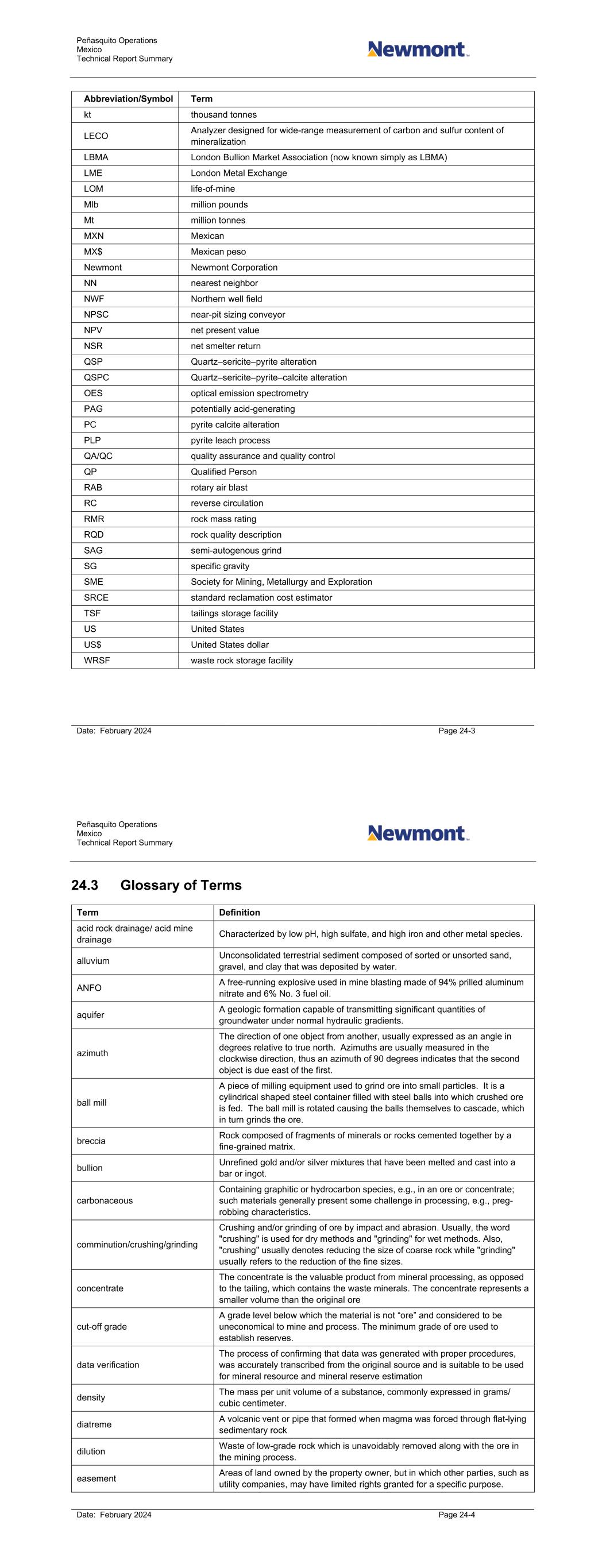 Peñasquito Operations Mexico Technical Report Summary Date: February 2024 Page 24-3 Abbreviation/Symbol Term kt thousand tonnes LECO Analyzer designed for wide-range measurement of carbon and sulfur content of mineralization LBMA London Bullion Market Association (now known simply as LBMA) LME London Metal Exchange LOM life-of-mine Mlb million pounds Mt million tonnes MXN Mexican MX$ Mexican peso Newmont Newmont Corporation NN nearest neighbor NWF Northern well field NPSC near-pit sizing conveyor NPV net present value NSR net smelter return QSP Quartz–sericite–pyrite alteration QSPC Quartz–sericite–pyrite–calcite alteration OES optical emission spectrometry PAG potentially acid-generating PC pyrite calcite alteration PLP pyrite leach process QA/QC quality assurance and quality control QP Qualified Person RAB rotary air blast RC reverse circulation RMR rock mass rating RQD rock quality description SAG semi-autogenous grind SG specific gravity SME Society for Mining, Metallurgy and Exploration SRCE standard reclamation cost estimator TSF tailings storage facility US United States US$ United States dollar WRSF waste rock storage facility Peñasquito Operations Mexico Technical Report Summary Date: February 2024 Page 24-4 24.3 Glossary of Terms Term Definition acid rock drainage/ acid mine drainage Characterized by low pH, high sulfate, and high iron and other metal species. alluvium Unconsolidated terrestrial sediment composed of sorted or unsorted sand, gravel, and clay that was deposited by water. ANFO A free-running explosive used in mine blasting made of 94% prilled aluminum nitrate and 6% No. 3 fuel oil. aquifer A geologic formation capable of transmitting significant quantities of groundwater under normal hydraulic gradients. azimuth The direction of one object from another, usually expressed as an angle in degrees relative to true north. Azimuths are usually measured in the clockwise direction, thus an azimuth of 90 degrees indicates that the second object is due east of the first. ball mill A piece of milling equipment used to grind ore into small particles. It is a cylindrical shaped steel container filled with steel balls into which crushed ore is fed. The ball mill is rotated causing the balls themselves to cascade, which in turn grinds the ore. breccia Rock composed of fragments of minerals or rocks cemented together by a fine-grained matrix. bullion Unrefined gold and/or silver mixtures that have been melted and cast into a bar or ingot. carbonaceous Containing graphitic or hydrocarbon species, e.g., in an ore or concentrate; such materials generally present some challenge in processing, e.g., preg- robbing characteristics. comminution/crushing/grinding Crushing and/or grinding of ore by impact and abrasion. Usually, the word "crushing" is used for dry methods and "grinding" for wet methods. Also, "crushing" usually denotes reducing the size of coarse rock while "grinding" usually refers to the reduction of the fine sizes. concentrate The concentrate is the valuable product from mineral processing, as opposed to the tailing, which contains the waste minerals. The concentrate represents a smaller volume than the original ore cut-off grade A grade level below which the material is not “ore” and considered to be uneconomical to mine and process. The minimum grade of ore used to establish reserves. data verification The process of confirming that data was generated with proper procedures, was accurately transcribed from the original source and is suitable to be used for mineral resource and mineral reserve estimation density The mass per unit volume of a substance, commonly expressed in grams/ cubic centimeter. diatreme A volcanic vent or pipe that formed when magma was forced through flat-lying sedimentary rock dilution Waste of low-grade rock which is unavoidably removed along with the ore in the mining process. easement Areas of land owned by the property owner, but in which other parties, such as utility companies, may have limited rights granted for a specific purpose.