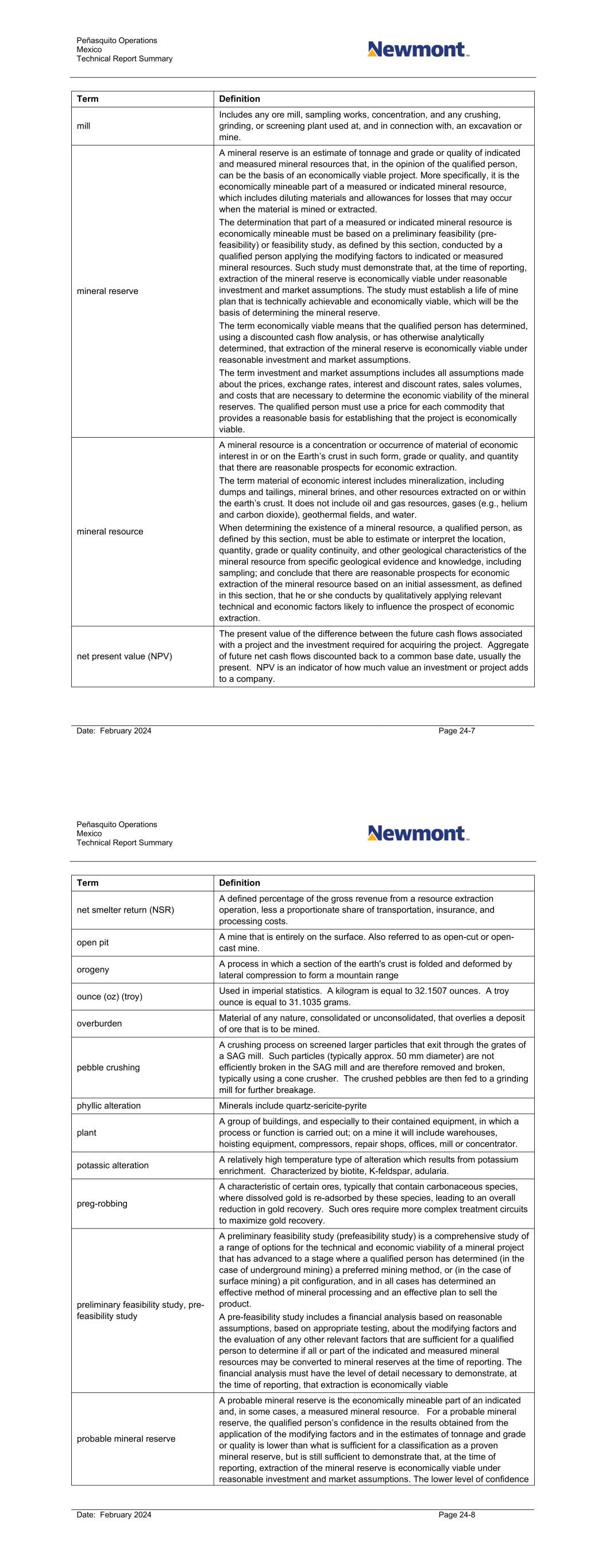 Peñasquito Operations Mexico Technical Report Summary Date: February 2024 Page 24-7 Term Definition mill Includes any ore mill, sampling works, concentration, and any crushing, grinding, or screening plant used at, and in connection with, an excavation or mine. mineral reserve A mineral reserve is an estimate of tonnage and grade or quality of indicated and measured mineral resources that, in the opinion of the qualified person, can be the basis of an economically viable project. More specifically, it is the economically mineable part of a measured or indicated mineral resource, which includes diluting materials and allowances for losses that may occur when the material is mined or extracted. The determination that part of a measured or indicated mineral resource is economically mineable must be based on a preliminary feasibility (pre- feasibility) or feasibility study, as defined by this section, conducted by a qualified person applying the modifying factors to indicated or measured mineral resources. Such study must demonstrate that, at the time of reporting, extraction of the mineral reserve is economically viable under reasonable investment and market assumptions. The study must establish a life of mine plan that is technically achievable and economically viable, which will be the basis of determining the mineral reserve. The term economically viable means that the qualified person has determined, using a discounted cash flow analysis, or has otherwise analytically determined, that extraction of the mineral reserve is economically viable under reasonable investment and market assumptions. The term investment and market assumptions includes all assumptions made about the prices, exchange rates, interest and discount rates, sales volumes, and costs that are necessary to determine the economic viability of the mineral reserves. The qualified person must use a price for each commodity that provides a reasonable basis for establishing that the project is economically viable. mineral resource A mineral resource is a concentration or occurrence of material of economic interest in or on the Earth’s crust in such form, grade or quality, and quantity that there are reasonable prospects for economic extraction. The term material of economic interest includes mineralization, including dumps and tailings, mineral brines, and other resources extracted on or within the earth’s crust. It does not include oil and gas resources, gases (e.g., helium and carbon dioxide), geothermal fields, and water. When determining the existence of a mineral resource, a qualified person, as defined by this section, must be able to estimate or interpret the location, quantity, grade or quality continuity, and other geological characteristics of the mineral resource from specific geological evidence and knowledge, including sampling; and conclude that there are reasonable prospects for economic extraction of the mineral resource based on an initial assessment, as defined in this section, that he or she conducts by qualitatively applying relevant technical and economic factors likely to influence the prospect of economic extraction. net present value (NPV) The present value of the difference between the future cash flows associated with a project and the investment required for acquiring the project. Aggregate of future net cash flows discounted back to a common base date, usually the present. NPV is an indicator of how much value an investment or project adds to a company. Peñasquito Operations Mexico Technical Report Summary Date: February 2024 Page 24-8 Term Definition net smelter return (NSR) A defined percentage of the gross revenue from a resource extraction operation, less a proportionate share of transportation, insurance, and processing costs. open pit A mine that is entirely on the surface. Also referred to as open-cut or open- cast mine. orogeny A process in which a section of the earth's crust is folded and deformed by lateral compression to form a mountain range ounce (oz) (troy) Used in imperial statistics. A kilogram is equal to 32.1507 ounces. A troy ounce is equal to 31.1035 grams. overburden Material of any nature, consolidated or unconsolidated, that overlies a deposit of ore that is to be mined. pebble crushing A crushing process on screened larger particles that exit through the grates of a SAG mill. Such particles (typically approx. 50 mm diameter) are not efficiently broken in the SAG mill and are therefore removed and broken, typically using a cone crusher. The crushed pebbles are then fed to a grinding mill for further breakage. phyllic alteration Minerals include quartz-sericite-pyrite plant A group of buildings, and especially to their contained equipment, in which a process or function is carried out; on a mine it will include warehouses, hoisting equipment, compressors, repair shops, offices, mill or concentrator. potassic alteration A relatively high temperature type of alteration which results from potassium enrichment. Characterized by biotite, K-feldspar, adularia. preg-robbing A characteristic of certain ores, typically that contain carbonaceous species, where dissolved gold is re-adsorbed by these species, leading to an overall reduction in gold recovery. Such ores require more complex treatment circuits to maximize gold recovery. preliminary feasibility study, pre- feasibility study A preliminary feasibility study (prefeasibility study) is a comprehensive study of a range of options for the technical and economic viability of a mineral project that has advanced to a stage where a qualified person has determined (in the case of underground mining) a preferred mining method, or (in the case of surface mining) a pit configuration, and in all cases has determined an effective method of mineral processing and an effective plan to sell the product. A pre-feasibility study includes a financial analysis based on reasonable assumptions, based on appropriate testing, about the modifying fa
