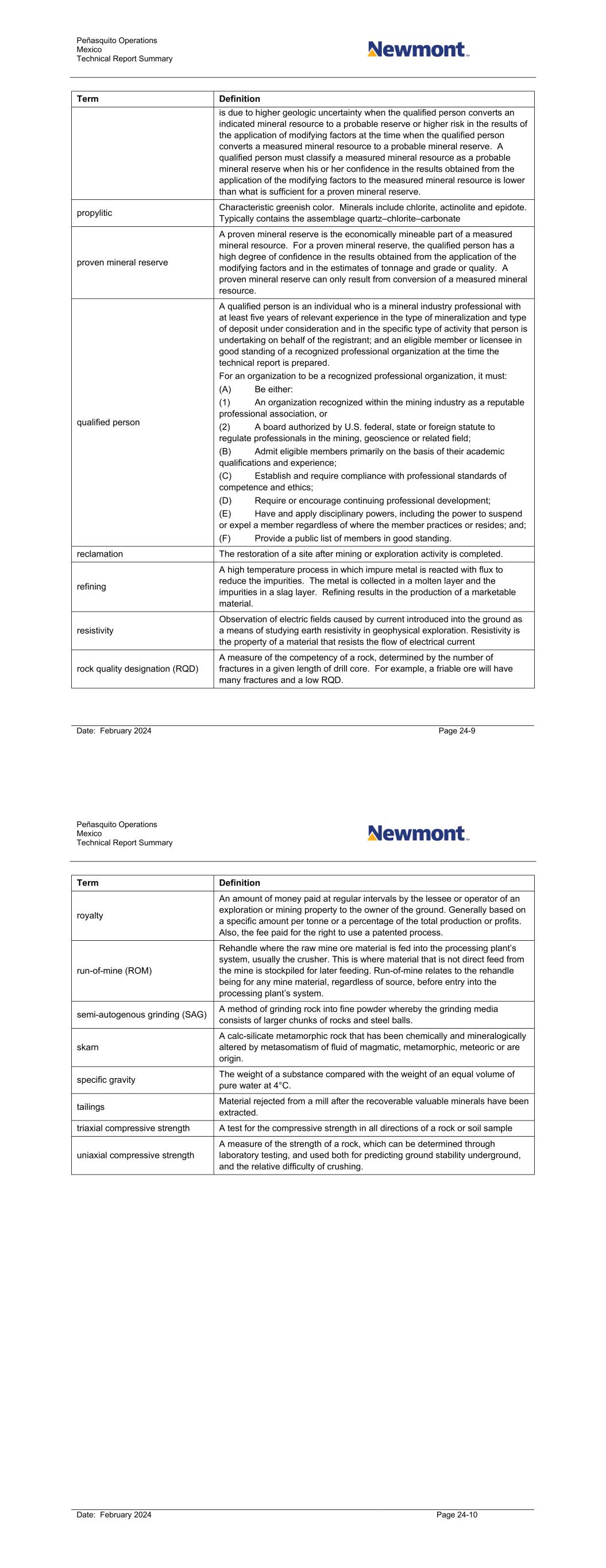 Peñasquito Operations Mexico Technical Report Summary Date: February 2024 Page 24-9 Term Definition is due to higher geologic uncertainty when the qualified person converts an indicated mineral resource to a probable reserve or higher risk in the results of the application of modifying factors at the time when the qualified person converts a measured mineral resource to a probable mineral reserve. A qualified person must classify a measured mineral resource as a probable mineral reserve when his or her confidence in the results obtained from the application of the modifying factors to the measured mineral resource is lower than what is sufficient for a proven mineral reserve. propylitic Characteristic greenish color. Minerals include chlorite, actinolite and epidote. Typically contains the assemblage quartz–chlorite–carbonate proven mineral reserve A proven mineral reserve is the economically mineable part of a measured mineral resource. For a proven mineral reserve, the qualified person has a high degree of confidence in the results obtained from the application of the modifying factors and in the estimates of tonnage and grade or quality. A proven mineral reserve can only result from conversion of a measured mineral resource. qualified person A qualified person is an individual who is a mineral industry professional with at least five years of relevant experience in the type of mineralization and type of deposit under consideration and in the specific type of activity that person is undertaking on behalf of the registrant; and an eligible member or licensee in good standing of a recognized professional organization at the time the technical report is prepared. For an organization to be a recognized professional organization, it must: (A) Be either: (1) An organization recognized within the mining industry as a reputable professional association, or (2) A board authorized by U.S. federal, state or foreign statute to regulate professionals in the mining, geoscience or related field; (B) Admit eligible members primarily on the basis of their academic qualifications and experience; (C) Establish and require compliance with professional standards of competence and ethics; (D) Require or encourage continuing professional development; (E) Have and apply disciplinary powers, including the power to suspend or expel a member regardless of where the member practices or resides; and; (F) Provide a public list of members in good standing. reclamation The restoration of a site after mining or exploration activity is completed. refining A high temperature process in which impure metal is reacted with flux to reduce the impurities. The metal is collected in a molten layer and the impurities in a slag layer. Refining results in the production of a marketable material. resistivity Observation of electric fields caused by current introduced into the ground as a means of studying earth resistivity in geophysical exploration. Resistivity is the property of a material that resists the flow of electrical current rock quality designation (RQD) A measure of the competency of a rock, determined by the number of fractures in a given length of drill core. For example, a friable ore will have many fractures and a low RQD. Peñasquito Operations Mexico Technical Report Summary Date: February 2024 Page 24-10 Term Definition royalty An amount of money paid at regular intervals by the lessee or operator of an exploration or mining property to the owner of the ground. Generally based on a specific amount per tonne or a percentage of the total production or profits. Also, the fee paid for the right to use a patented process. run-of-mine (ROM) Rehandle where the raw mine ore material is fed into the processing plant’s system, usually the crusher. This is where material that is not direct feed from the mine is stockpiled for later feeding. Run-of-mine relates to the rehandle being for any mine material, regardless of source, before entry into the processing plant’s system. semi-autogenous grinding (SAG) A method of grinding rock into fine powder whereby the grinding media consists of larger chunks of rocks and steel balls. skarn A calc-silicate metamorphic rock that has been chemically and mineralogically altered by metasomatism of fluid of magmatic, metamorphic, meteoric or are origin. specific gravity The weight of a substance compared with the weight of an equal volume of pure water at 4°C. tailings Material rejected from a mill after the recoverable valuable minerals have been extracted. triaxial compressive strength A test for the compressive strength in all directions of a rock or soil sample uniaxial compressive strength A measure of the strength of a rock, which can be determined through laboratory testing, and used both for predicting ground stability underground, and the relative difficulty of crushing.