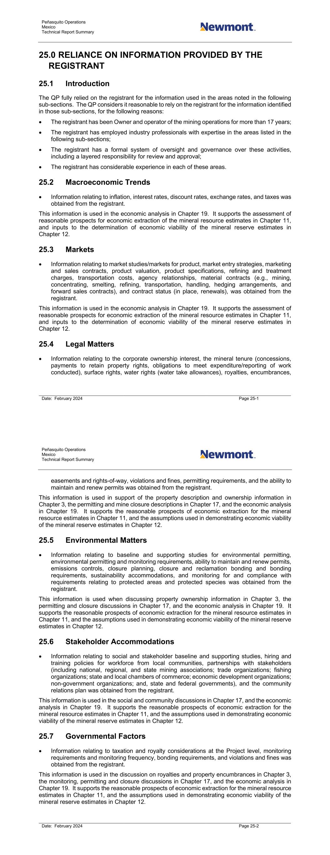 Peñasquito Operations Mexico Technical Report Summary Date: February 2024 Page 25-1 25.0 RELIANCE ON INFORMATION PROVIDED BY THE REGISTRANT 25.1 Introduction The QP fully relied on the registrant for the information used in the areas noted in the following sub-sections. The QP considers it reasonable to rely on the registrant for the information identified in those sub-sections, for the following reasons: • The registrant has been Owner and operator of the mining operations for more than 17 years; • The registrant has employed industry professionals with expertise in the areas listed in the following sub-sections; • The registrant has a formal system of oversight and governance over these activities, including a layered responsibility for review and approval; • The registrant has considerable experience in each of these areas. 25.2 Macroeconomic Trends • Information relating to inflation, interest rates, discount rates, exchange rates, and taxes was obtained from the registrant. This information is used in the economic analysis in Chapter 19. It supports the assessment of reasonable prospects for economic extraction of the mineral resource estimates in Chapter 11, and inputs to the determination of economic viability of the mineral reserve estimates in Chapter 12. 25.3 Markets • Information relating to market studies/markets for product, market entry strategies, marketing and sales contracts, product valuation, product specifications, refining and treatment charges, transportation costs, agency relationships, material contracts (e.g., mining, concentrating, smelting, refining, transportation, handling, hedging arrangements, and forward sales contracts), and contract status (in place, renewals), was obtained from the registrant. This information is used in the economic analysis in Chapter 19. It supports the assessment of reasonable prospects for economic extraction of the mineral resource estimates in Chapter 11, and inputs to the determination of economic viability of the mineral reserve estimates in Chapter 12. 25.4 Legal Matters • Information relating to the corporate ownership interest, the mineral tenure (concessions, payments to retain property rights, obligations to meet expenditure/reporting of work conducted), surface rights, water rights (water take allowances), royalties, encumbrances, Peñasquito Operations Mexico Technical Report Summary Date: February 2024 Page 25-2 easements and rights-of-way, violations and fines, permitting requirements, and the ability to maintain and renew permits was obtained from the registrant. This information is used in support of the property description and ownership information in Chapter 3, the permitting and mine closure descriptions in Chapter 17, and the economic analysis in Chapter 19. It supports the reasonable prospects of economic extraction for the mineral resource estimates in Chapter 11, and the assumptions used in demonstrating economic viability of the mineral reserve estimates in Chapter 12. 25.5 Environmental Matters • Information relating to baseline and supporting studies for environmental permitting, environmental permitting and monitoring requirements, ability to maintain and renew permits, emissions controls, closure planning, closure and reclamation bonding and bonding requirements, sustainability accommodations, and monitoring for and compliance with requirements relating to protected areas and protected species was obtained from the registrant. This information is used when discussing property ownership information in Chapter 3, the permitting and closure discussions in Chapter 17, and the economic analysis in Chapter 19. It supports the reasonable prospects of economic extraction for the mineral resource estimates in Chapter 11, and the assumptions used in demonstrating economic viability of the mineral reserve estimates in Chapter 12. 25.6 Stakeholder Accommodations • Information relating to social and stakeholder baseline and supporting studies, hiring and training policies for workforce from local communities, partnerships with stakeholders (including national, regional, and state mining associations; trade organizations; fishing organizations; state and local chambers of commerce; economic development organizations; non-government organizations; and, state and federal governments), and the community relations plan was obtained from the registrant. This information is used in the social and community discussions in Chapter 17, and the economic analysis in Chapter 19. It supports the reasonable prospects of economic extraction for the mineral resource estimates in Chapter 11, and the assumptions used in demonstrating economic viability of the mineral reserve estimates in Chapter 12. 25.7 Governmental Factors • Information relating to taxation and royalty considerations at the Project level, monitoring requirements and monitoring frequency, bonding requirements, and violations and fines was obtained from the registrant. This information is used in the discussion on royalties and property encumbrances in Chapter 3, the monitoring, permitting and closure discussions in Chapter 17, and the economic analysis in Chapter 19. It supports the reasonable prospects of economic extraction for the mineral resource estimates in Chapter 11, and the assumptions used in demonstrating economic viability of the mineral reserve estimates in Chapter 12.