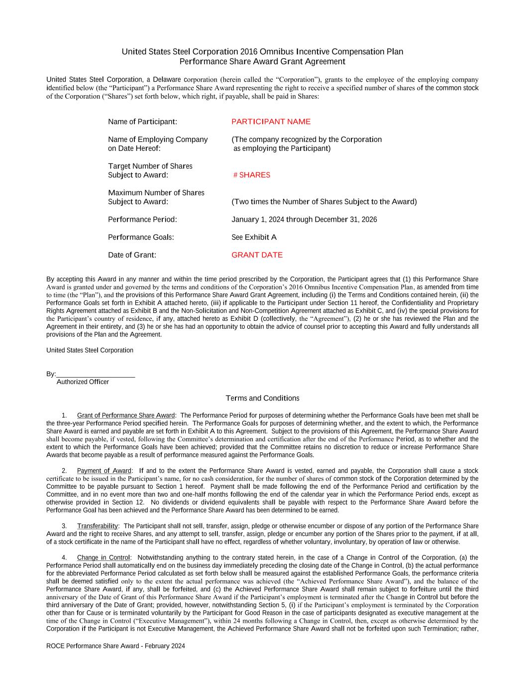 ROCE Performance Share Award - February 2024 United States Steel Corporation 2016 Omnibus Incentive Compensation Plan Performance Share Award Grant Agreement United States Steel Corporation, a Delaware corporation (herein called the “Corporation”), grants to the employee of the employing company identified below (the “Participant”) a Performance Share Award representing the right to receive a specified number of shares of the common stock of the Corporation (“Shares”) set forth below, which right, if payable, shall be paid in Shares: Name of Participant: PARTICIPANT NAME Name of Employing Company (The company recognized by the Corporation on Date Hereof: as employing the Participant) Target Number of Shares Subject to Award: # SHARES Maximum Number of Shares Subject to Award: (Two times the Number of Shares Subject to the Award) Performance Period: January 1, 2024 through December 31, 2026 Performance Goals: See Exhibit A Date of Grant: GRANT DATE By accepting this Award in any manner and within the time period prescribed by the Corporation, the Participant agrees that (1) this Performance Share Award is granted under and governed by the terms and conditions of the Corporation’s 2016 Omnibus Incentive Compensation Plan, as amended from time to time (the “Plan”), and the provisions of this Performance Share Award Grant Agreement, including (i) the Terms and Conditions contained herein, (ii) the Performance Goals set forth in Exhibit A attached hereto, (iii) if applicable to the Participant under Section 11 hereof, the Confidentiality and Proprietary Rights Agreement attached as Exhibit B and the Non-Solicitation and Non-Competition Agreement attached as Exhibit C, and (iv) the special provisions for the Participant’s country of residence, if any, attached hereto as Exhibit D (collectively, the “Agreement”), (2) he or she has reviewed the Plan and the Agreement in their entirety, and (3) he or she has had an opportunity to obtain the advice of counsel prior to accepting this Award and fully understands all provisions of the Plan and the Agreement. United States Steel Corporation By:_______________________ Authorized Officer Terms and Conditions 1. Grant of Performance Share Award: The Performance Period for purposes of determining whether the Performance Goals have been met shall be the three-year Performance Period specified herein. The Performance Goals for purposes of determining whether, and the extent to which, the Performance Share Award is earned and payable are set forth in Exhibit A to this Agreement. Subject to the provisions of this Agreement, the Performance Share Award shall become payable, if vested, following the Committee’s determination and certification after the end of the Performance Period, as to whether and the extent to which the Performance Goals have been achieved; provided that the Committee retains no discretion to reduce or increase Performance Share Awards that become payable as a result of performance measured against the Performance Goals. 2. Payment of Award: If and to the extent the Performance Share Award is vested, earned and payable, the Corporation shall cause a stock certificate to be issued in the Participant’s name, for no cash consideration, for the number of shares of common stock of the Corporation determined by the Committee to be payable pursuant to Section 1 hereof. Payment shall be made following the end of the Performance Period and certification by the Committee, and in no event more than two and one-half months following the end of the calendar year in which the Performance Period ends, except as otherwise provided in Section 12. No dividends or dividend equivalents shall be payable with respect to the Performance Share Award before the Performance Goal has been achieved and the Performance Share Award has been determined to be earned. 3. Transferability: The Participant shall not sell, transfer, assign, pledge or otherwise encumber or dispose of any portion of the Performance Share Award and the right to receive Shares, and any attempt to sell, transfer, assign, pledge or encumber any portion of the Shares prior to the payment, if at all, of a stock certificate in the name of the Participant shall have no effect, regardless of whether voluntary, involuntary, by operation of law or otherwise. 4. Change in Control: Notwithstanding anything to the contrary stated herein, in the case of a Change in Control of the Corporation, (a) the Performance Period shall automatically end on the business day immediately preceding the closing date of the Change in Control, (b) the actual performance for the abbreviated Performance Period calculated as set forth below shall be measured against the established Performance Goals, the performance criteria shall be deemed satisfied only to the extent the actual performance was achieved (the “Achieved Performance Share Award”), and the balance of the Performance Share Award, if any, shall be forfeited, and (c) the Achieved Performance Share Award shall remain subject to forfeiture until the third anniversary of the Date of Grant of this Performance Share Award if the Participant’s employment is terminated after the Change in Control but before the third anniversary of the Date of Grant; provided, however, notwithstanding Section 5, (i) if the Participant’s employment is terminated by the Corporation other than for Cause or is terminated voluntarily by the Participant for Good Reason in the case of participants designated as executive management at the time of the Change in Control (“Executive Management”), within 24 months following a Change in Control, then, except as otherwise determined by the Corporation if the Participant is not Executive Management, the Achieved Performance Share Award shall not be forfeited upon such Termination; rather,