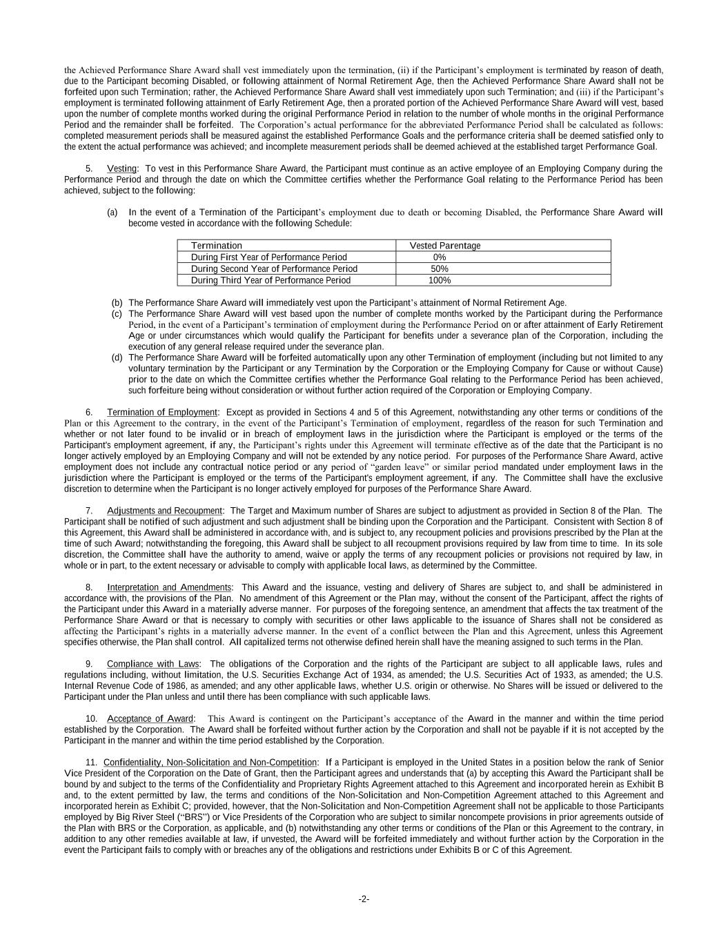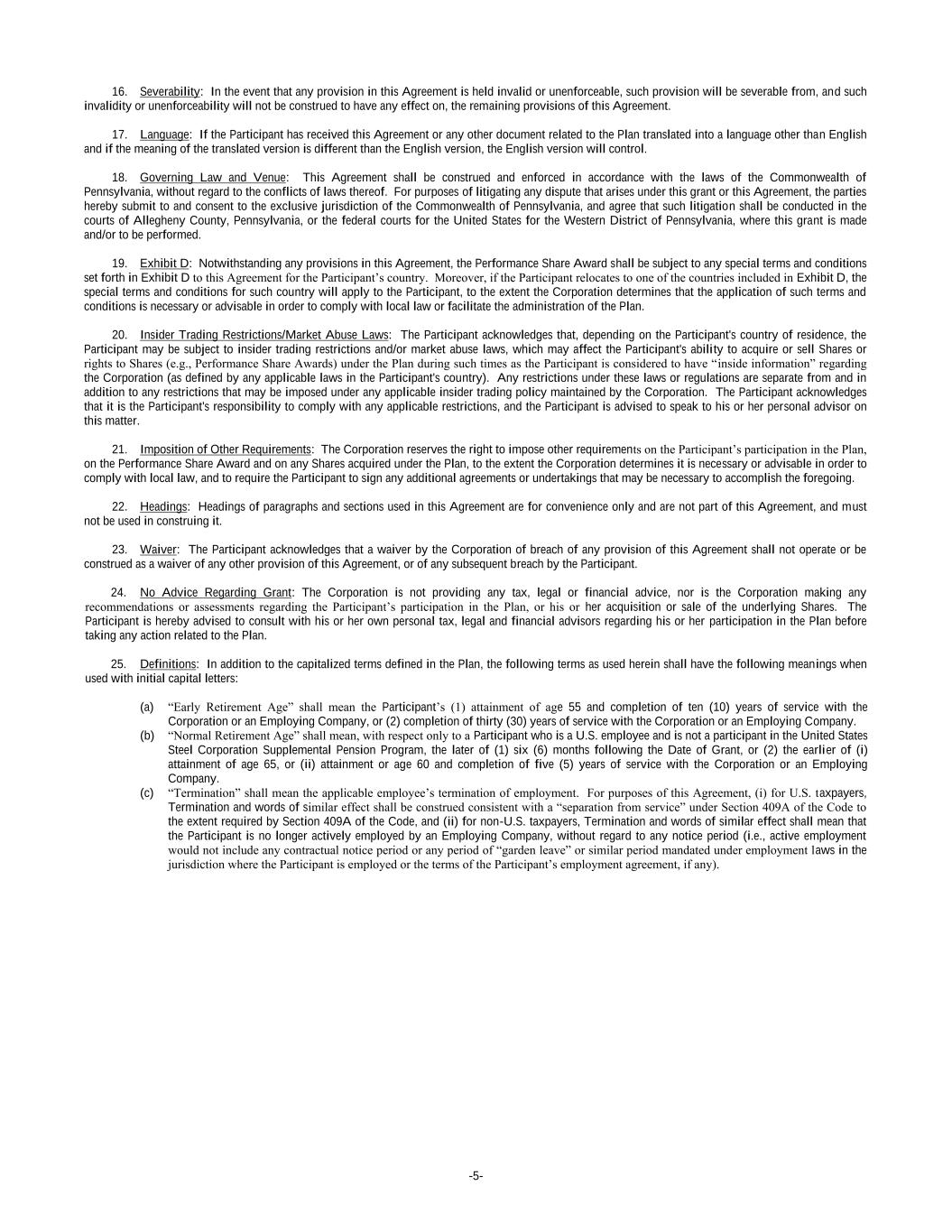 -5- 16. Severability: In the event that any provision in this Agreement is held invalid or unenforceable, such provision will be severable from, and such invalidity or unenforceability will not be construed to have any effect on, the remaining provisions of this Agreement. 17. Language: If the Participant has received this Agreement or any other document related to the Plan translated into a language other than English and if the meaning of the translated version is different than the English version, the English version will control. 18. Governing Law and Venue: This Agreement shall be construed and enforced in accordance with the laws of the Commonwealth of Pennsylvania, without regard to the conflicts of laws thereof. For purposes of litigating any dispute that arises under this grant or this Agreement, the parties hereby submit to and consent to the exclusive jurisdiction of the Commonwealth of Pennsylvania, and agree that such litigation shall be conducted in the courts of Allegheny County, Pennsylvania, or the federal courts for the United States for the Western District of Pennsylvania, where this grant is made and/or to be performed. 19. Exhibit D: Notwithstanding any provisions in this Agreement, the Performance Share Award shall be subject to any special terms and conditions set forth in Exhibit D to this Agreement for the Participant’s country. Moreover, if the Participant relocates to one of the countries included in Exhibit D, the special terms and conditions for such country will apply to the Participant, to the extent the Corporation determines that the application of such terms and conditions is necessary or advisable in order to comply with local law or facilitate the administration of the Plan. 20. Insider Trading Restrictions/Market Abuse Laws: The Participant acknowledges that, depending on the Participant's country of residence, the Participant may be subject to insider trading restrictions and/or market abuse laws, which may affect the Participant's ability to acquire or sell Shares or rights to Shares (e.g., Performance Share Awards) under the Plan during such times as the Participant is considered to have “inside information” regarding the Corporation (as defined by any applicable laws in the Participant's country). Any restrictions under these laws or regulations are separate from and in addition to any restrictions that may be imposed under any applicable insider trading policy maintained by the Corporation. The Participant acknowledges that it is the Participant's responsibility to comply with any applicable restrictions, and the Participant is advised to speak to his or her personal advisor on this matter. 21. Imposition of Other Requirements: The Corporation reserves the right to impose other requirements on the Participant’s participation in the Plan, on the Performance Share Award and on any Shares acquired under the Plan, to the extent the Corporation determines it is necessary or advisable in order to comply with local law, and to require the Participant to sign any additional agreements or undertakings that may be necessary to accomplish the foregoing. 22. Headings: Headings of paragraphs and sections used in this Agreement are for convenience only and are not part of this Agreement, and must not be used in construing it. 23. Waiver: The Participant acknowledges that a waiver by the Corporation of breach of any provision of this Agreement shall not operate or be construed as a waiver of any other provision of this Agreement, or of any subsequent breach by the Participant. 24. No Advice Regarding Grant: The Corporation is not providing any tax, legal or financial advice, nor is the Corporation making any recommendations or assessments regarding the Participant’s participation in the Plan, or his or her acquisition or sale of the underlying Shares. The Participant is hereby advised to consult with his or her own personal tax, legal and financial advisors regarding his or her participation in the Plan before taking any action related to the Plan. 25. Definitions: In addition to the capitalized terms defined in the Plan, the following terms as used herein shall have the following meanings when used with initial capital letters: (a) “Early Retirement Age” shall mean the Participant’s (1) attainment of age 55 and completion of ten (10) years of service with the Corporation or an Employing Company, or (2) completion of thirty (30) years of service with the Corporation or an Employing Company. (b) “Normal Retirement Age” shall mean, with respect only to a Participant who is a U.S. employee and is not a participant in the United States Steel Corporation Supplemental Pension Program, the later of (1) six (6) months following the Date of Grant, or (2) the earlier of (i) attainment of age 65, or (ii) attainment or age 60 and completion of five (5) years of service with the Corporation or an Employing Company. (c) “Termination” shall mean the applicable employee’s termination of employment. For purposes of this Agreement, (i) for U.S. taxpayers, Termination and words of similar effect shall be construed consistent with a “separation from service” under Section 409A of the Code to the extent required by Section 409A of the Code, and (ii) for non-U.S. taxpayers, Termination and words of similar effect shall mean that the Participant is no longer actively employed by an Employing Company, without regard to any notice period (i.e., active employment would not include any contractual notice period or any period of “garden leave” or similar period mandated under employment laws in the jurisdiction where the Participant is employed or the terms of the Participant’s employment agreement, if any).